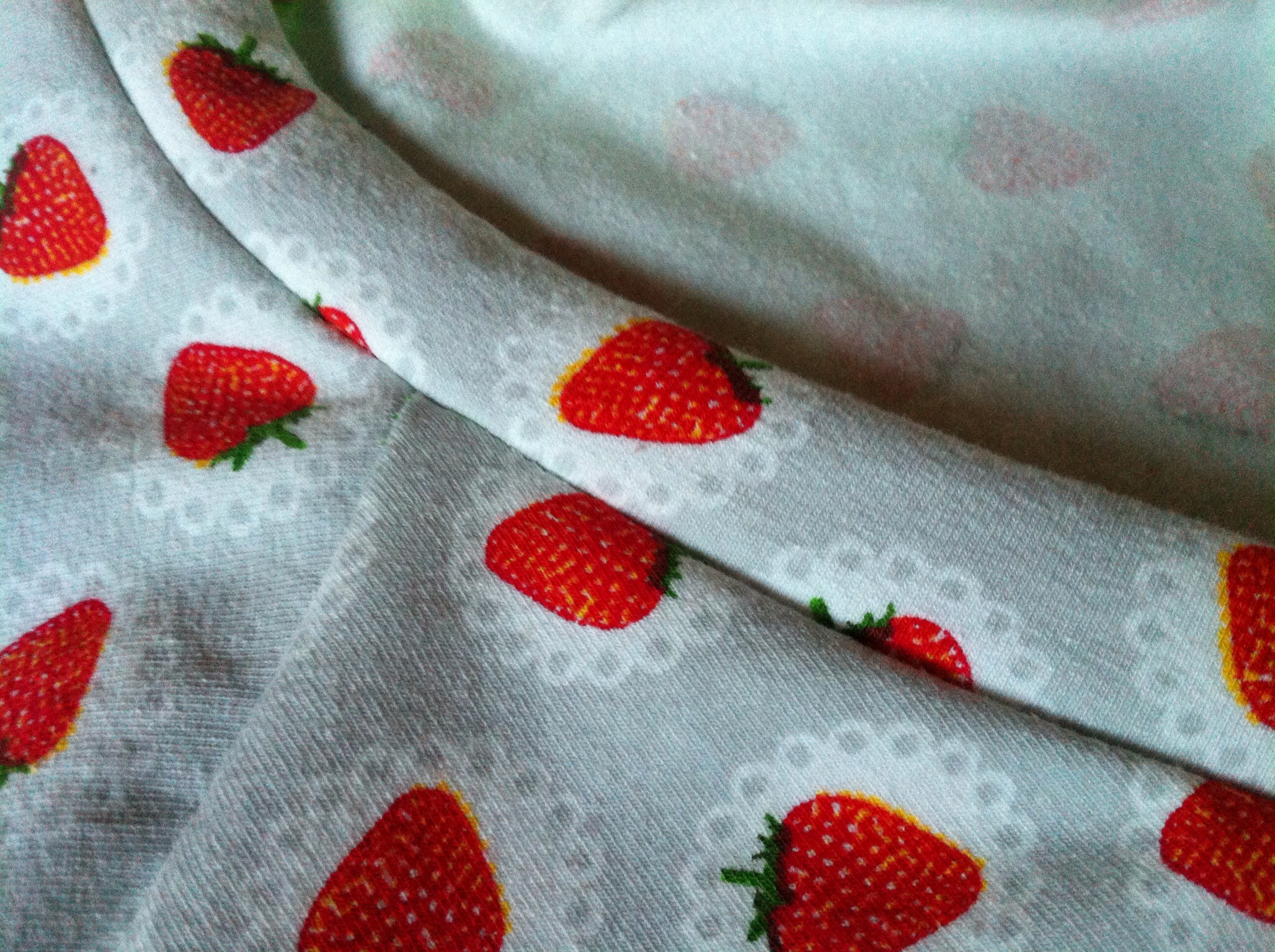 Bei Michas gab es letztens wieder mal Erdbeerjersey. Und genauso wie Kirschen muss man sowas natürlich (nahezu unabhängig vom Meterpreis) kaufen. Schluchz. Aber gut, der war jetzt gar nicht so teuer, dafür ist er ziemlich fest und hat eine leicht rauhe Oberfläche. Ich mag ihn trotzdem.