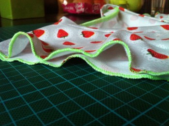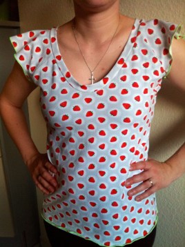 Zunächst lag er aber im Regal herum und suchte noch nach seiner besseren Hälfte fürs Leben: einem schönen Schnittmuster. Und heute Abend kam mir die Idee: Rangafly passt doch perfekt dazu. Wie praktisch, die richtige Größe hatte ich mir schonmal abgepaust, also konnte ich direkt das schöne Stöffchen anschneiden. Ratzifatzi Vorderteil, Rückteil und zwei kurze Fliflyflatterärmelchen, alles zusammengenäht und anprobiert. Passt ja wie angegossen. Dann durfte die Ovi wieder mal zeigen, was sie für schöne Rollsäume kann. Die Ärmelchen und auch der Bauchabschluss unten wurden echt mega flott umsäumt. Und so schön meine neon(grüne) Naht mir auch immer wieder gefällt, ist der Begriff trotzdem einfach kein schönes Schlagwort für den Blog *augenroll*. Egal. Und was mache ich an den Hals? Jetzt da so ein derbes Bündchen ran, sieht sicher nicht schön sommerfrisch aus. Also schnell noch einen Jerseystreifen aus dem Strawberrycreamjersey gebastelt und angenäht. Ich glaube ich habe einen Rekord aufgestellt. Es waren wohl nicht mal 45 Minuten insgesamt. Ein echtes Flitze-Rangafly- Shirt. Und ich bin verliebt.