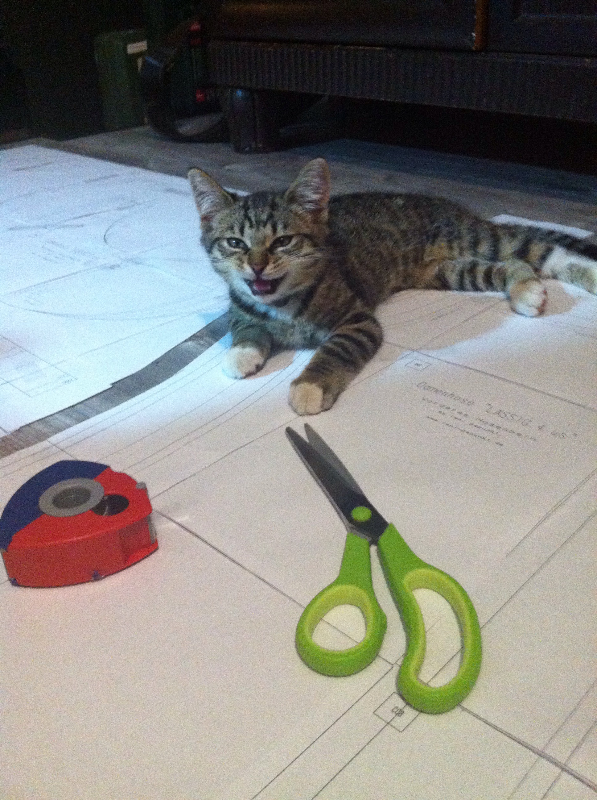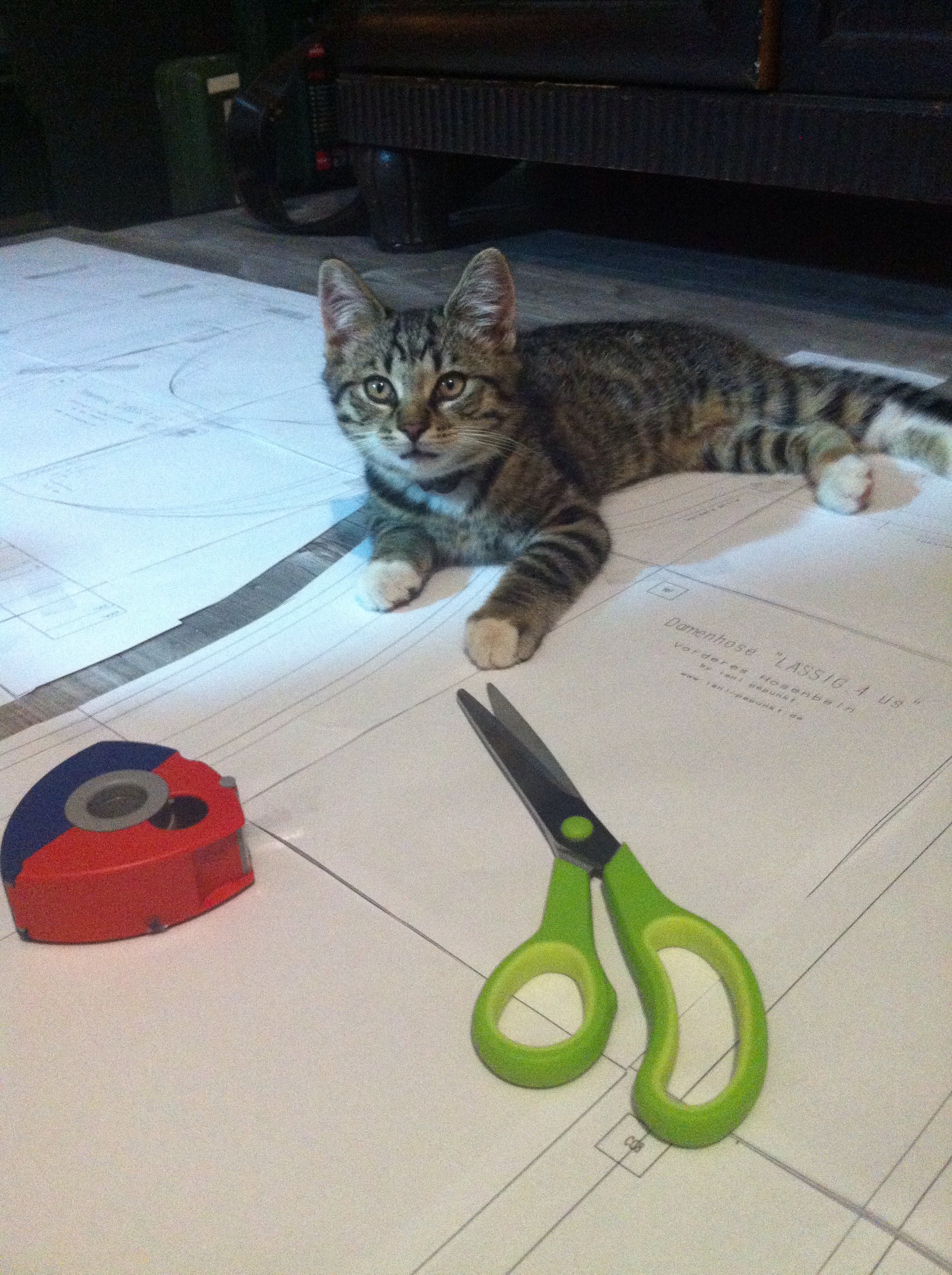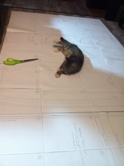 Es ist ja eh immer schon nicht so leicht, große Schnittmuster ordentlich zusammen zu kleben. Ich weiß ja nicht, wie es euch geht, aber für mich ist das immer eine eher müßige Aufgabe. Nach unserem Umzug haben wir zwar nun endlich richtig Platz (zumindest auf dem Fußboden), trotzdem kriege ich selten hin dass die letzte Seite eines 40-Seiten-großen Schnittmusters dann noch wirklich 100%-rechtwinklig an die anderen ranpasst. Umso schwieriger wird die ganze Aufgabe, wenn man dann endlich alle Blätter sortiert, zurechtgeschnitten und auf dem boden gepuzzelt hat, und dann… BÄHMMM …kommt der wilde Grautiger angerannt mit vollem Anlauf aus Richtung Küche. Kurz vor der Wohnzimmertür gibt er nochmal richtig Gas und nutzt dann das Schnittmuster als Papierschlitten um übers Laminat zu segeln. Juchhuu. Zum Fotografieren war ich in dem Moment erstmal zu wütend, er wurde zunächst in der Küche arrestiert. Das laute „Mieee mieee mieeeee“ war aber dann doch zu herzzerreißend, dass er wieder eintreten durfte. Nicht mehr ganz so wild, half er dann beim Schneiden der Einzelteile. Schon spannend, so eine Schere und dieses rote Klebebandding.