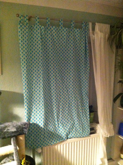 So, ich habe nun endlich das Projekt „Meine Küche muss schöner werden“ in Angriff genommen und als erstes wurde der Apfelstreichelstoff angeschnitten für neue Vorhänge. Ich habe erstmal eine ganze Menge gerades Band genäht für die Schlaufen, dann den Stoff ans Fenster über die vorhandene Gardinenstange drapiert und großzügig geschnitten. Nach dem genau ein Streifen des Bandes exakt für einen Vorhang reichte und ohne abzumessen die Abstände auch noch perfekt aufgingen am Ende, musste ich wirklich lachen. Das war ja schon fast zu perfekt für den ersten Versuch. Aber dann, als die Gardine hin, fand ich, es sieht irgendwie doof aus. Das muss jetzt erstmal ein (oder zweidrei) Tage wirken. Dabei fand ich den Stoff soooooo schön 😦 schnief