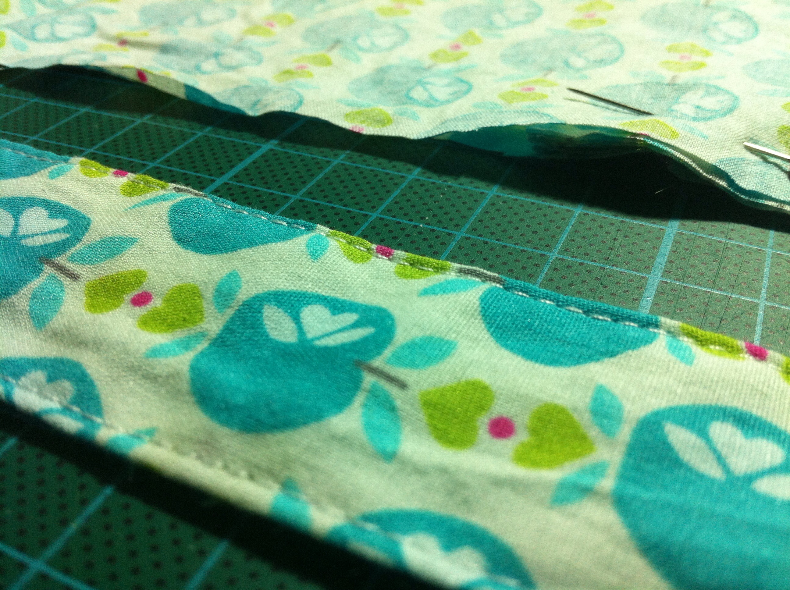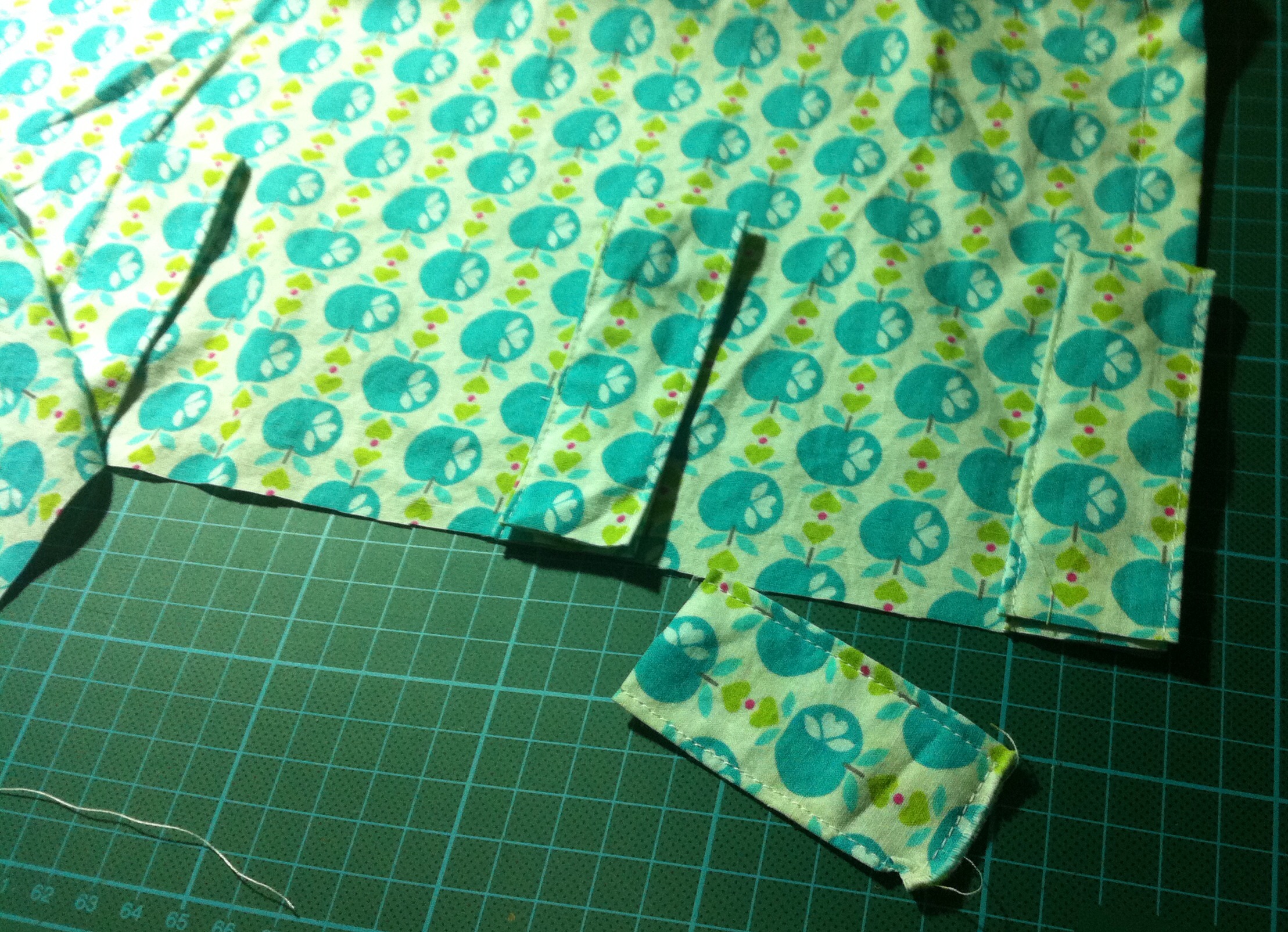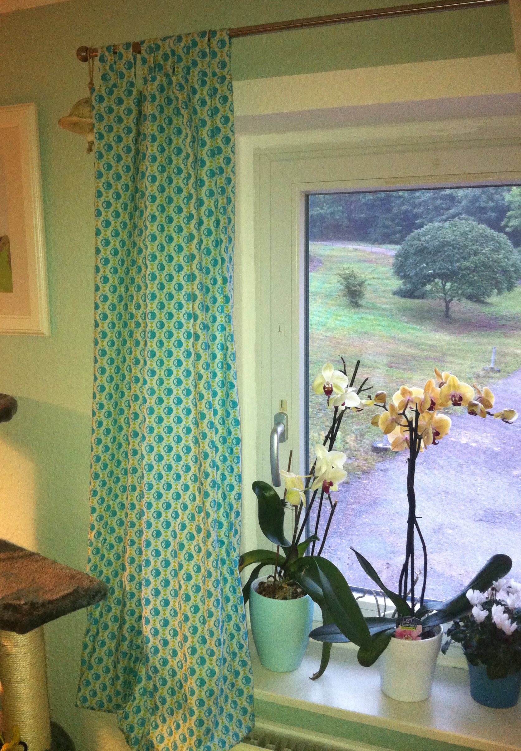 So, ich habe nun endlich das Projekt „Meine Küche muss schöner werden“ in Angriff genommen und als erstes wurde der Apfelstreichelstoff angeschnitten für neue Vorhänge. Ich habe erstmal eine ganze Menge gerades Band genäht für die Schlaufen, dann den Stoff ans Fenster über die vorhandene Gardinenstange drapiert und großzügig geschnitten. Nach dem genau ein Streifen des Bandes exakt für einen Vorhang reichte und ohne abzumessen die Abstände auch noch perfekt aufgingen am Ende, musste ich wirklich lachen. Das war ja schon fast zu perfekt für den ersten Versuch. Aber dann, als die Gardine hin, fand ich, es sieht irgendwie doof aus. Das muss jetzt erstmal ein (oder zweidrei) Tage wirken. Dabei fand ich den Stoff soooooo schön 😦 schnief