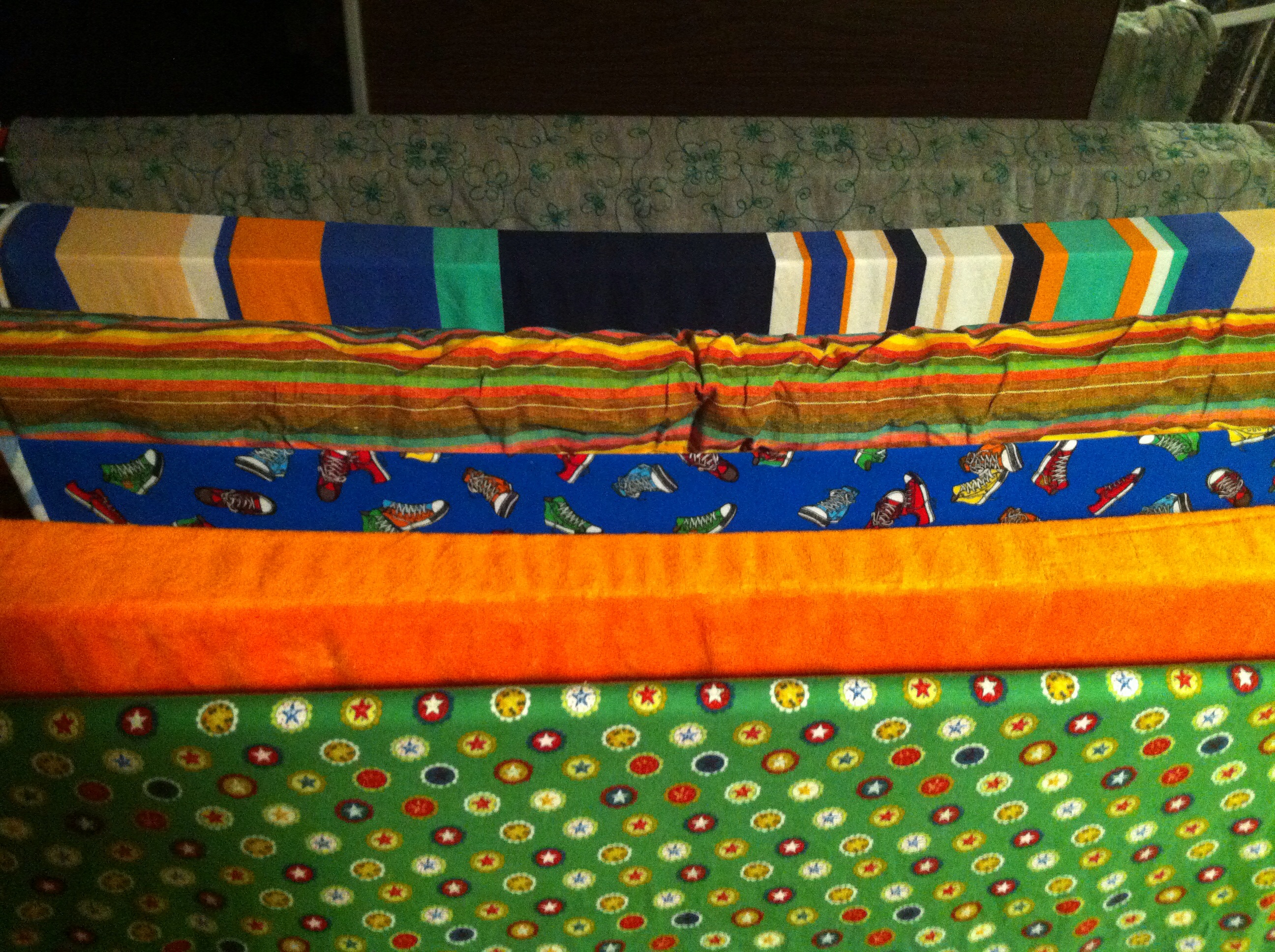 Endlich war mal wieder Stoffmarkt in der Nähe und dazu noch sonnigstes Sommerwetter. Meine liebste Nine und ich haben uns durch die Coupon-Wühlkisten gewühlt und es hat super viel Spaß gemacht. Knapp 11m Stoff für schlappe 42€ ist echt ein mega Schnäppchen: orangefarbener Nicki für Winter-Schlafanzüge für die Kinder, grüner Blumenjersey und grau-bestickter Blumenjersey für mich. Aus dem blauen Sneakerjersey möchte ich paar Langarmshirts für die Jungs machen und aus dem bunt gestreiften Leinen eine Lässig-Hose für mich. Den merkwürdig breitbunt gestreiften Jersey oben gab es 2m geschenkt zu dem Nicki dazu. Mal sehen, was das mal werden könnte.