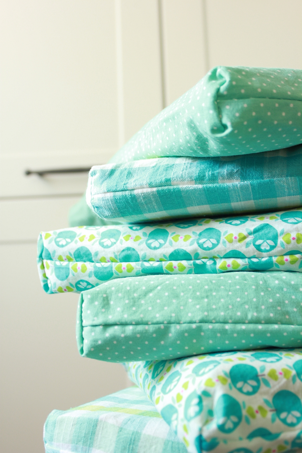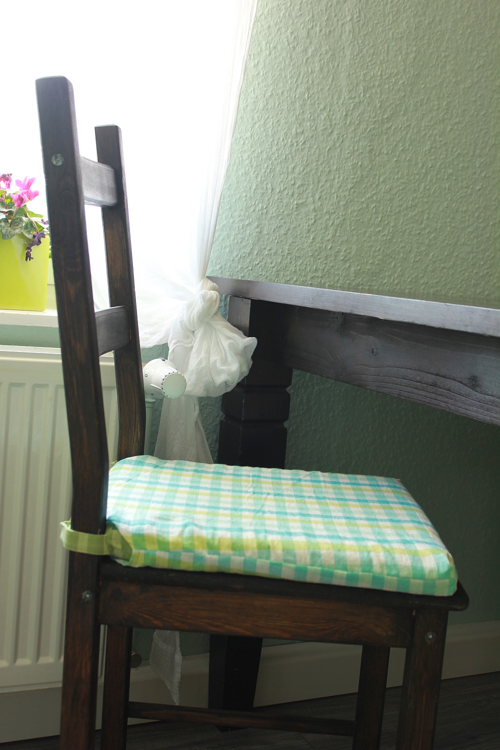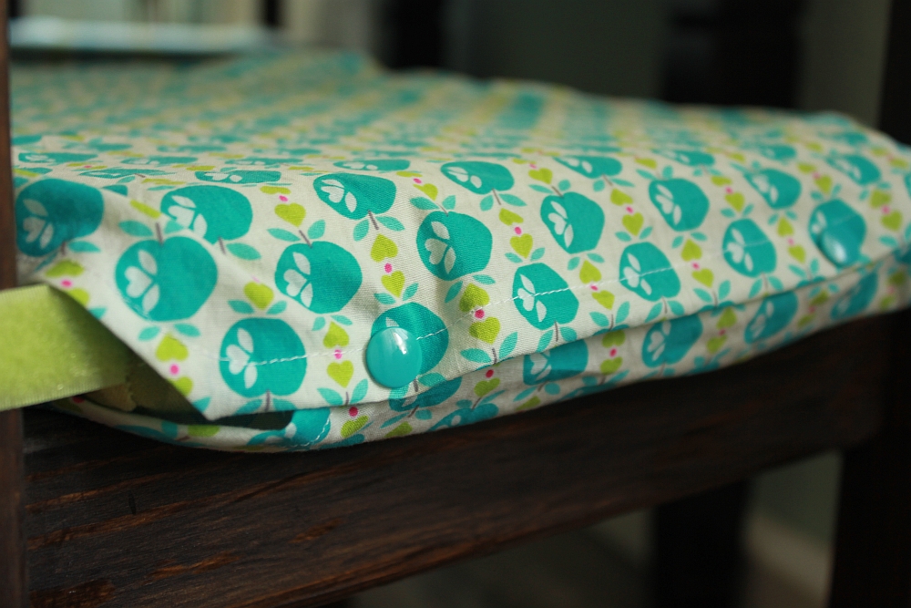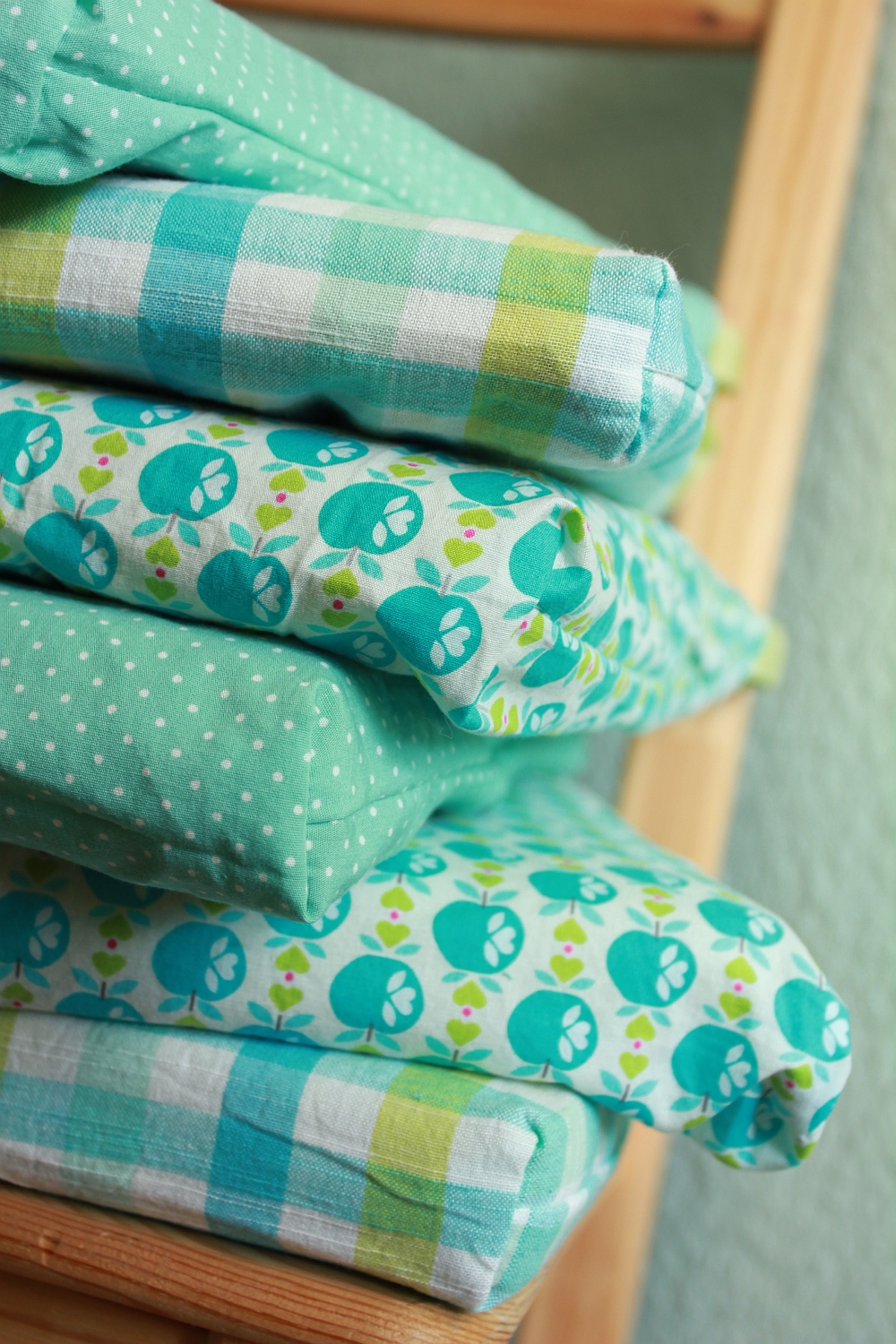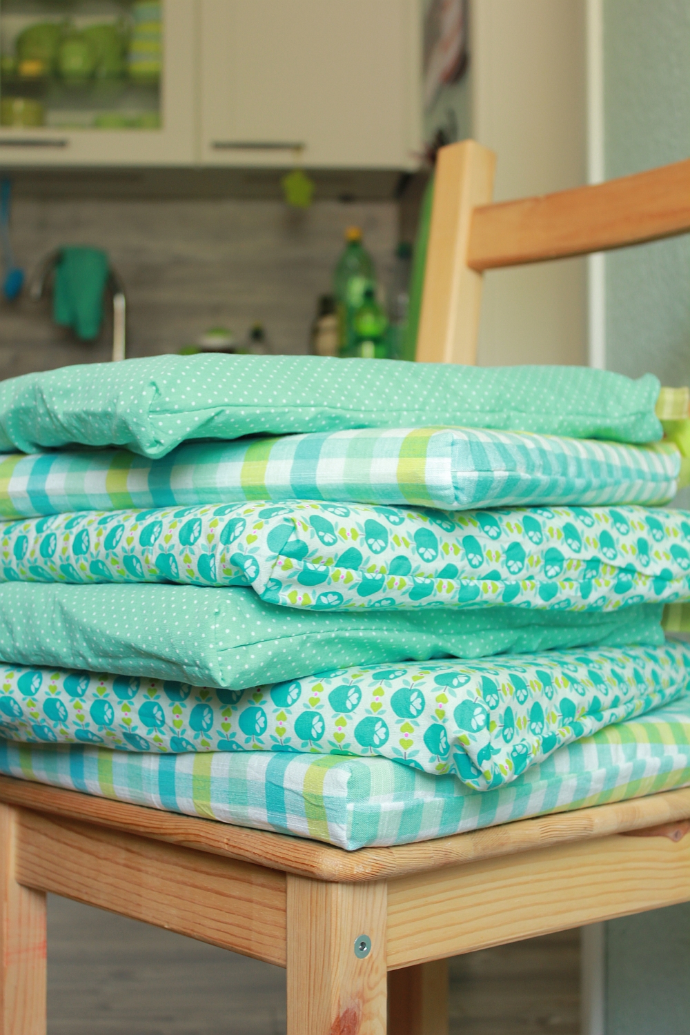 Nachdem das mit den Vorhängen immer noch nicht so richtig entschieden ist, was ich da nun mache, habe ich mich nun erstmal an die Kissenhüllen gesetzt. Und entgegen dem eigentlichen Plan, alles in Apfel-Stoff zu verhüllen, habe ich mich nun für drei verschiedene mint-blau-hellgrün-weiß-Stoffe entschieden und jeweils zwei Hüllen genäht. Erst wollte ich die Ikea-Bezüge abziehen, hab mich dann aber dagegen entschieden und einfach einen weitern Überzug genäht, der nun mit Snaps am Ikea-Kissen festgehalten wird. Vorteil ist, man kann sie einfach mal abziehen, waschen und in der Zeit sind die Kissen nicht nackig. Außerdem habe ich mir das lästige Klettband annähen gespart 😛 Jetzt muss ich nur noch mal Zeit finden, meine Stühle alle weiß zu streichen.