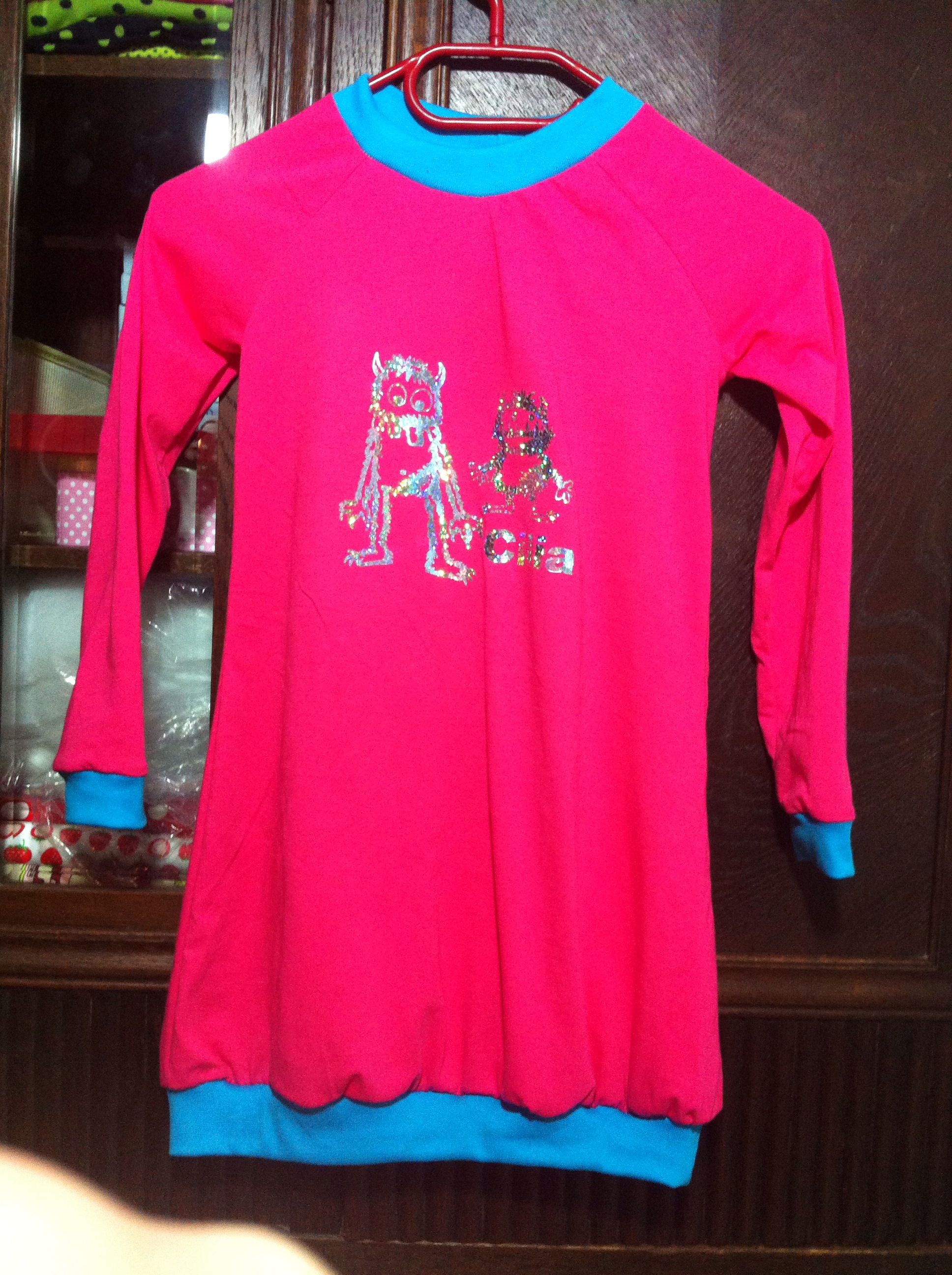 Für Jungs nähen ist manchmal echt frustrierend. Es muss cool sein, es sollen möglichst Autos oder Bagger oder Piraten drauf sein und Kleidchen gehen natürlich überhaupt nicht. Umso mehr freu ich mich dann, wenn ich mich mal für kleine Mädchen austoben darf. Diesmal gab es das Raglankleidchen von Klimperklein in knalligem Pink, abgesetzt mit türkisen Bündchen. Und weil die Welt ja nicht nur rosa ist, sondern auch glitzert gab es dazu geplottete Glitzer-Kritzel-Monster. Ich hoffe, es gefällt der jungen Dame 🎀.