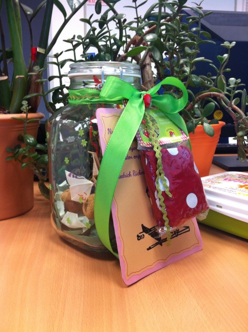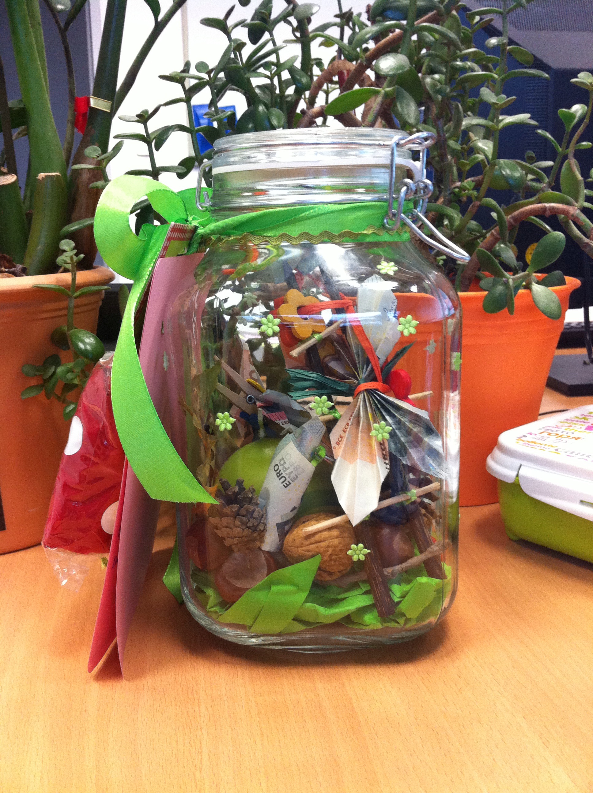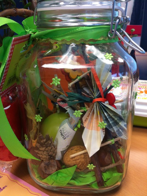 Mir ist, als wär es gestern gewesen, als mir meine Kollegin vorrechnete, dass sie noch knapp 6 Jahre arbeiten muss, bis zur Rente. Aus 2617 Tagen wurden weniger und weniger und nun war es endlich soweit. Zeit gekommen, Abschied zu nehmen und ihr alles Liebe und Gute für ihren wohlverdienten Ruhestand zu wünschen. Die Kollegen haben alle gut zusammengelegt. Ich habe aus einem großen Einmachglas, etwas Herbstdeko (Filzblumen – und blätter, grüne Miniklammern), Walnüssen, Kastanien und Tannenzapfen, sowie einer selbstgebastelten Holzleiter aus Essständchen und Schaschlikspießen ein gemütliches Terrarium gebaut. Dort zogen dann eine grüne Kerze und Frösche, Schmetterlinge und anderes Getier, gefaltet aus Geldscheinen ein. (Anleitungen siehe youtb.de). Mit etwas grünem Geschenkband und bunten Holzblumen dekoriert, kam es sehr gut an und wir hoffen, du wirst viel Freude haben, liebste ehemalige Kollegin, die Kröten auszugeben.