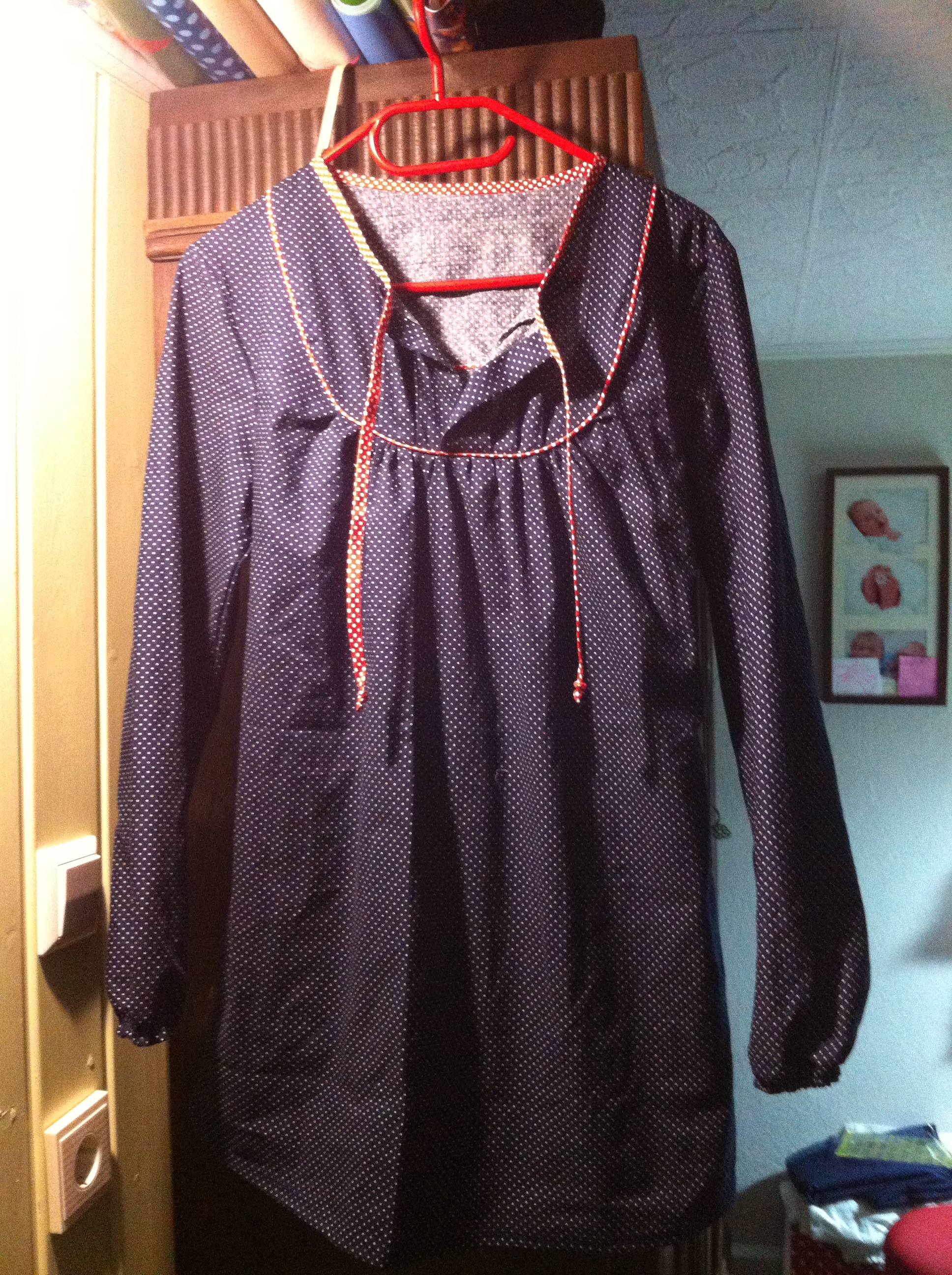 Ich habe die Kleidversion genäht, allerdings um 10cm gekürzt, so dass sie als lange Tunika passt. Die Ärmel habe ich umegschlagen und ein Gummiband eingezogen. Damit die Passform nicht so „sackig“ ist, habe ich auf Taillenhöhe Schrägband eingesetzt, was man im Rücken verknoten kann. Ich bin gespannt, was die Mama zur MaMina sagt 😉