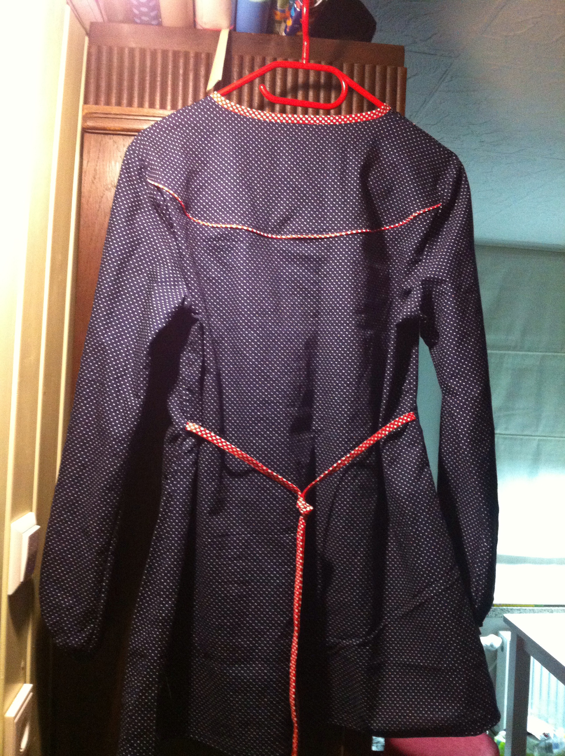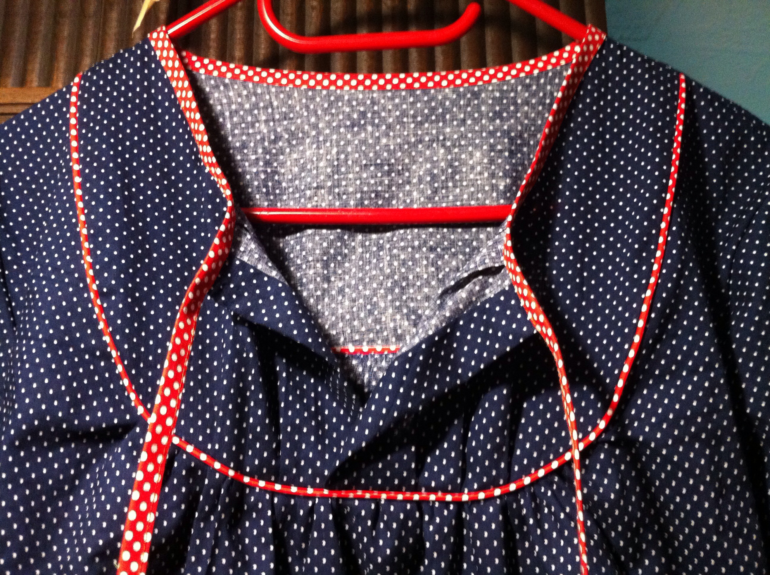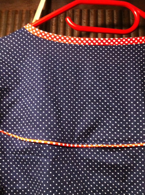 Und dann kam mir die Idee, marineblaue Pünktchen zu verwenden. Gekauft habe ich die Popeline bei Michas Stoffecke, dazu rotes Web- bzw. Paspelband ebenfalls mit weißen Punkten.