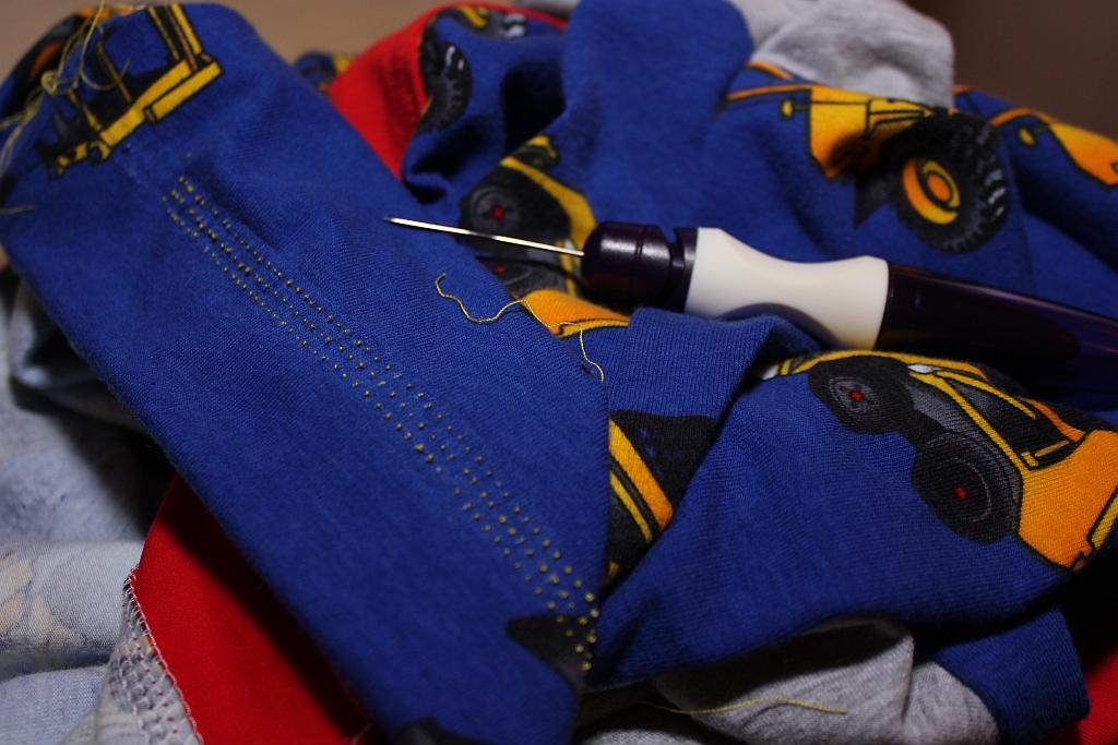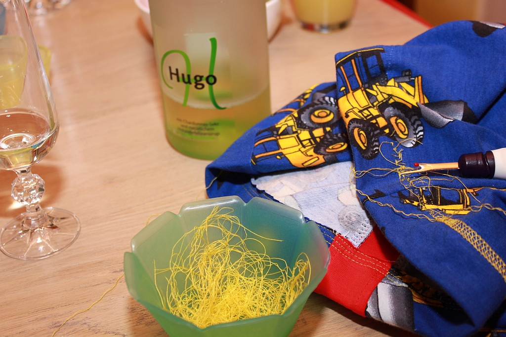 Der Moment, bei dem sie etwas rumzickte und Stiche ausließ, war immer genau dann, wenn man anhielt und die Nadel nicht innerhalb des Stoffes steckte. Wir testeten es dann damit, dass wir das Handrad drehten bis die Nadeln soweit es geht, wieder im Stoff stecken, bevor wir weiternähen. Damit ging es am Probestoff ganz gut, aber auch nicht immer fehlerfrei. Als wir dann das blaue Shirt unterlegten und es genauso machten, gab es mehrere Stichaussetzer. Also hieß es mal wieder Auftrennen. Das Ganze haben wir dann zweimal an zwei Shirts gemacht (dazu gabs ne Menge lustige Witze und etwas Hugo grins), weil ich nämlich trotz Regis ausführlicher Anleitung den richtigen „Aufzieh-Trennfaden“ der Covernaht nicht gefunden habe.