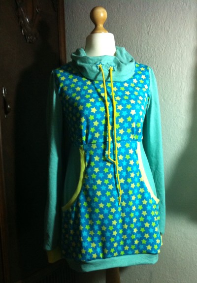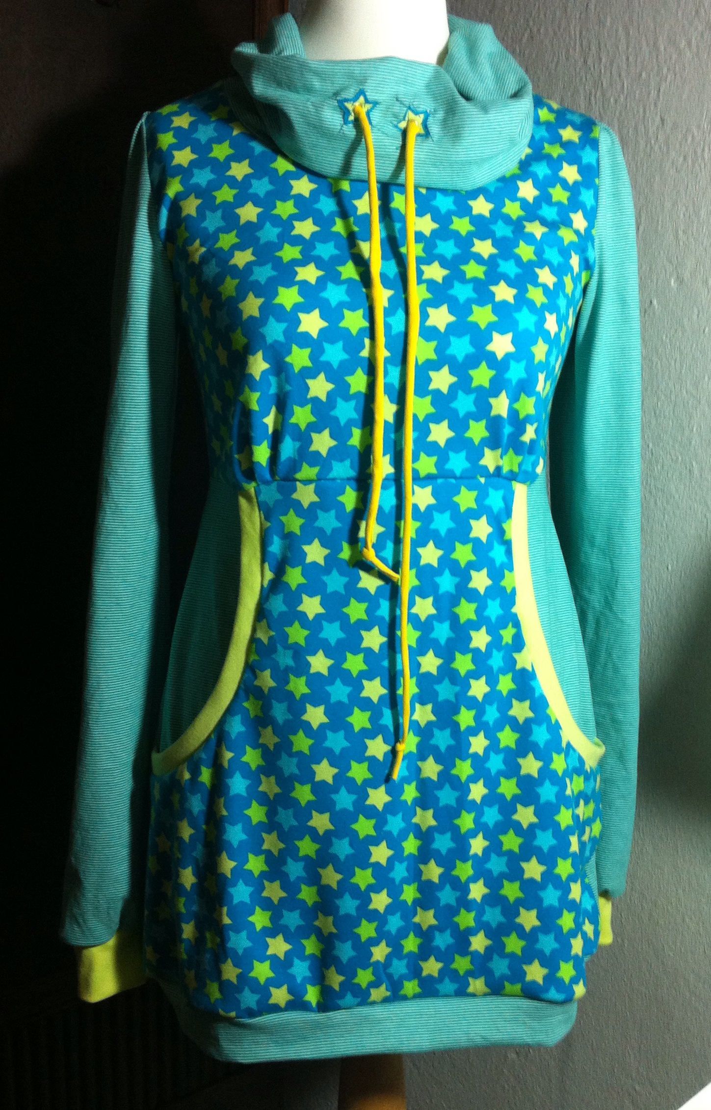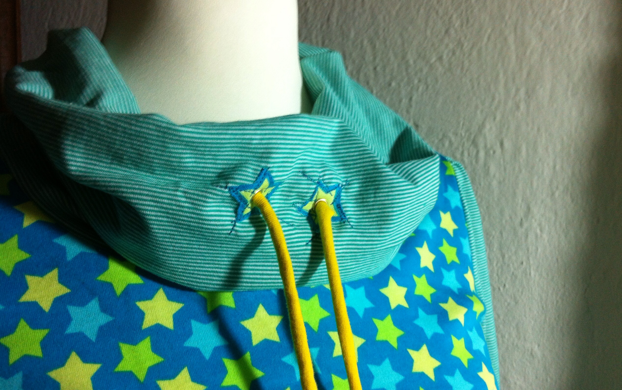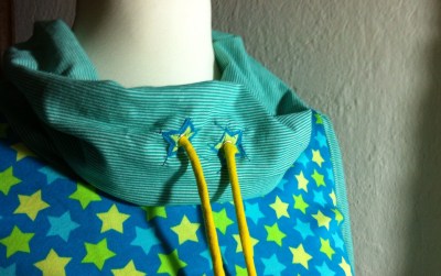 Und dann geht alles blitzschnell. Eine Martha wird es, mit dem Sternenjersey von Michas, welchen ich bereits vor 4(!) Jahren gekauft habe, sowie dem tollen Sanetta-Ringeljersey in Mint und hellgelben Bündchen. Einen luftigen Kragen soll sie haben, mit Jerseynudeln als Bändchen und seitliche Eingriffstaschen.