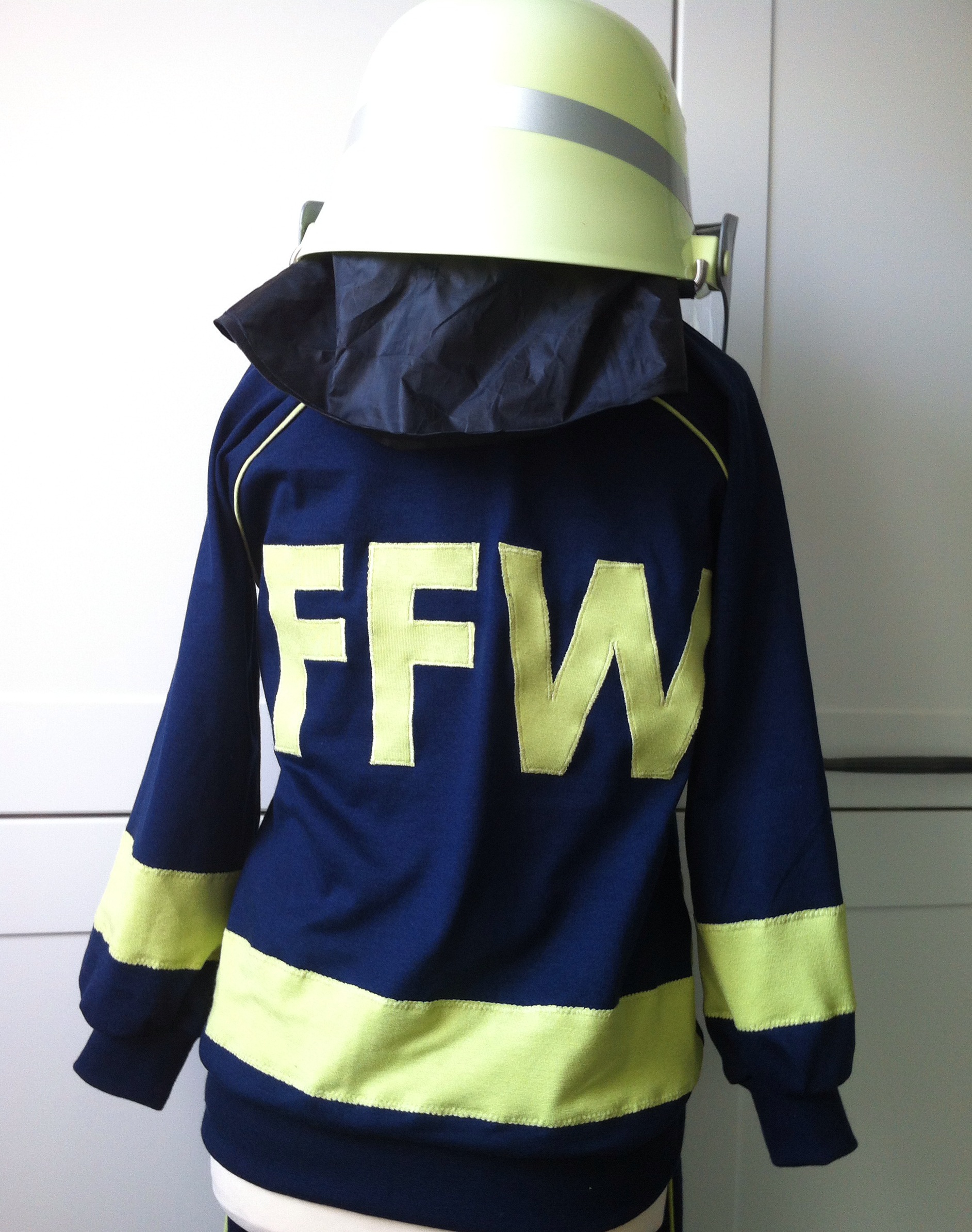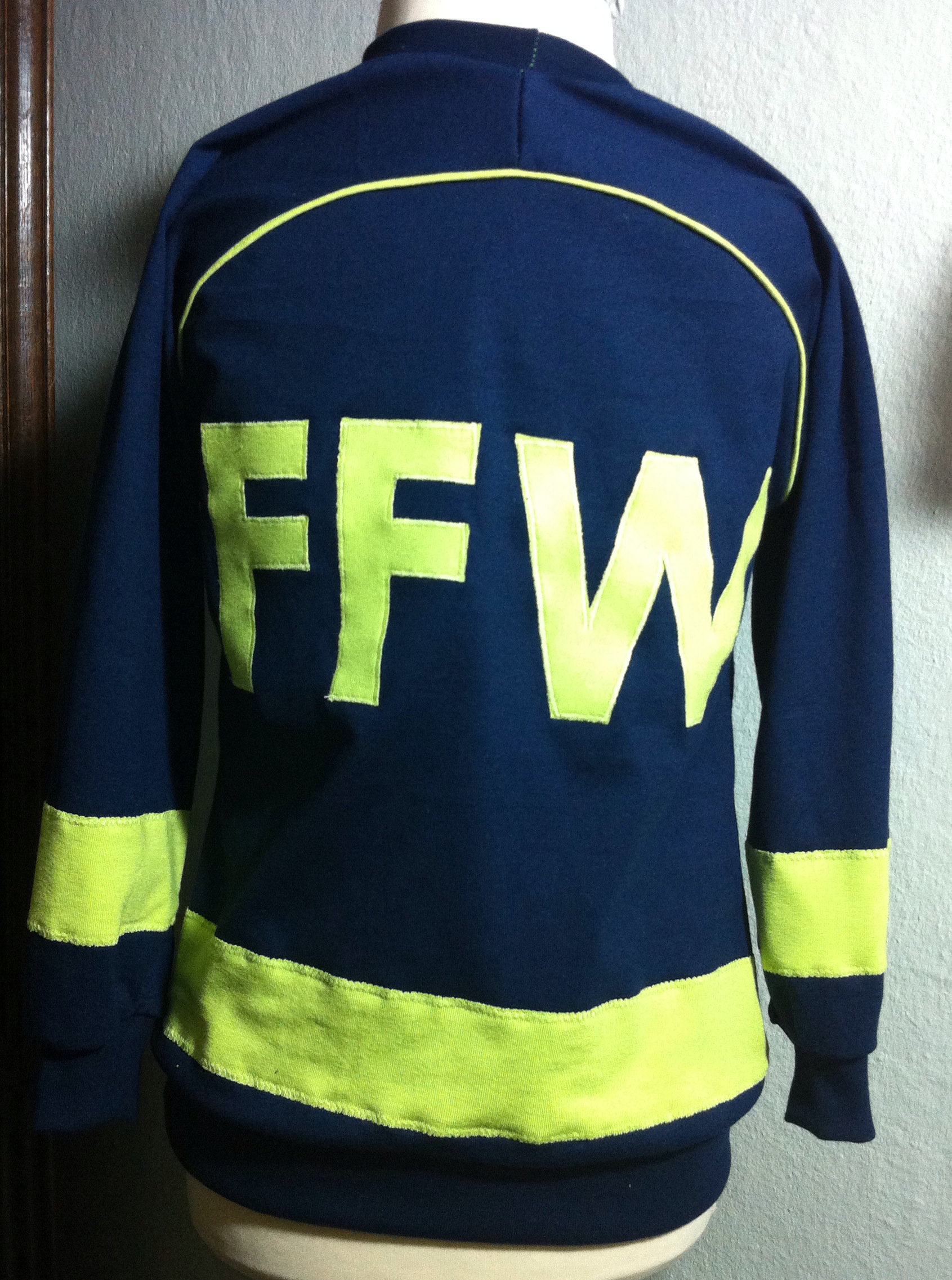 Nachdem der Helm mit Klappvisier besorgt war, kam nun die „echte“ Feuerwehruniform an die Reihe. Verwendet habe ich marineblauen und neongelben Jersey.