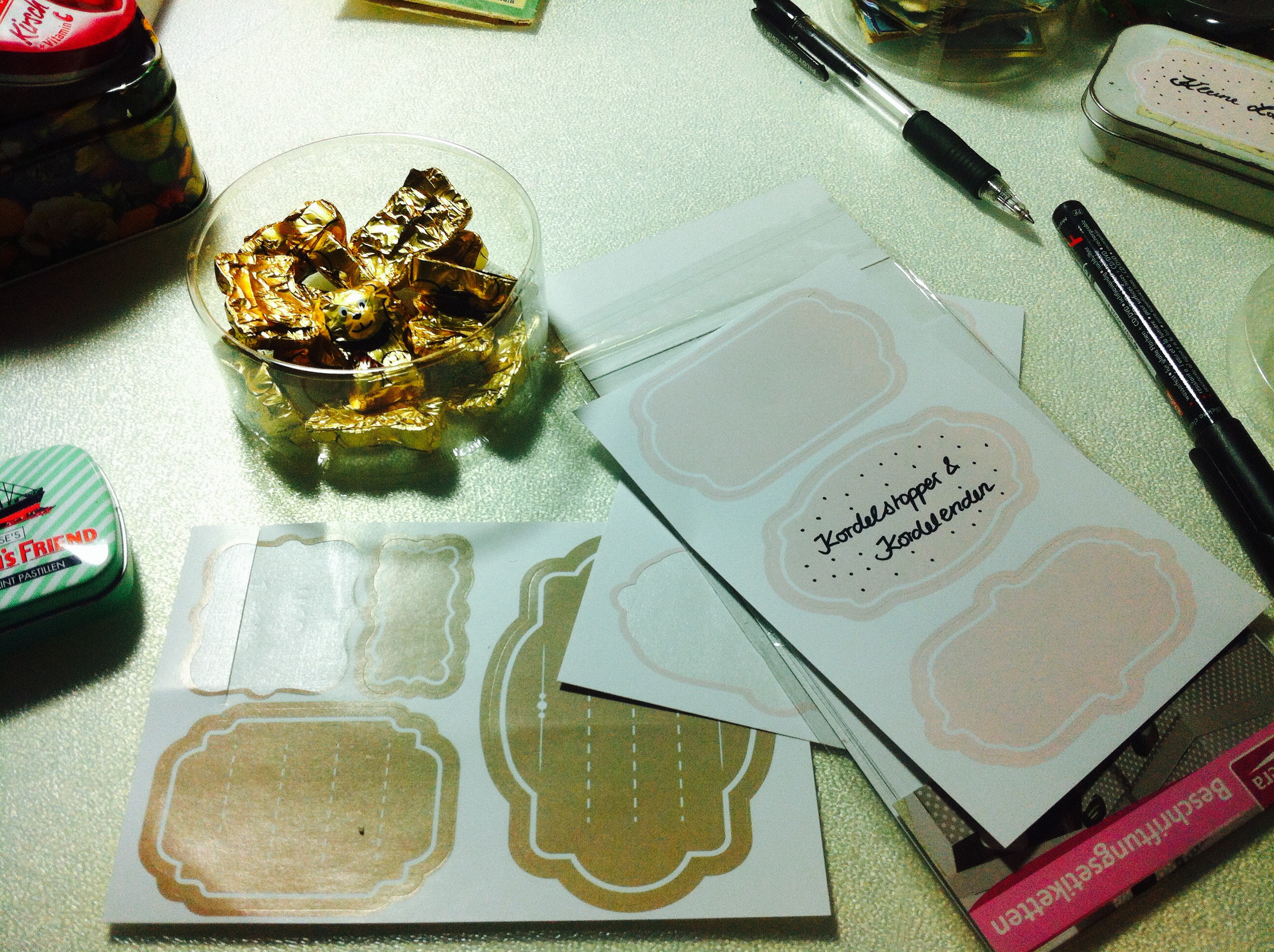 Also alles in allem schon ein paar hübsche Dinge, die zum Wegwerfen wirklich zu schade sind. Da kamen mir die durchsichtigen Schächtelchen der kleinen Schokladenbären gerade richtig. Verziert mit ein paar Label-Klebern (erstanden im Lidl diese Woche) ergab das eine wunderschöne Aufbewahrungsmöglichkeit für die kleinen Schätze.