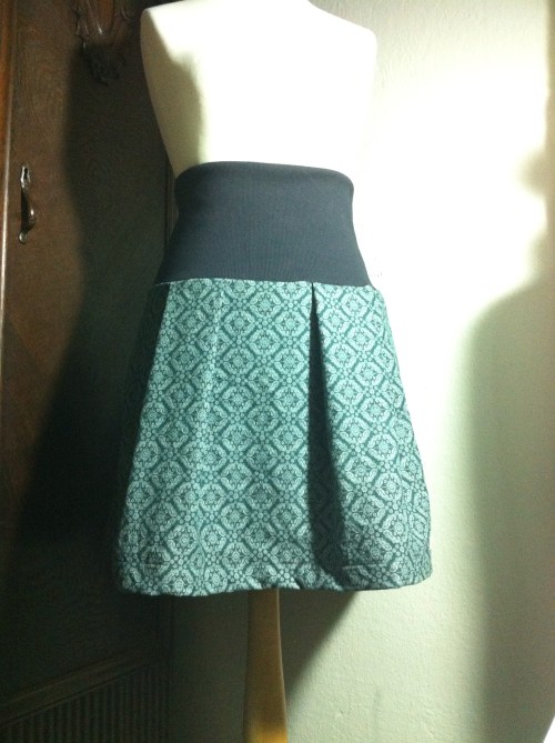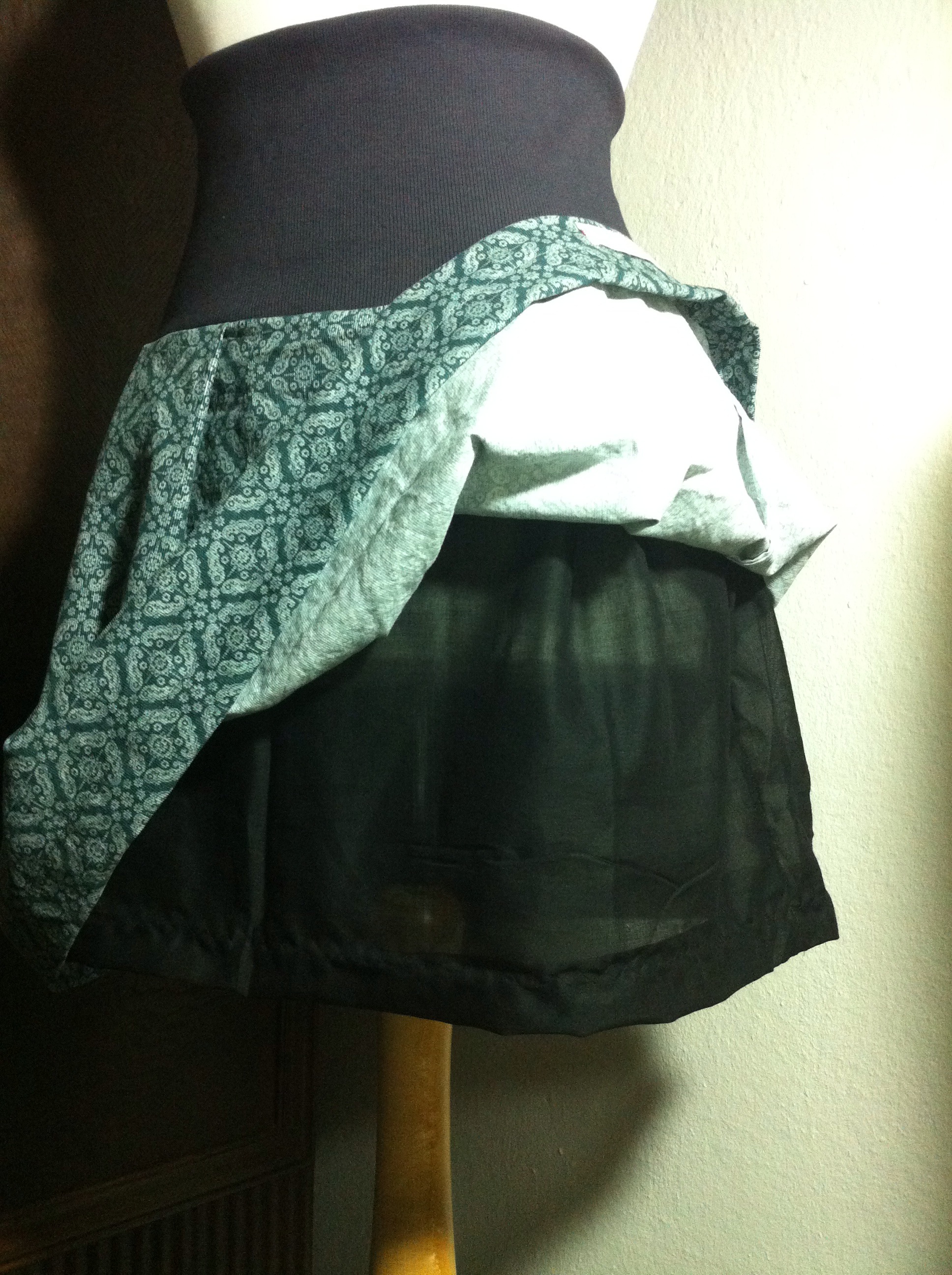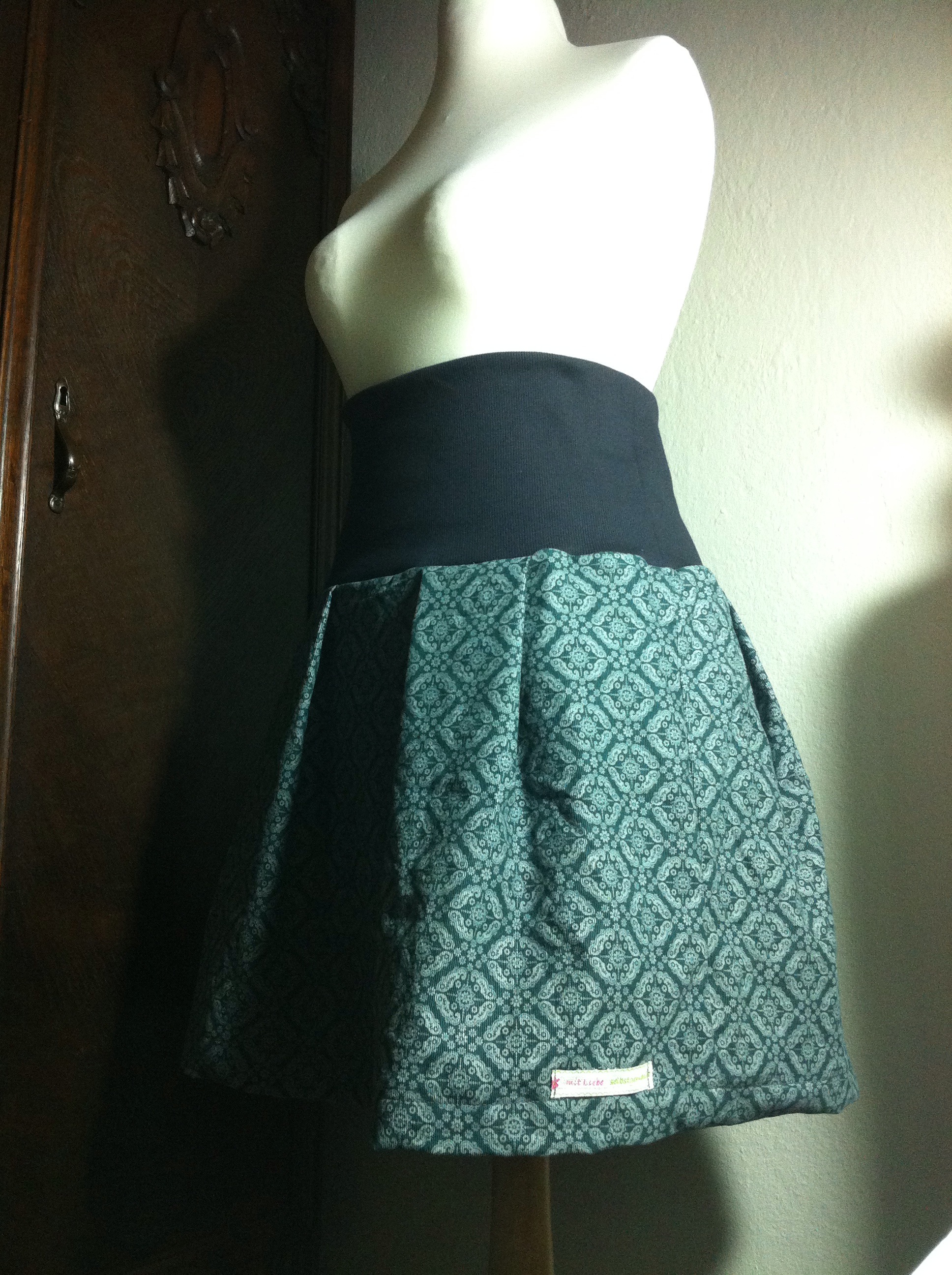Ich habe mich entschieden, den Rock zu füttern. Das macht zwar erstmal ein wenig mehr Arbeit, dafür sitzt er besser (bauscht schön) und er klebt nicht an der Strumpfhose 😉 Dafür habe ich schwarzen Futterstoff (aus Omas Vorräten) genutzt, die Falten weggerechnet in der Breite und die Länge des Rockes um 4cm gekürzt.