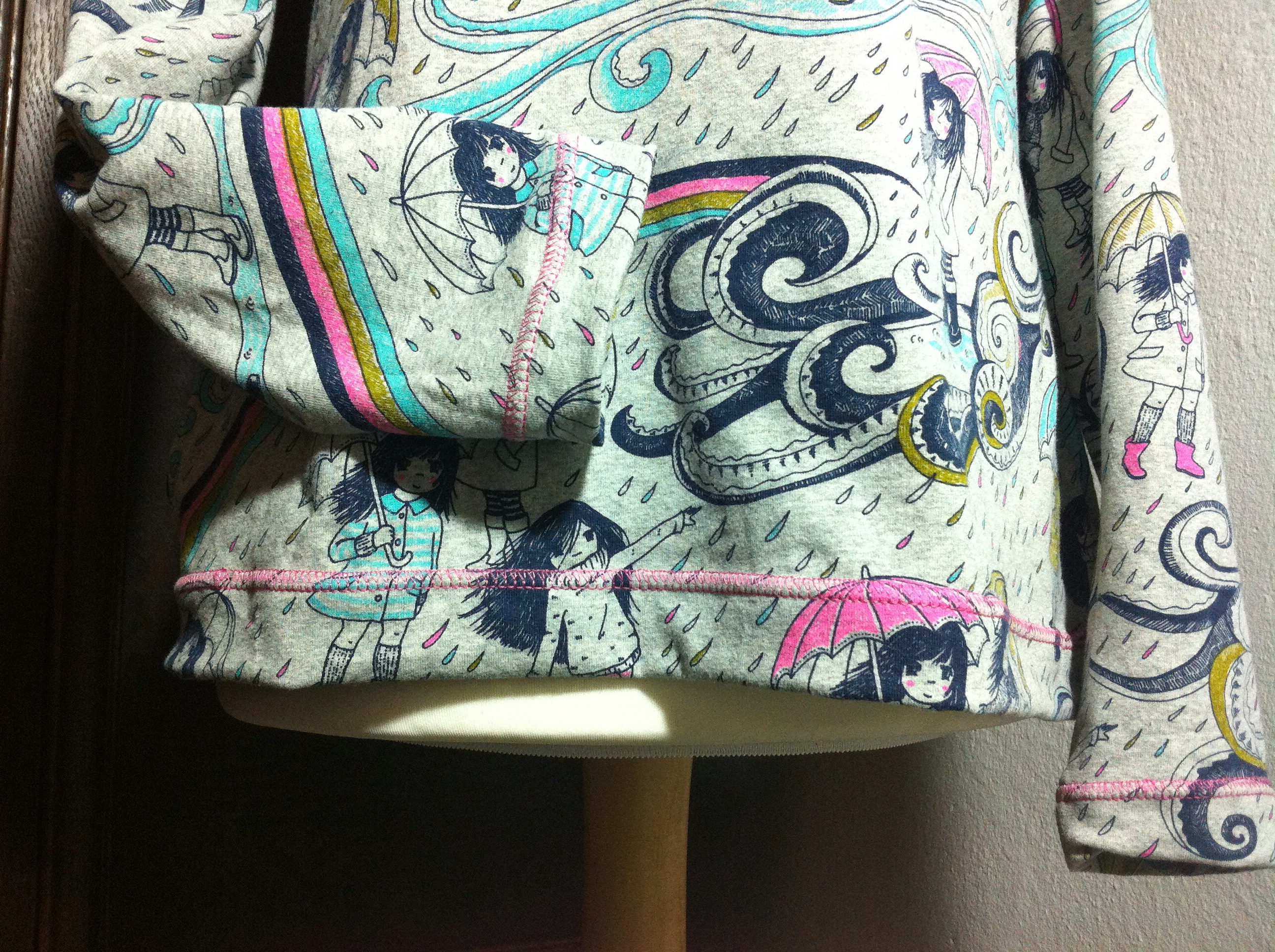 Leider hab ich diesmal echt geflucht: zwei Zwillingsnadeln (die 75er sind einfach doch zu dünn und/(oder ich bin zu ungeduldig) habe ich geschrottet. Und ungelogen 20-mal ist mir der pinkfarbene Faden gerissen beim Absteppen. Aber ich habe alles stoisch über mich ergehen lassen und immer wieder eingefädelt und irgendwann war es dann geschafft. Alles toll gesäumt ganz ohne Covermaschine 😉