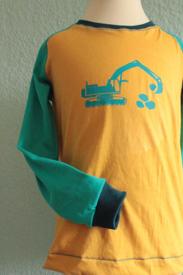So, ich habe dann jedenfalls ein paar Zwillingsnadeln gekauft und zuhause dieses schöne Shirt genäht. Die Datei für den Baggerplot findet ihr oben unter Freebies. Und nun überlege ich, wann ich im Nähmaschinengeschäft anrufe und einen Termin zum Probe-Covern ausmache. 😀 Dann zieht sich die Schlinge wohl entgültig zu und ich kann keinen Widerstand mehr leisten. schnellweghusch