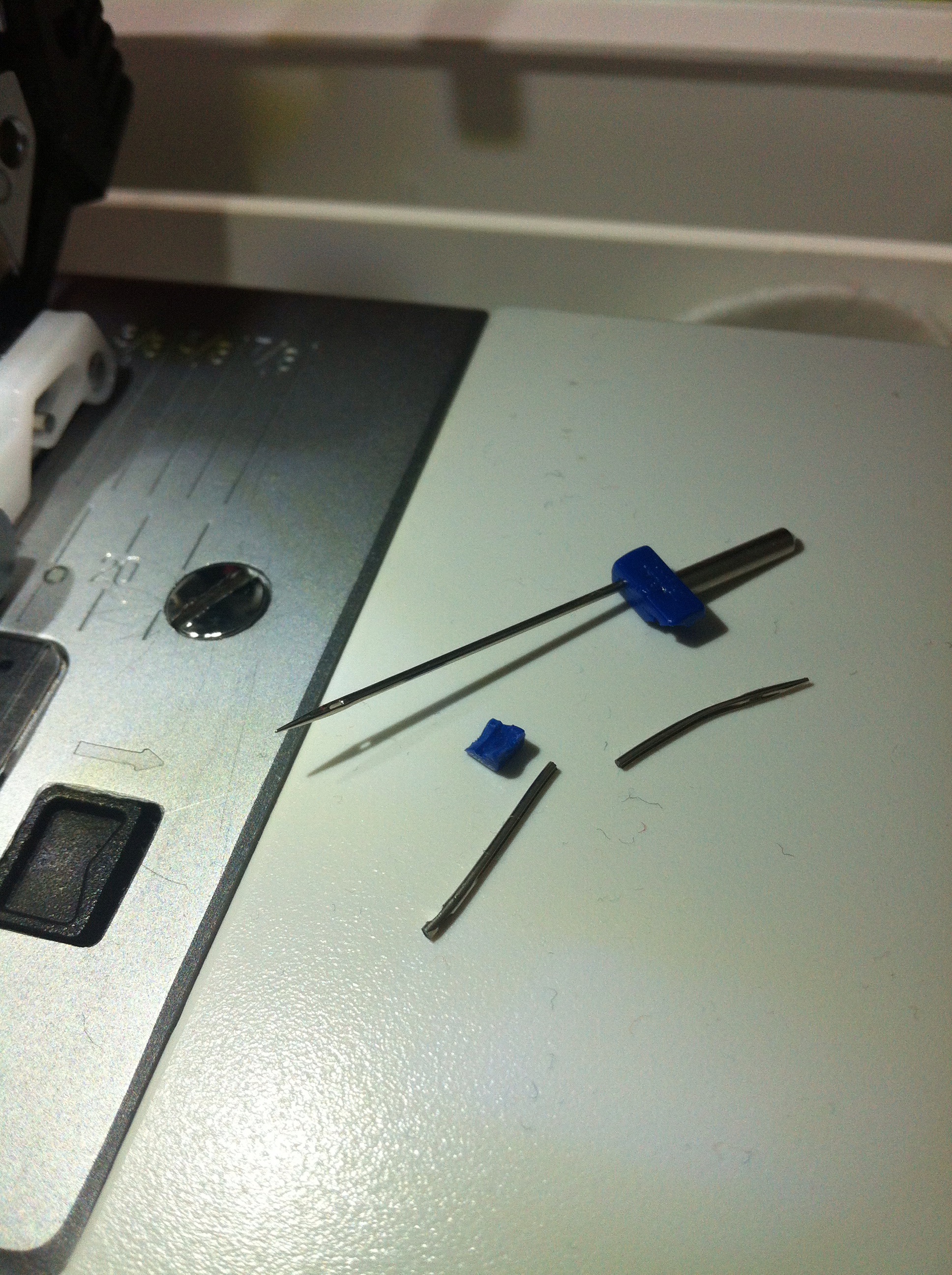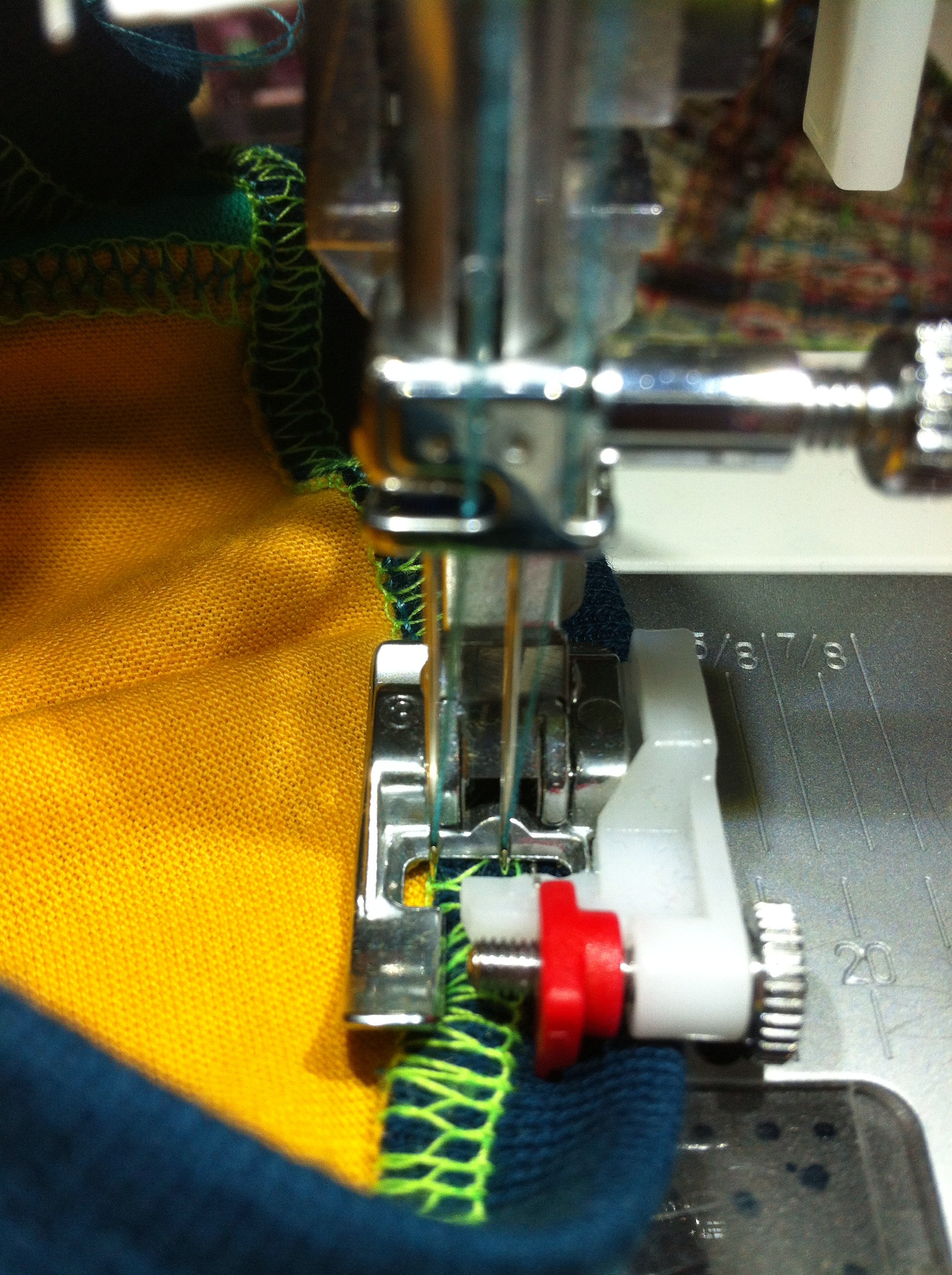 So leicht gebe ich nicht auf. Nachdem das letzte (rote) Shirt mich mal eben zwei Zwillingsnadeln gekostet hat, war ich vorgestern im hiesigen Nähmaschinengeschäft. Die erste Aussage war, sowas könne nicht passieren, ich hätte sicher zu sehr am Stoff gezerrt. Nadeln brechen nur, weil man falsch näht. Und 75er Schmetz-Zwillingsnadeln würden niemals brechen. Doch, bei mir schon, genau dann, wenn sie über die Ovinaht müssen und die Maschine, koste es, was es wolle, den Schaft gewaltsam runterdrückt.