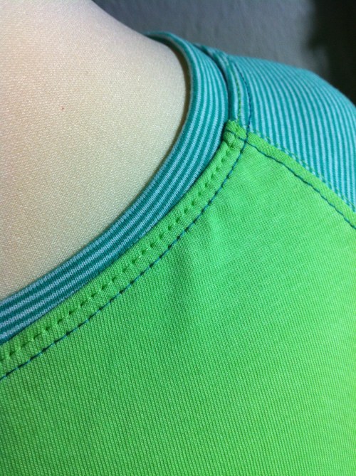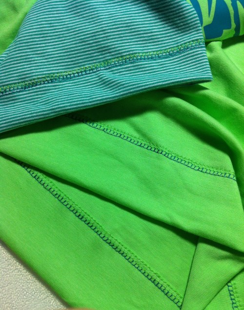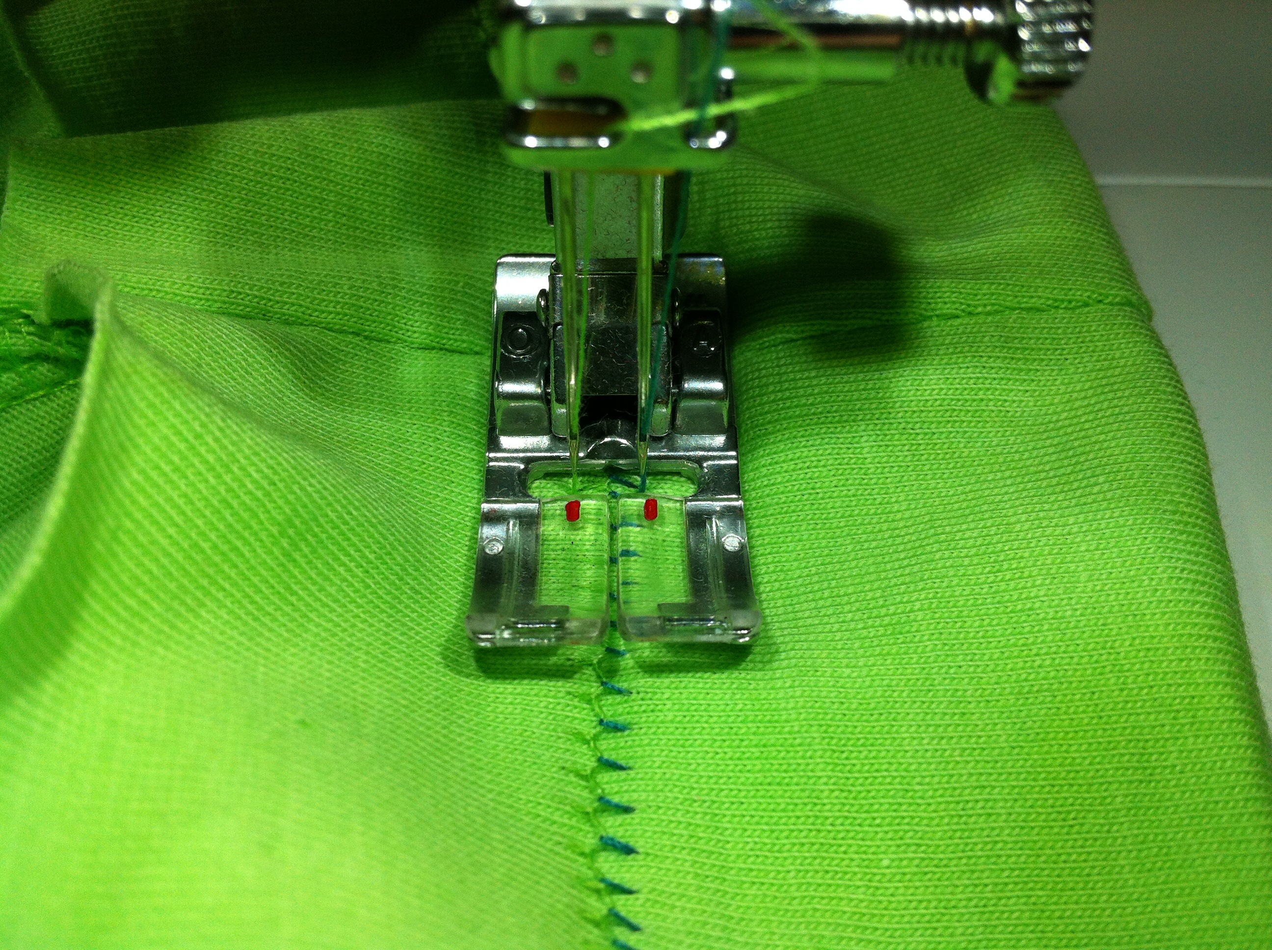 Als nächste Idee kam mit in den Sinn, die Zwillings-Naht am Saum eines T-Shirts von der anderen Stoffseite einfach nochmal zu nähen. Das sieht dann so aus, ich hatte zwei verschiedene Farben, petrol und hellgrün eingefädelt.