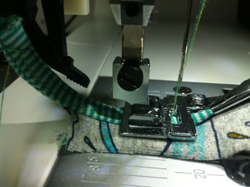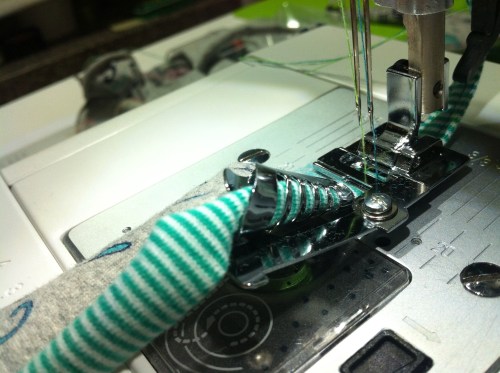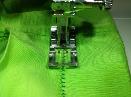 Aufgrund der späten Stunde hab ich dann den Versuch „Bandeinfasser“ zumindest an diesem Versuchsobjekt erstmal nicht weitergeführt, auch um es nicht gänzlich durch wiederholtes Auftrennen zu versauen. Also fix das Bündchen mit der Ovi angenäht, aber noch schick zweifarbig mit der Zwillingsnadel abgesteppt (2,5/90). Man sollte übrigens IMMER beim Absteppen über die Ovinaht vorsichtig sein, denn da muss die Nähmaschine von zwei Lagen Stoff auf 6 Lagen inklusive Overlocknaht wechseln, was zur Folge hat, dass sehr schnell die Nadeln brechen. Ich stoppe immer kurz vorher und mache den ersten Stich in die Naht per Handrad.