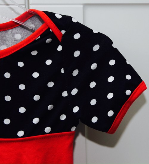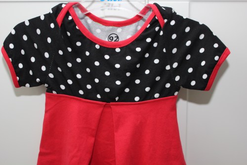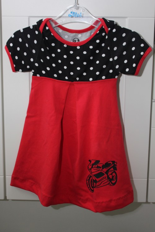 Auch kleine Mädchen können schon coole Kleider mit einem Motorrad drauf tragen. Es ist schon ein paar Tage her, da enstand diese zuckersüße „Kinderkleid“ von Klimperklein. Das hat einen amerikanischen Ausschnitt und normale Ärmelchen. Ich habe das erste mal so einen Ausschnitt genäht. Da die Elna da noch nicht hier wohnte, habe ich den roten Jerseystreifen zunächst mit der Overlock außen auf den Ausschnitt aufgenäht (einfach). Danach habe ich den Streifen nach innen umgeschlagen und mit der normalen Nähmaschine festgesteppt.