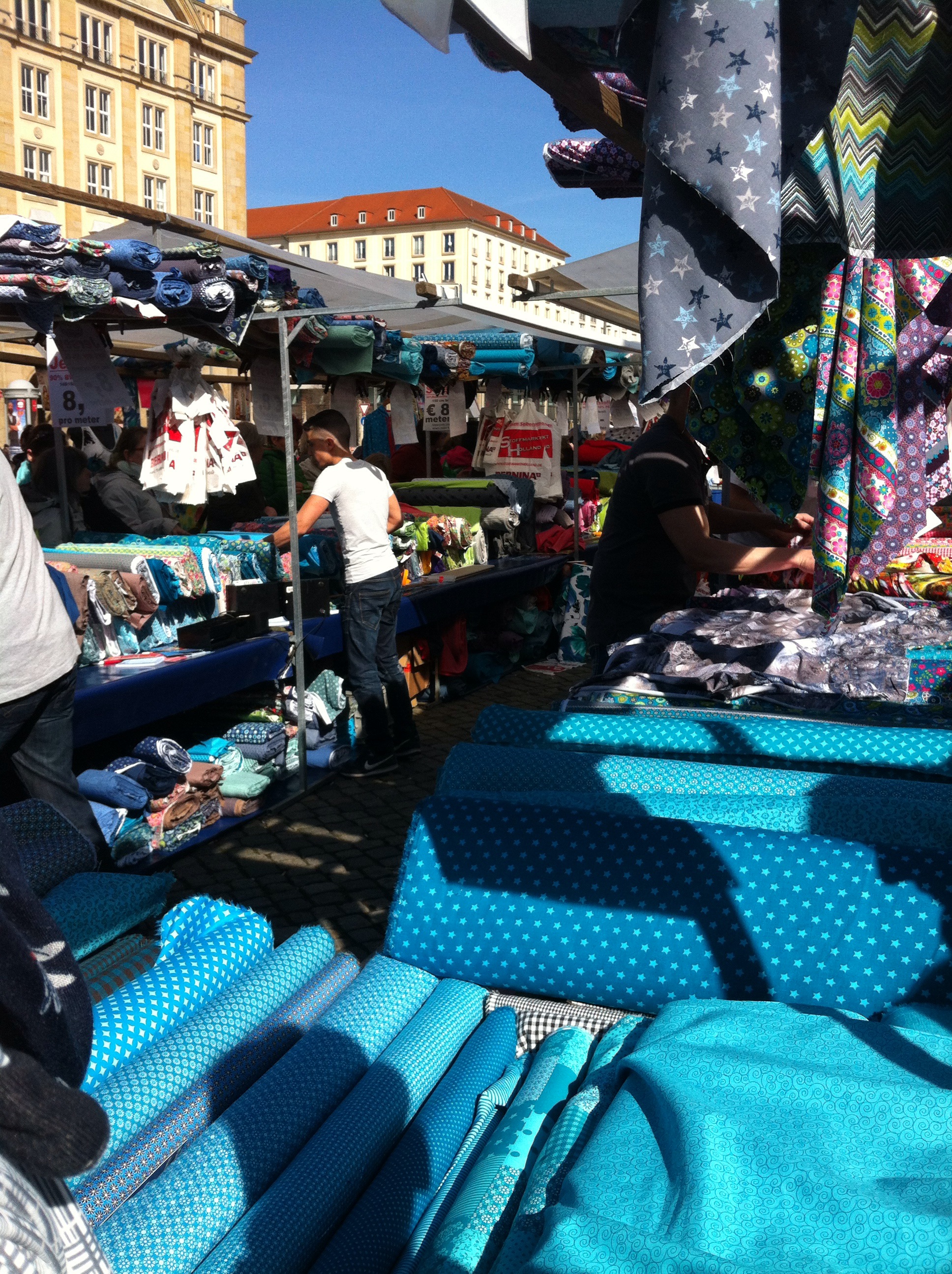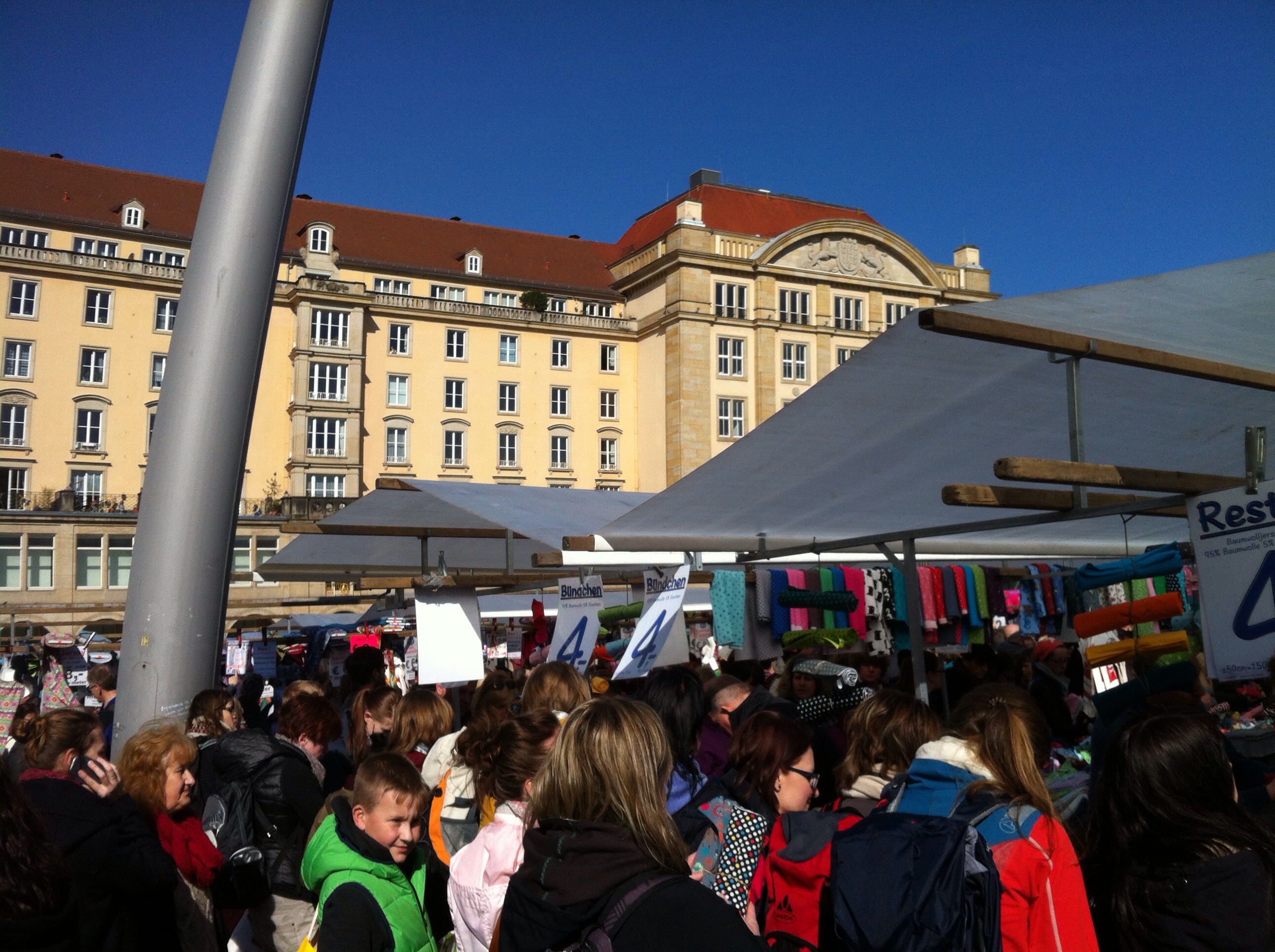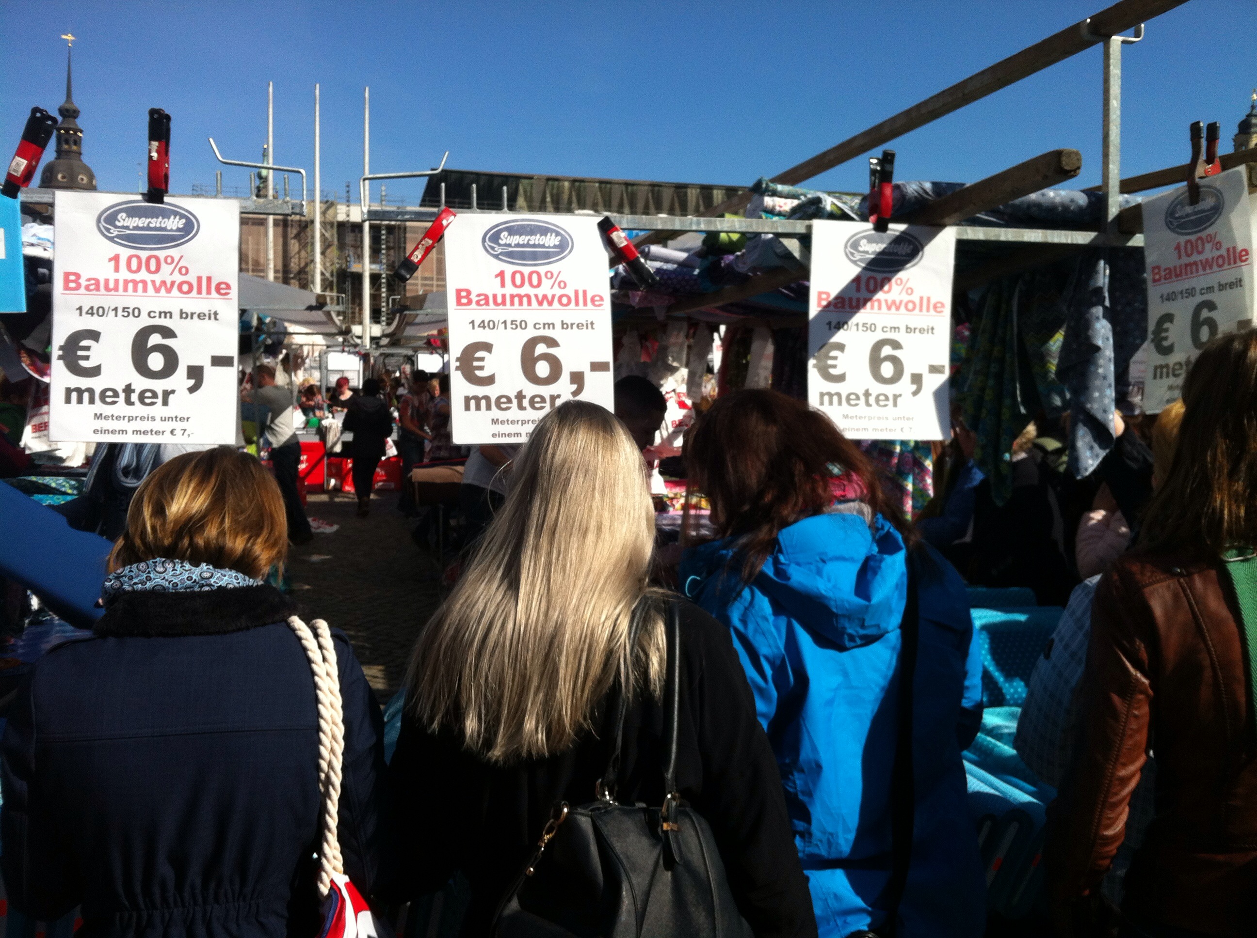 Hibbel, hibbel, was hab ich mich (vor-)gefreut. Endlich wieder Stoffmarkt. Clara strahlt vom Himmel (wie jedes mal irgendwie?), das macht es natürlich perfekt. Dieses Mal hatte ich gleich meine beiden liebsten (Näh-)Mädels an Bord (noch mehr Grund zu Freude!) und pünktlich um 10 Uhr sind wir in Dresden eingerückt. Der erste Schock: verdammt ist das (schon) voll. Aber was solls, Ärmel hoch und rein ins Getümmel.
