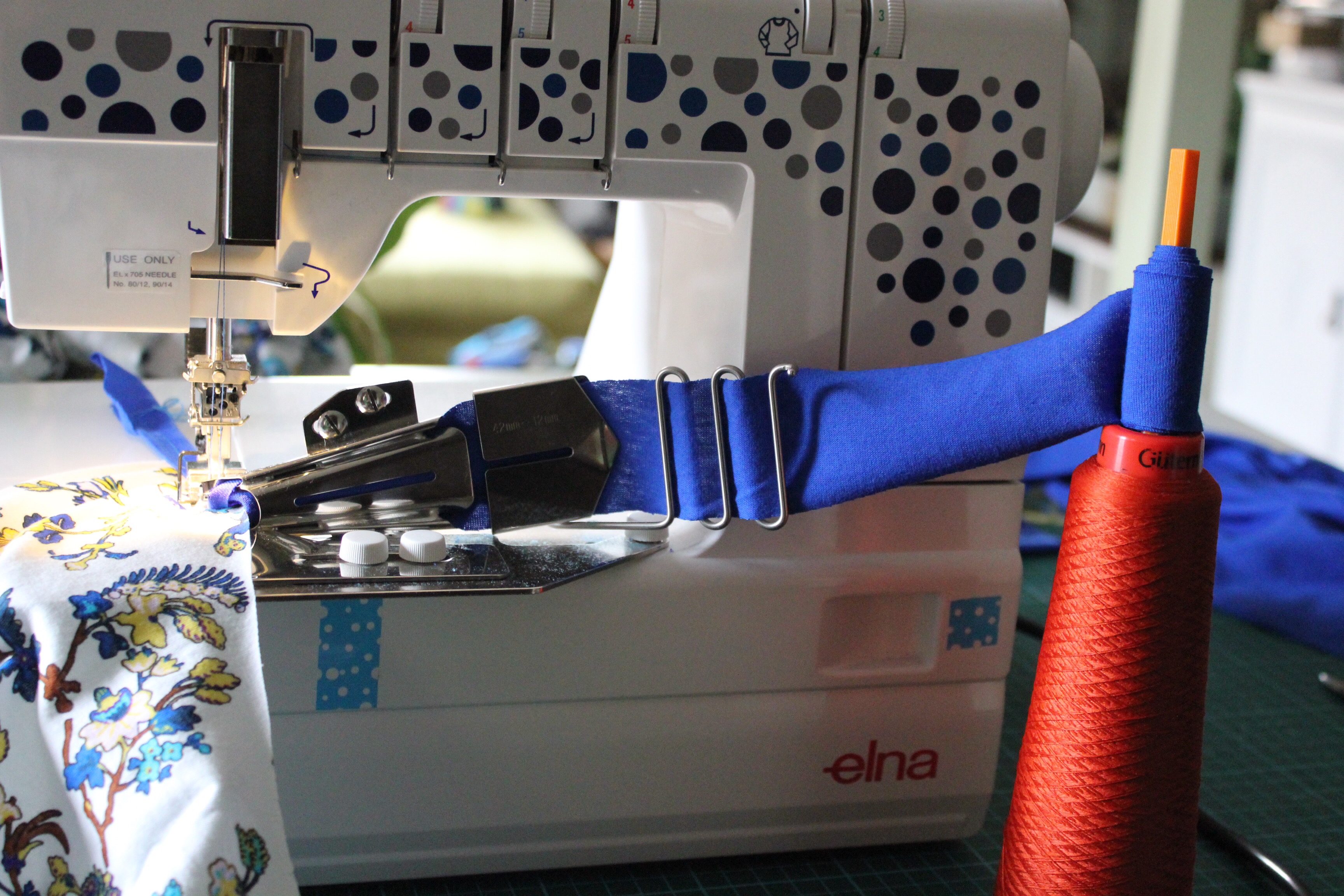 Die Montage des Bandeinfassers an die Elna war nicht schwer, man musste nur die Platte anschrauben und dann den Einfasser aufsetzen. Hier findet ihr die Original-Anleitung dazu: Klick. Die richtige Position des Einfassers hatte ich relativ schnell gefunden. Dann ging es ums einfädeln. Das Band wird mit der linken Stoffseite nach vorn, erst durch den Rechen und dann von rechts nach links, am besten mit einer Pinzette durchgezogen. Dazu gibt es auch gute Videos im Netz, die das ganz detailliert zeigen, einfach mal googlen (oder bei Tanja vorbeischauen). Das Band wird dann nach hinten rechts unter das Füßchen gezogen und ein paar Stiche genäht.