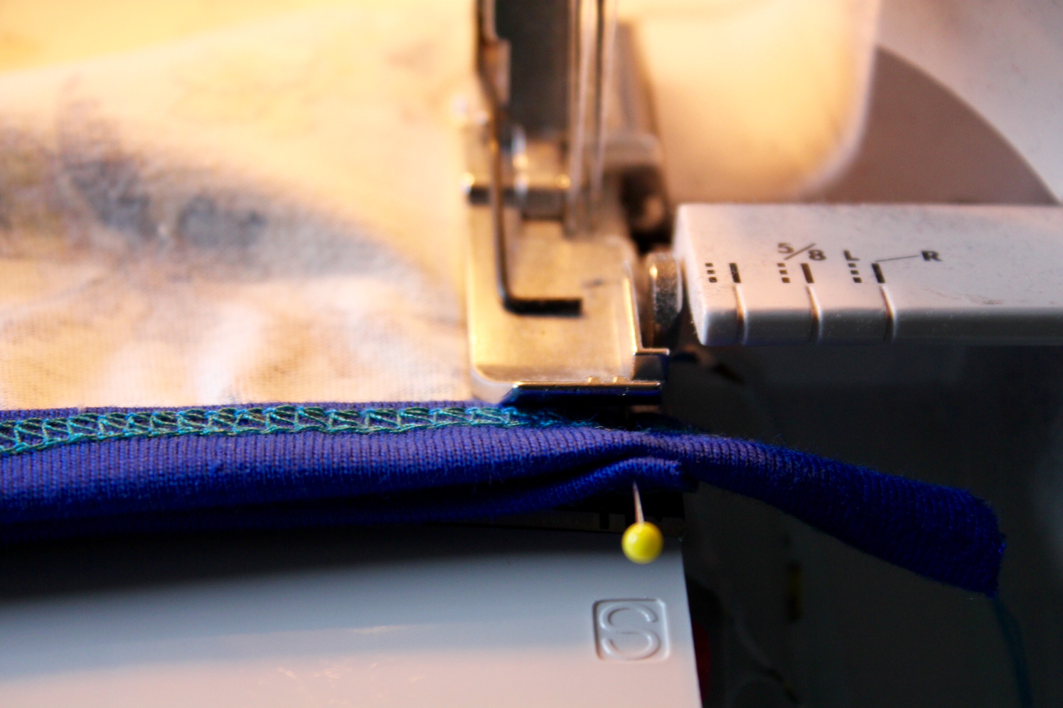 Fadenspannung Nadeln: 4 – 4 – 4, Schalter auf Tight, Greiferspannung: 3, Differential: 1,5, Stichlänge 3,5 – 4.