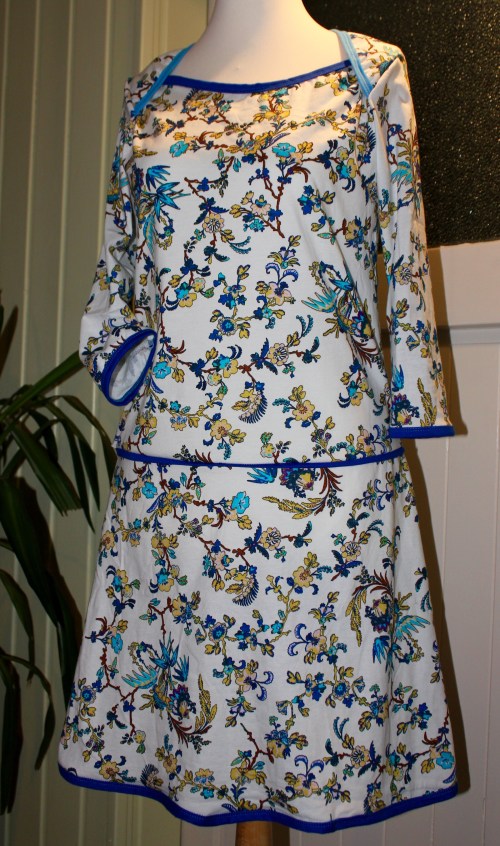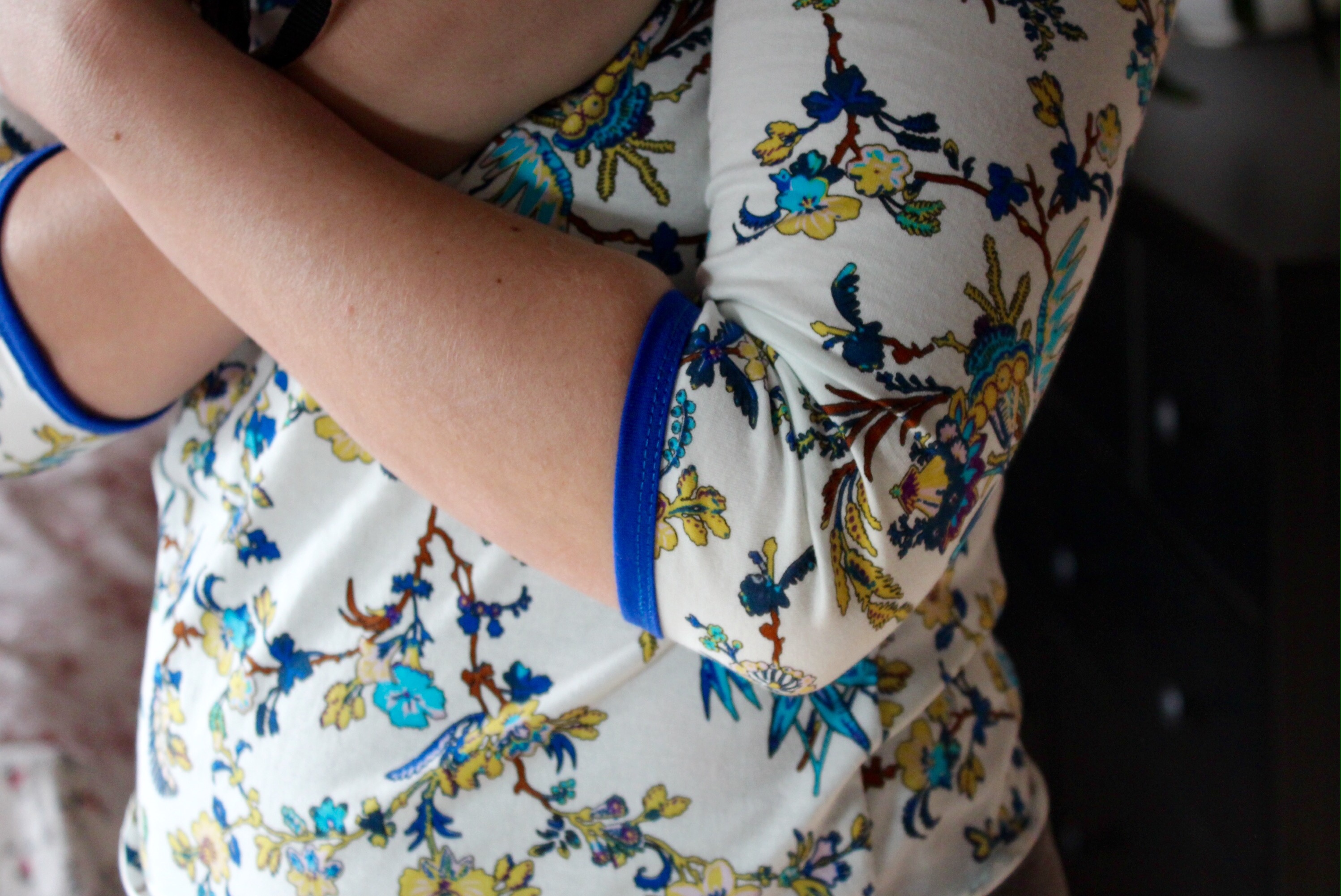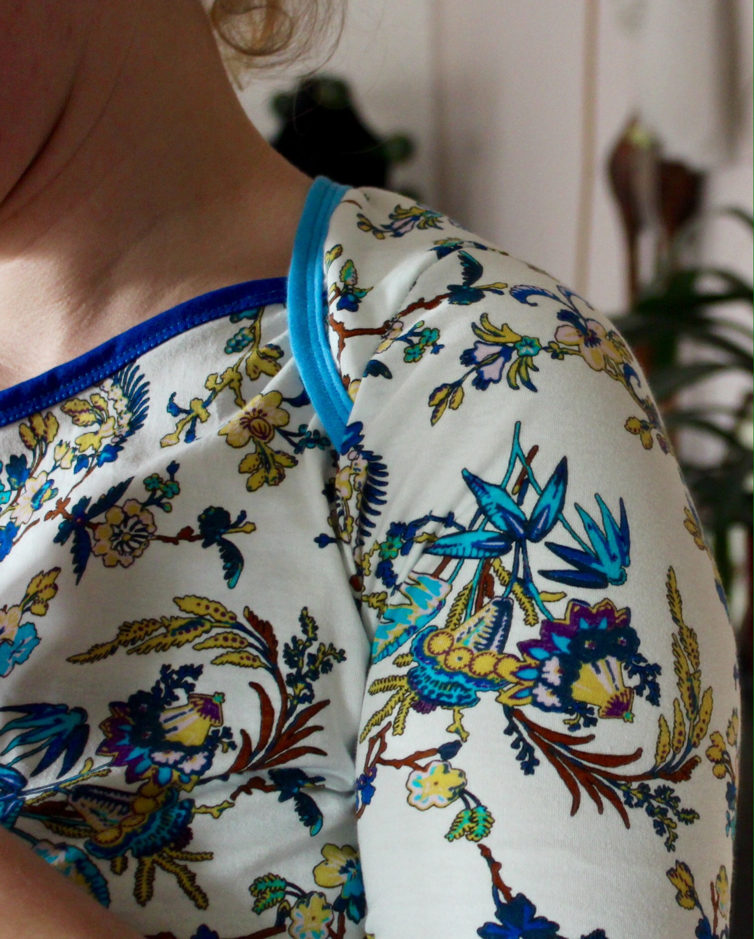 Dazu habe ich ein Stück Jersey benutzt, was ich mal für 1€ in einer hiesigen Textildruckerei erworben habe. Perfekt, da das Muster gar nicht so meins ist war. Mit Band eingefasst habe ich die Schulterpartien und die Ärmelsäume. Wir man hier sehen kann, ist mir der Ärmel etwas zu eng.