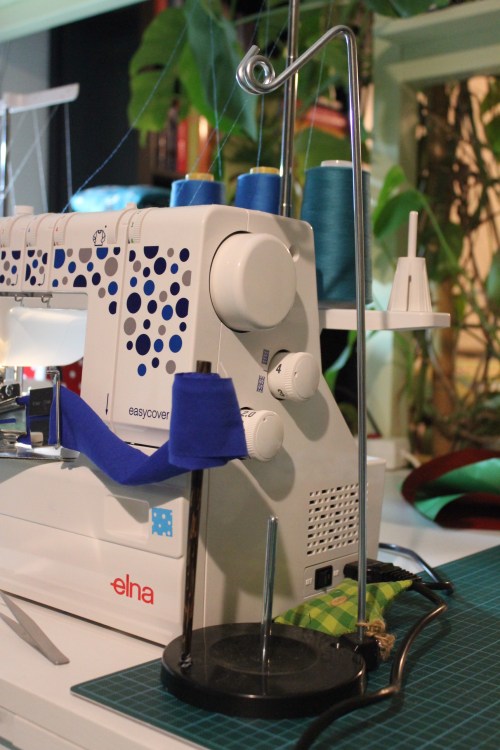 Dann habe ich einfach meinen Konenhalter benutzt, den ich mir mal für meine Nähmaschine gegönnt habe. Der hat ein zweites Loch, in den perfekt ein chinesisches Essstäbchen passt. Zum Abrutschen des Bandes habe einen (hier nicht sichtbaren) Gummi drunter gesteckt.