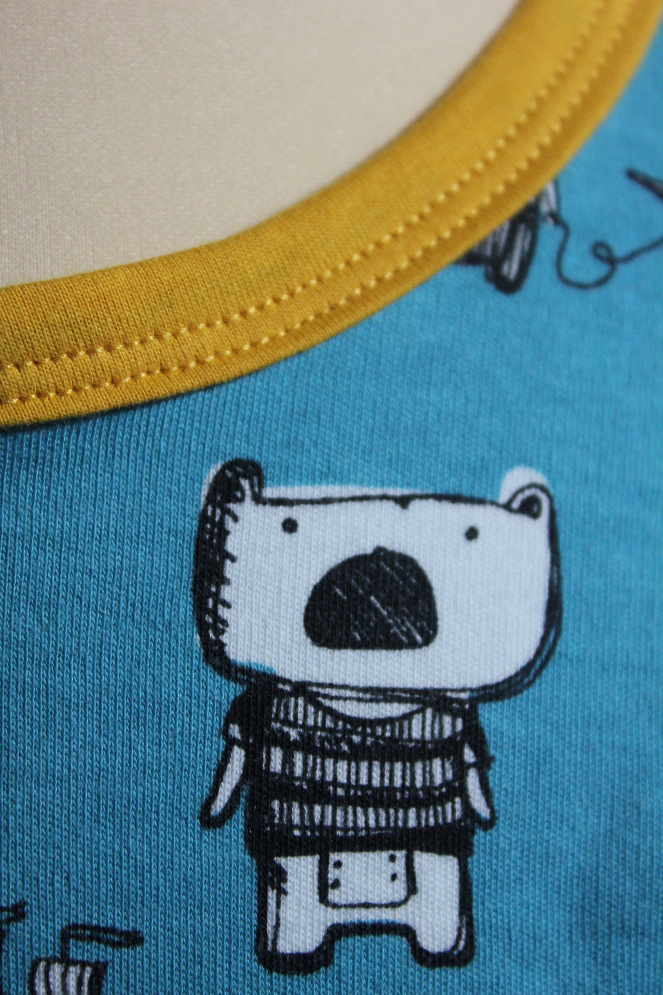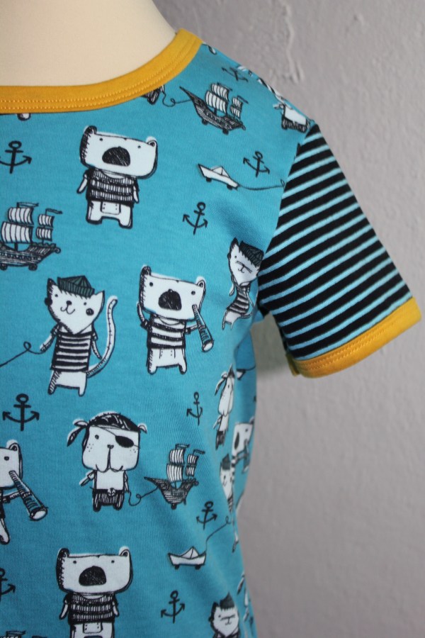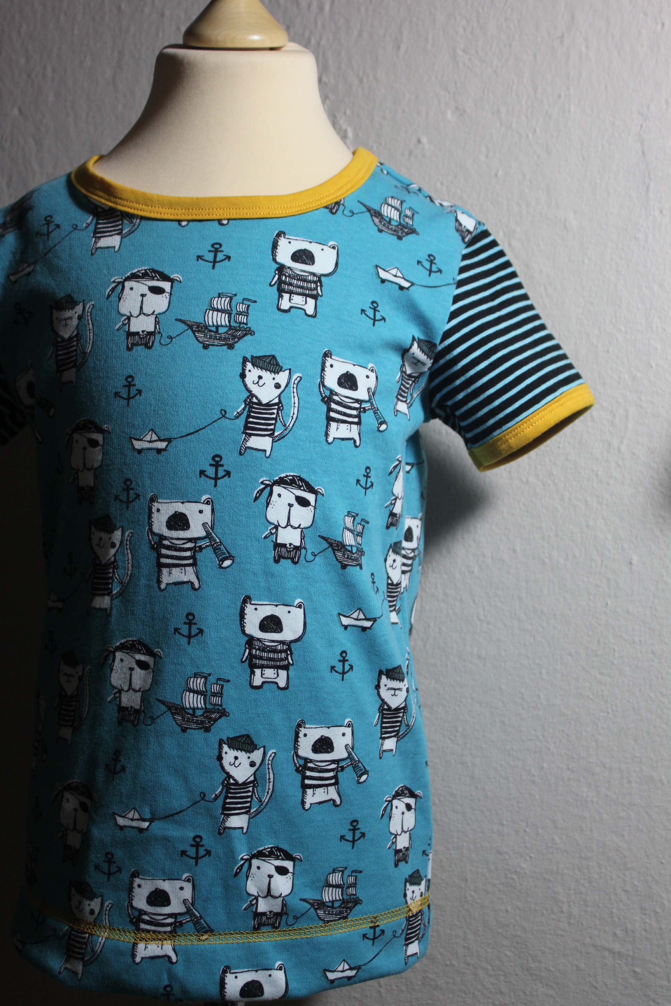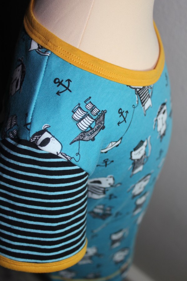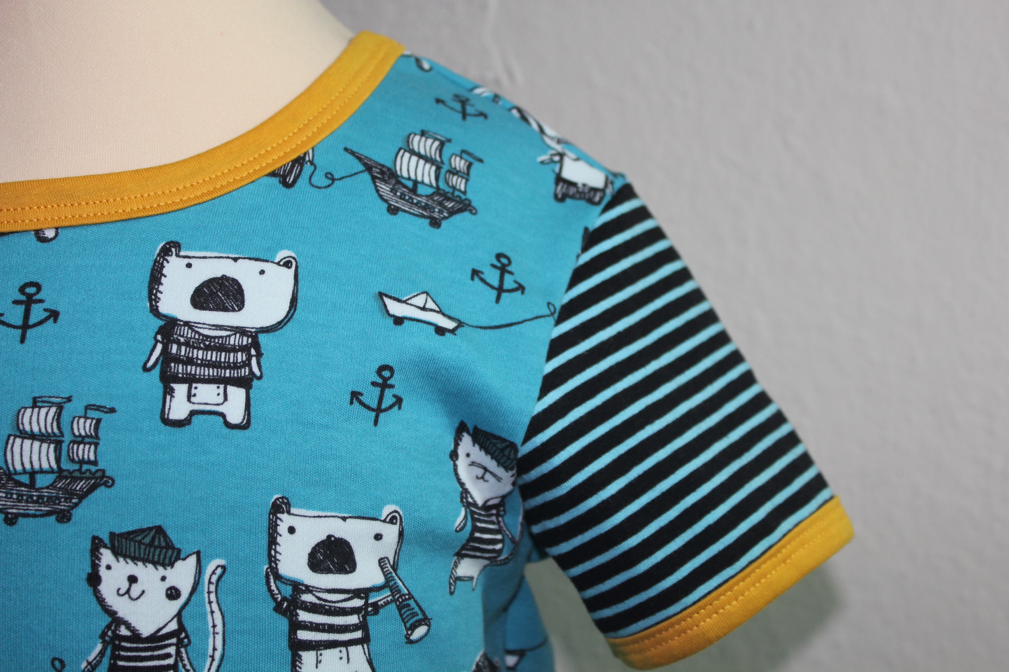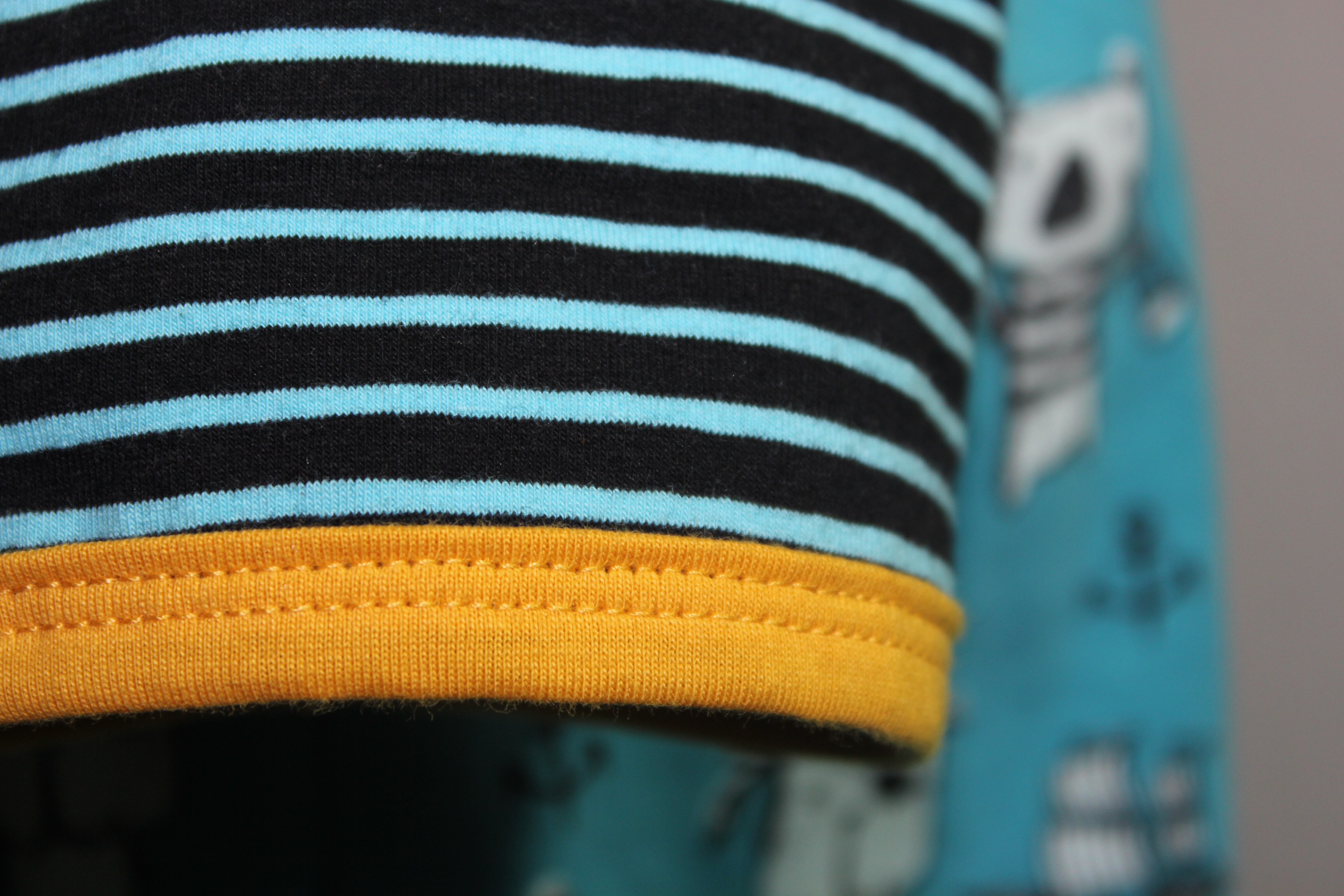Sowohl farblich als auch vom Motiv her ist das eine wunderschöne Kombination für ein weiteres Oberteil für die Sommerkollektion für den großen Hasen. Die Bündchen habe ich wieder mit dem Bandeinfasser, diesmal in senfgelb, eingefasst. Ein perfektes Shirt für unseren Segelurlaub im Sommer.
