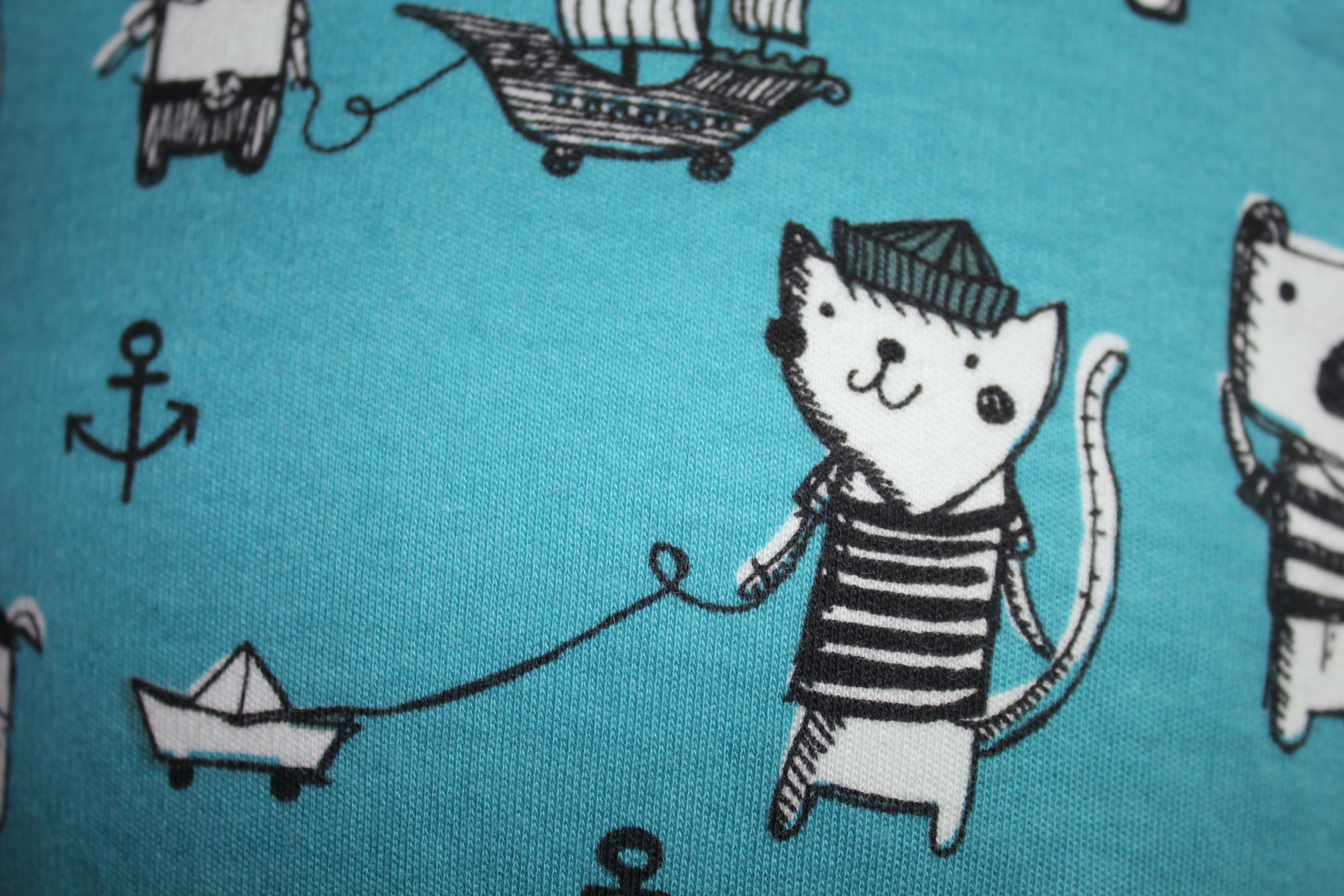 Auf dem Stoffmarkt in Dresden war mit ein blassblauer Jersey in die Hänge gefallen, den ich so noch gar nicht gesehen hatte. Er nennt sich „Kritzel Ahoi“ und ist eine Eigenproduktion von Stoffe4you. Es gibt ihn im Netz leider nur noch in gelb.