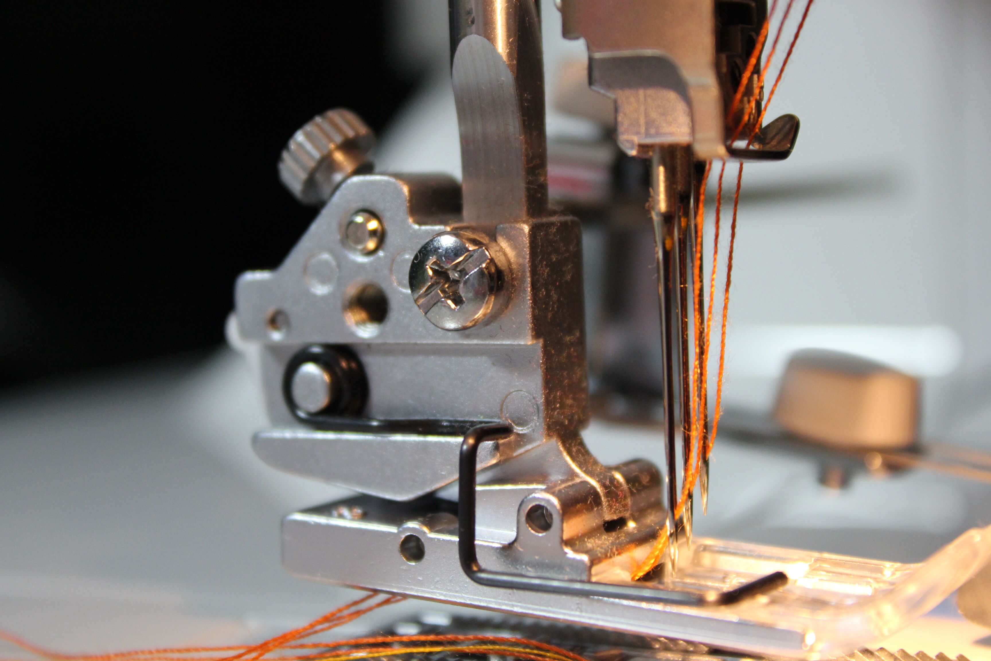 Es gibt zwei weitere Schrauben zur Einstellung. Löst man die obere, hintere Schraube, so kann die Nahtführung seitlich verschoben werden. Hier seht ihr den minimal einstellbaren Abstand, wenn man den Mittelkantenfuß verwendet (ich benutze diesen ohne die Führungsschiene anstatt des Klarsichtfußes). Näht man damit, erhält man eine sehr schmale Saumbreite von etwa 1,5cm. Die Führung kann beim Nähen mit einem normalen Nähfuß bis ganz an den Nähfuß herangeschoben werden.