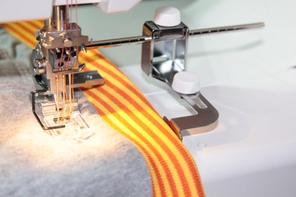 Wenn man mit der Cover zum Beispiel den unteren T-Shirt-Saum nähen möchte, gibt es mehrere Möglichkeiten: entweder man näht auf der linken Stoffseite. Das hat den Vorteil, dass man genau an der umgelegten Stoffkante entlang nähen kann, weil man diese ja sieht. Dann sieht man außen die verschlungene Covernaht, was oftmals ein gewünschter Ziereffekt ist. Die zweite Variante und die schwierigere ist das Nähen auf der rechten Stoffseite. Viele Coverinnen kleben sich farbiges Klebeband oder einen Haftnotizblock auf die Maschine und führen dann den Stoff an dieser Kante entlang. Ich bisher auch. Somit hat man einen kleinen Anhaltspunkt um eine gerade Naht zu bekommen. Eine professionellere Variante ist die Verwendung der Nähführung. Elna bietet zwei verschiedene Führungshilfen an. Eine davon werde ich später noch vorstellen.