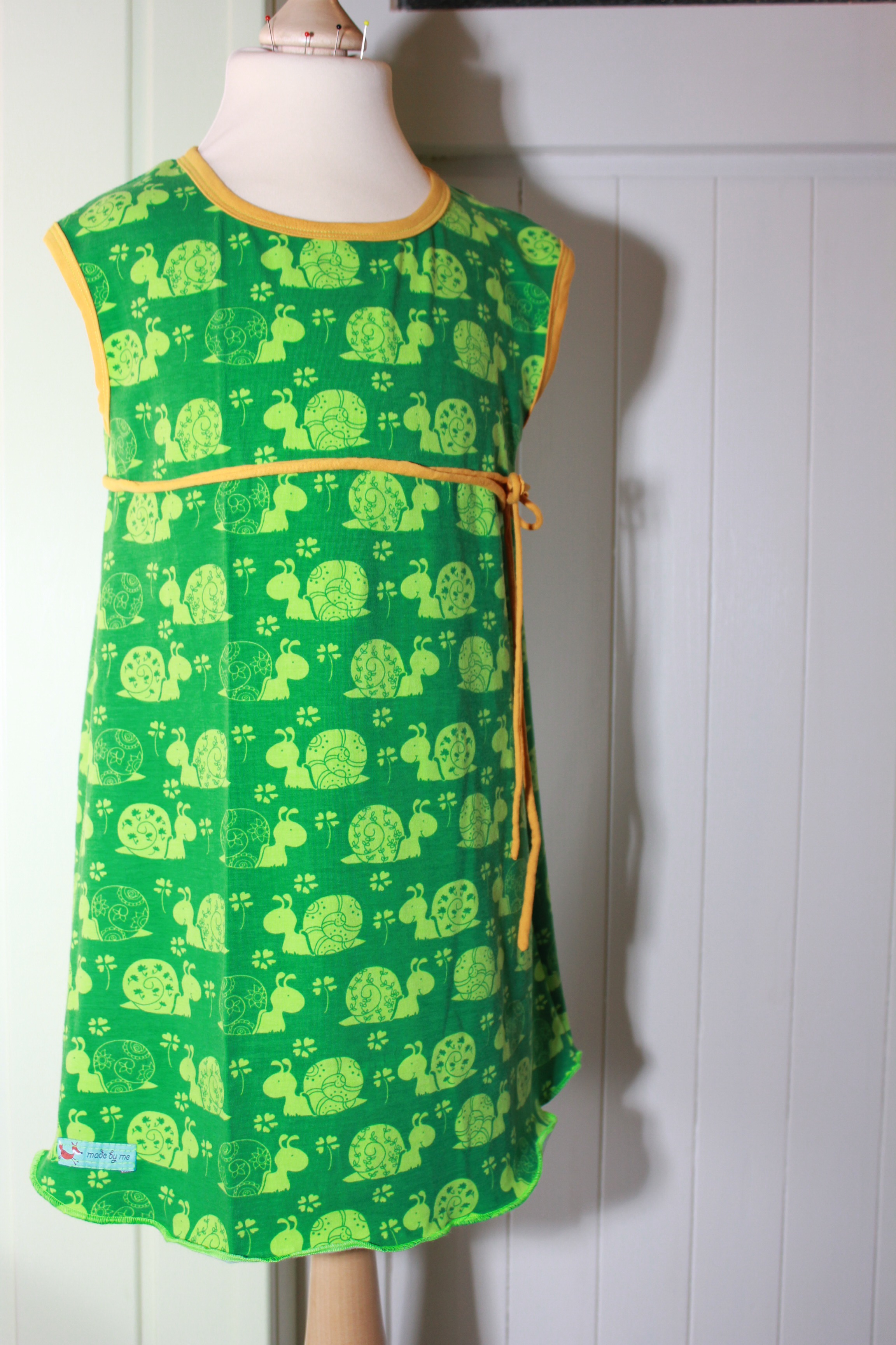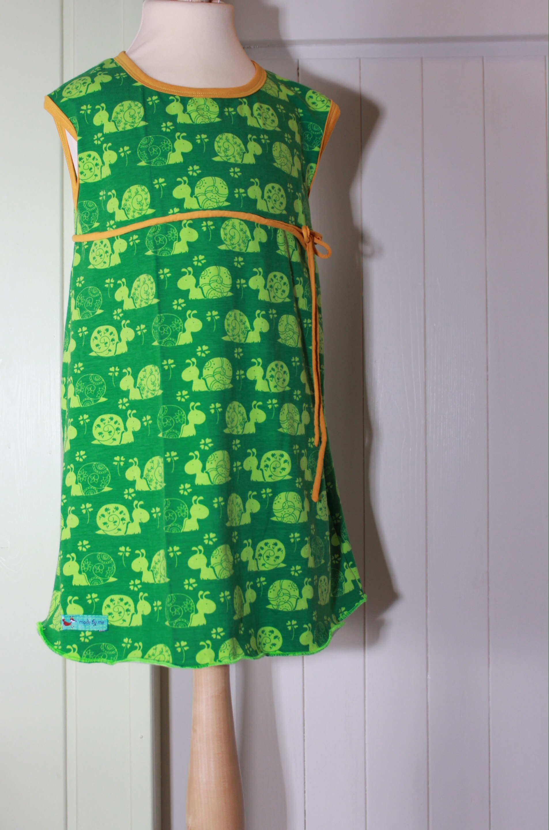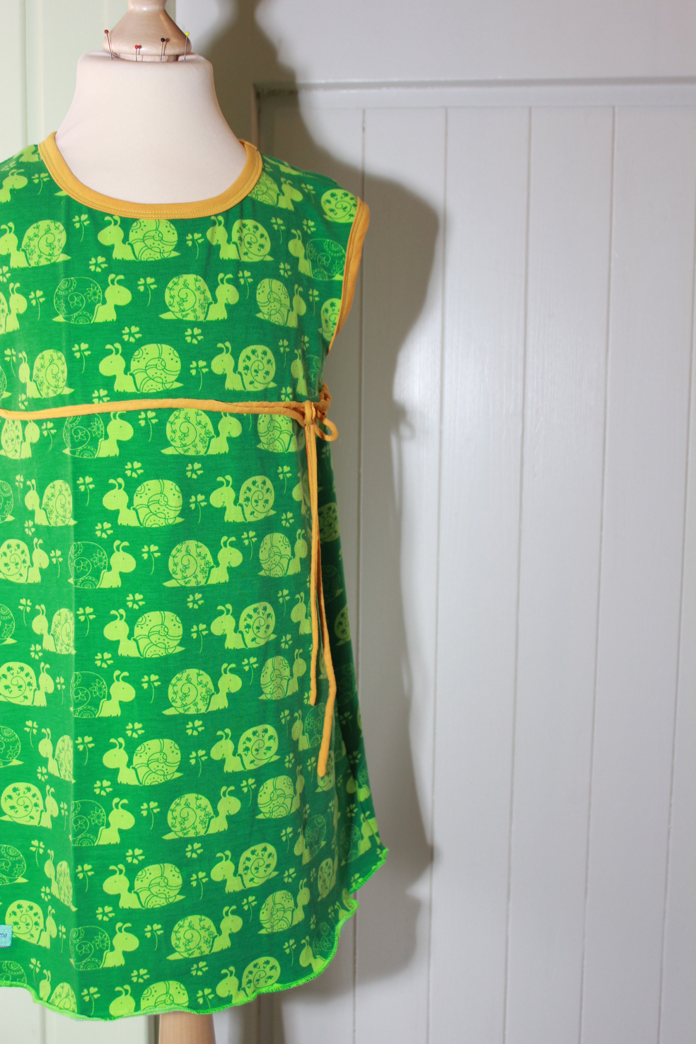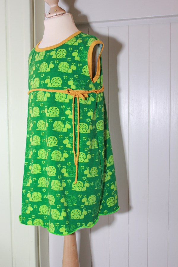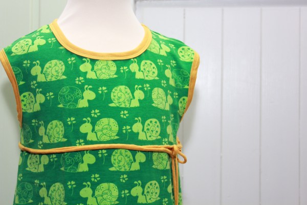 Etwas aufgehübscht habe ich das Hängerchen noch durch ein Jerseyband (was beim Schneiden der Bänder für den Bandeinfasser übrig war). Das wurde mit dem Kettstich der Covermaschine einfach einmal rundherum auf das Kleid aufgenäht. Dabei darf es ruhig etwas ungerade und ausgefranst sein, das ergibt einen schönen Retro-Look.