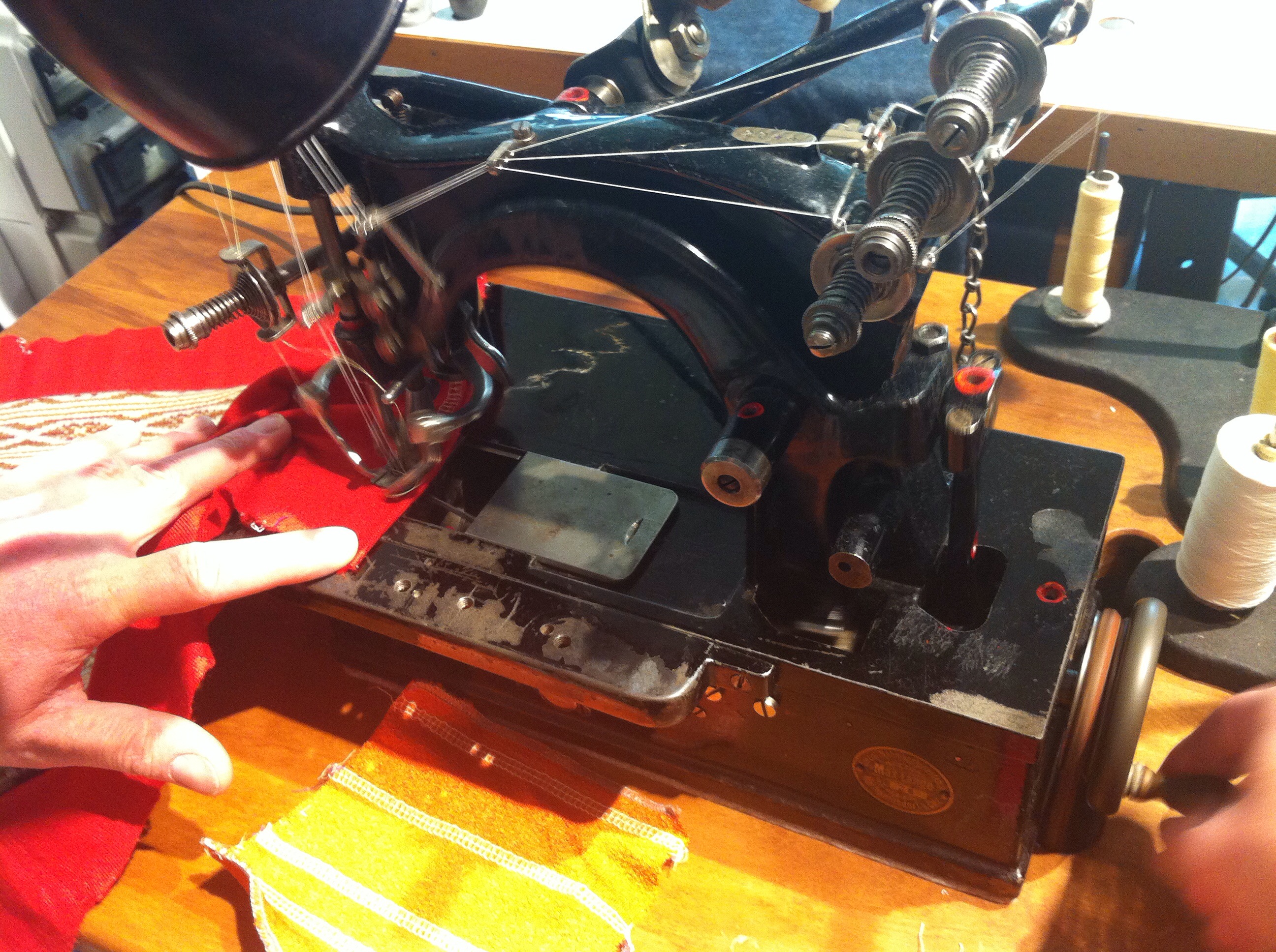 Eine der ersten „Cover“-Maschinen, die 7 Fäden miteinander vernäht. Es arbeiten drei Nadeln und jeweils zwei Greifer oben und zwei Greifer unten.