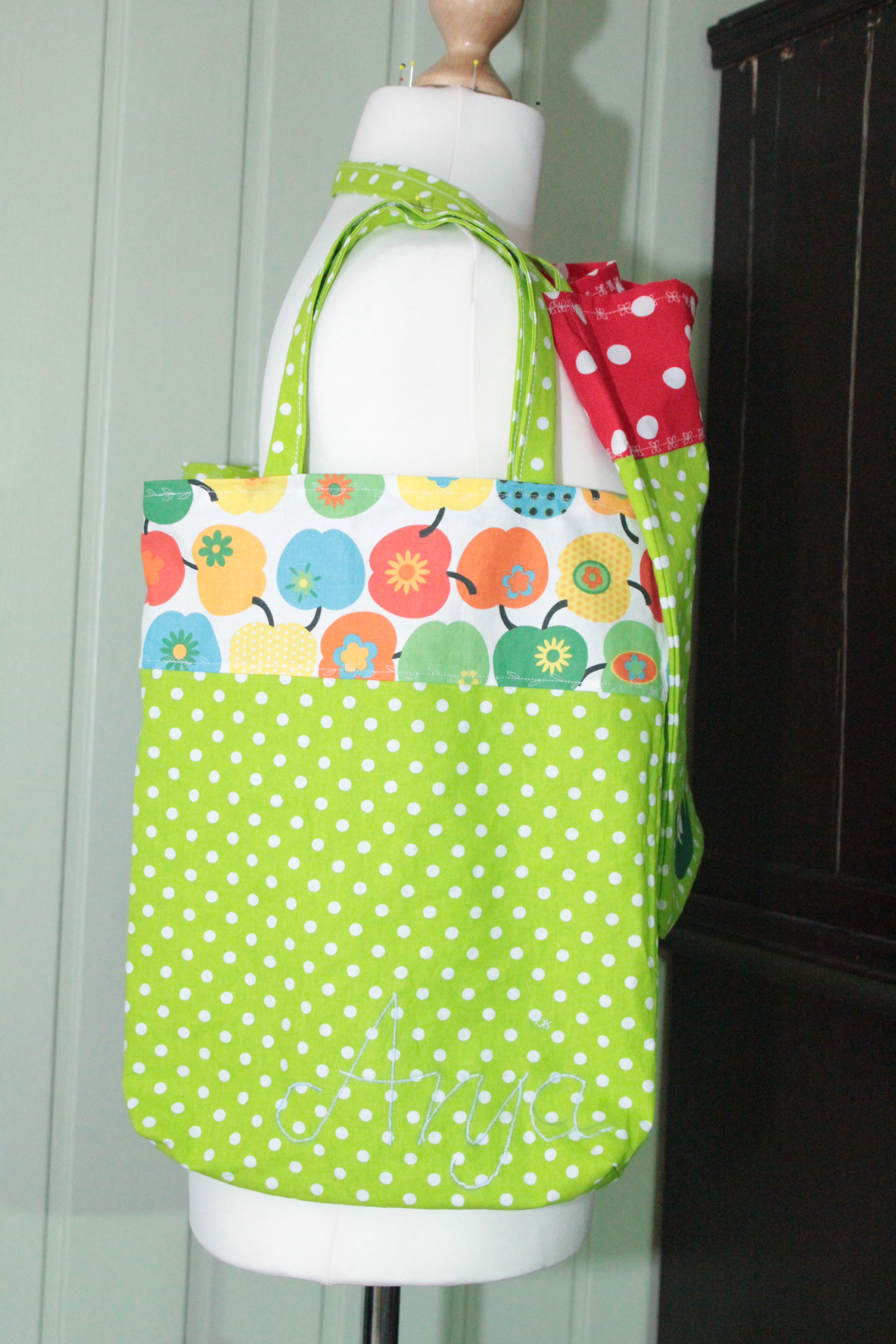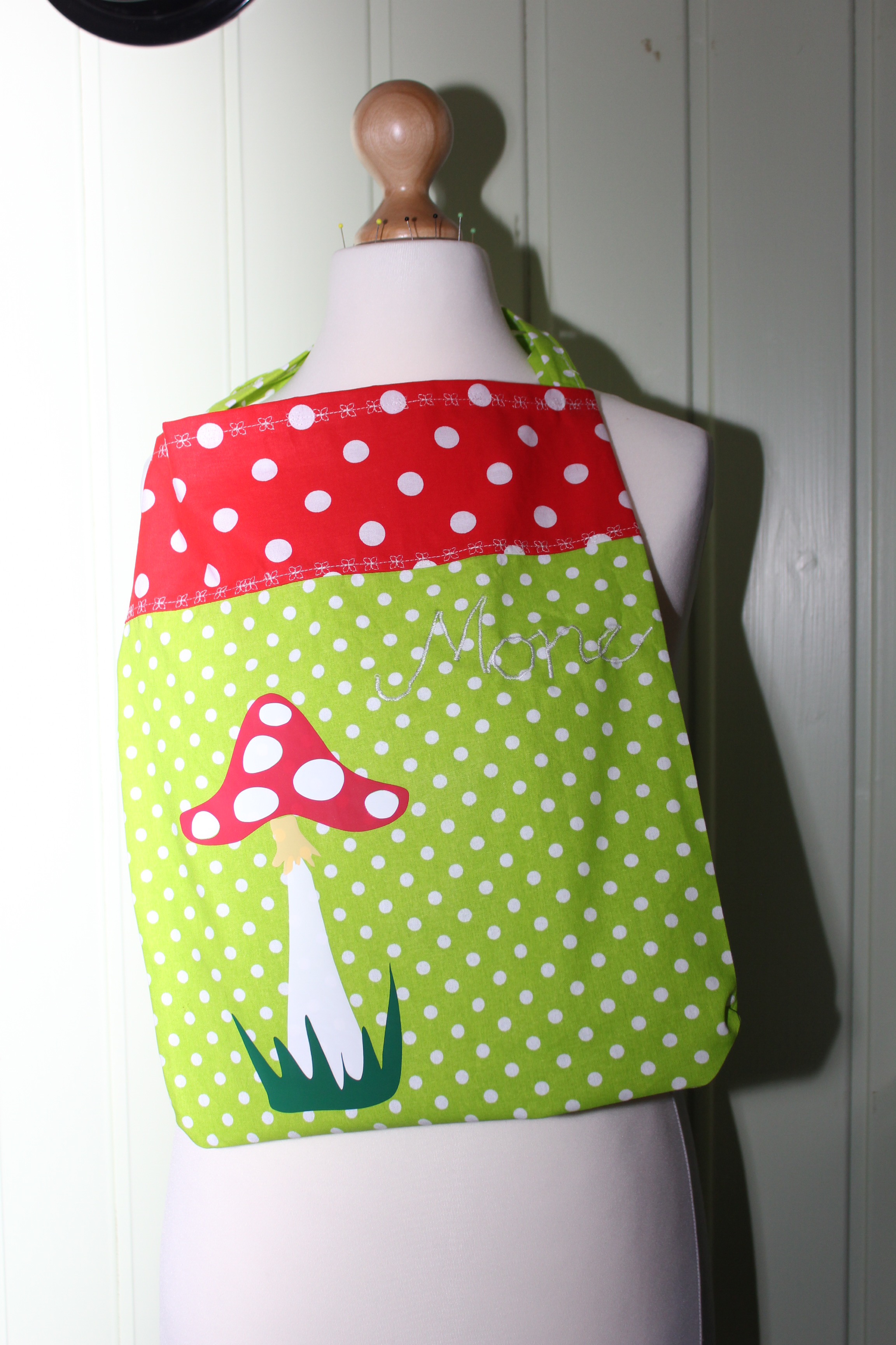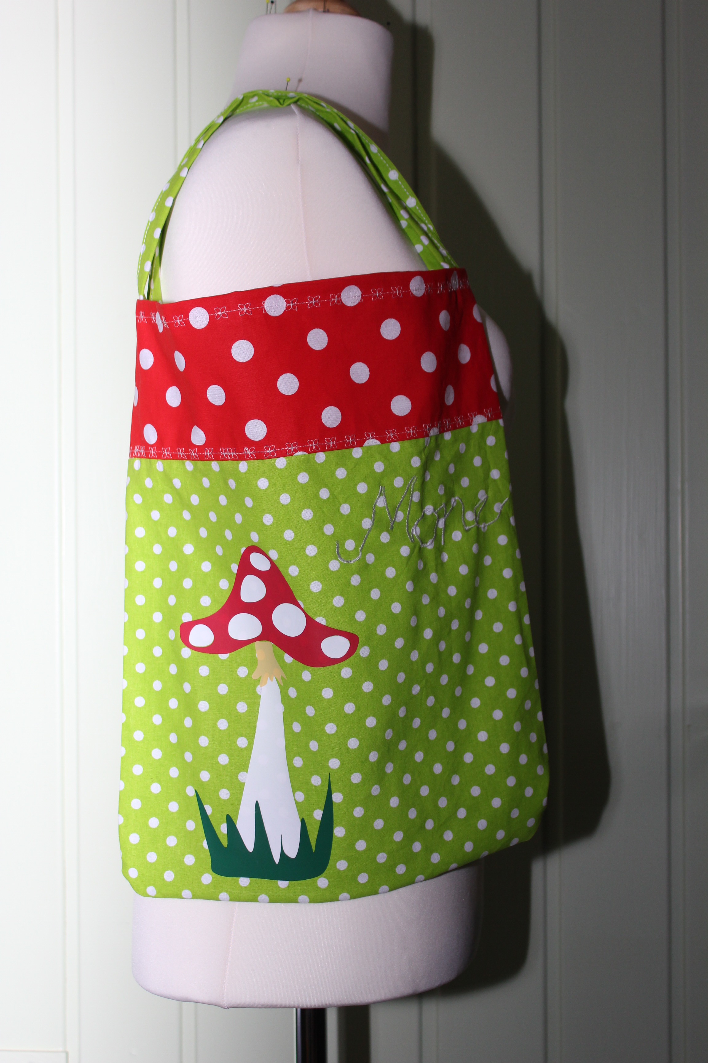 Genäht habe ich eine Tragetasche aus Webware, mit schönen großen Schlaufen zum über der Schulter tragen. Aufgepimpt durch einen Fliegenpilz-Plot.