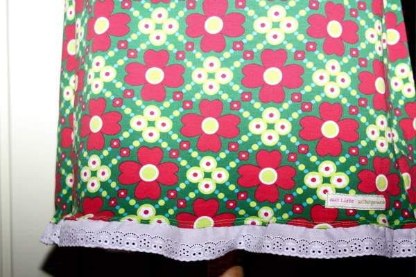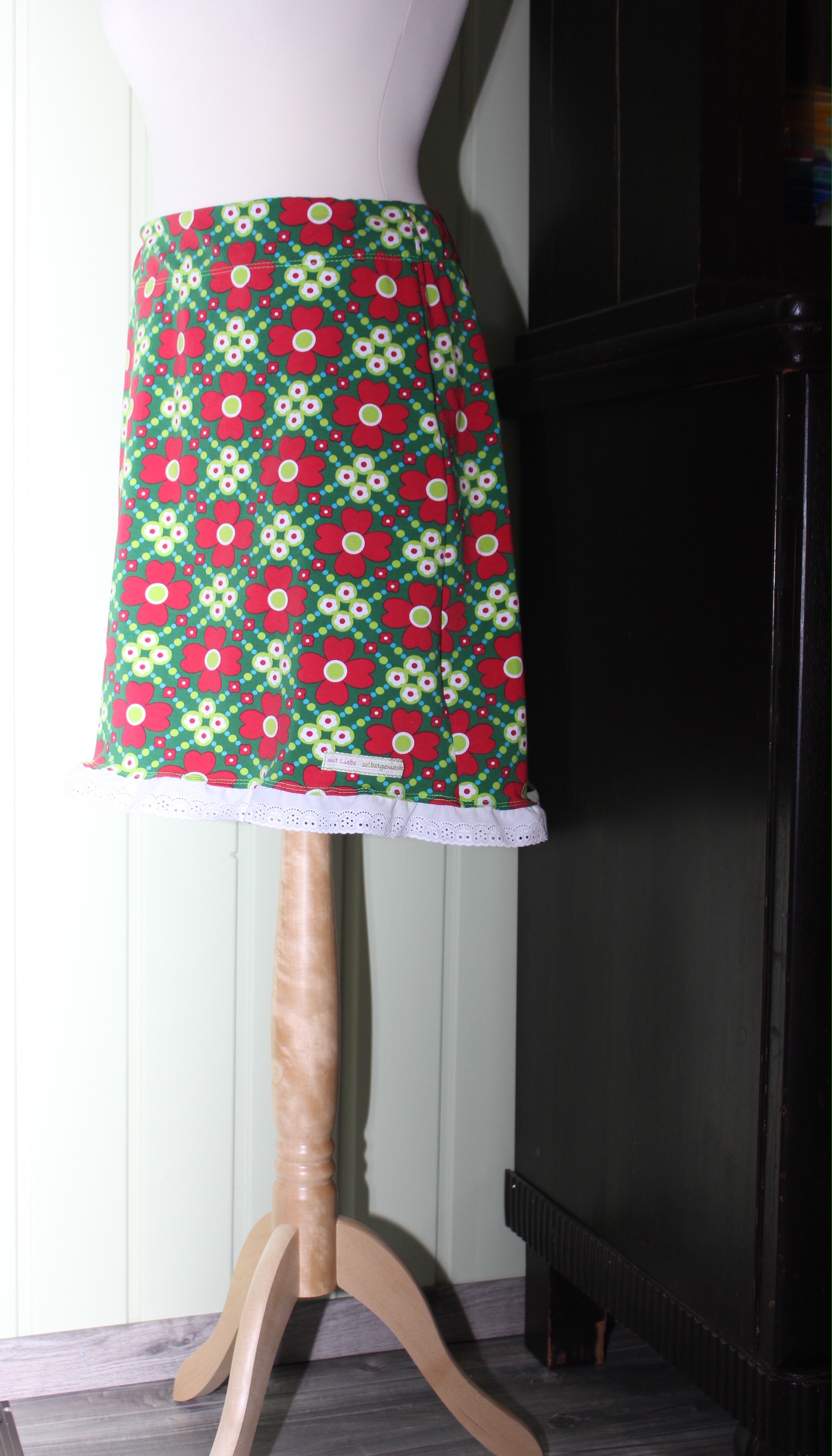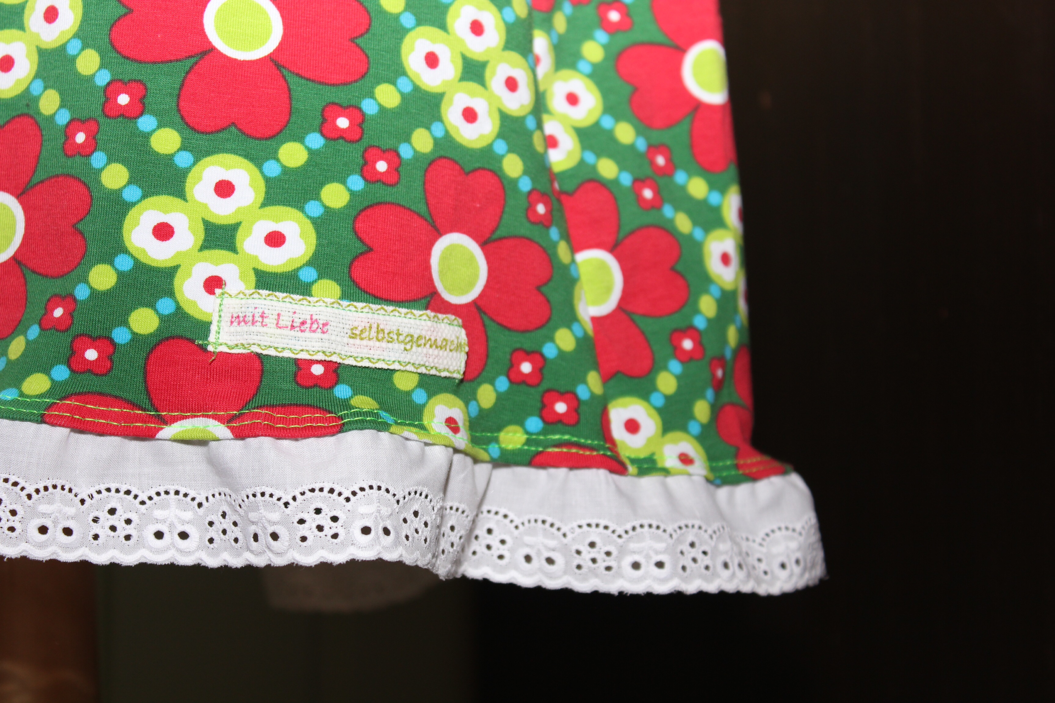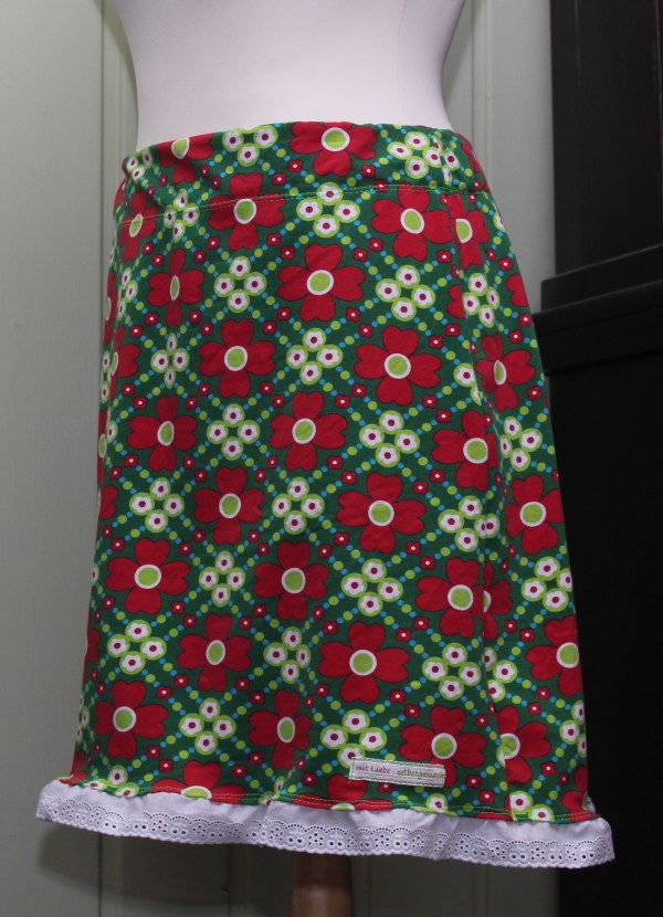 Entstanden ist ein Röckli frei Schnauze, recht schmal über die Hüfte und endet kurz überm Knie. Dann kam mir noch die Idee, eine weiße Baumwollspitze unten ranzunähen. Der Plan war, es sollte aussehen, als ob man einen Unterrock trägt. Blöd nur, wenn man der Coveritis verfallen ist und alles absteppen muss will, nun siehts halt aus wie angenäht. 😦