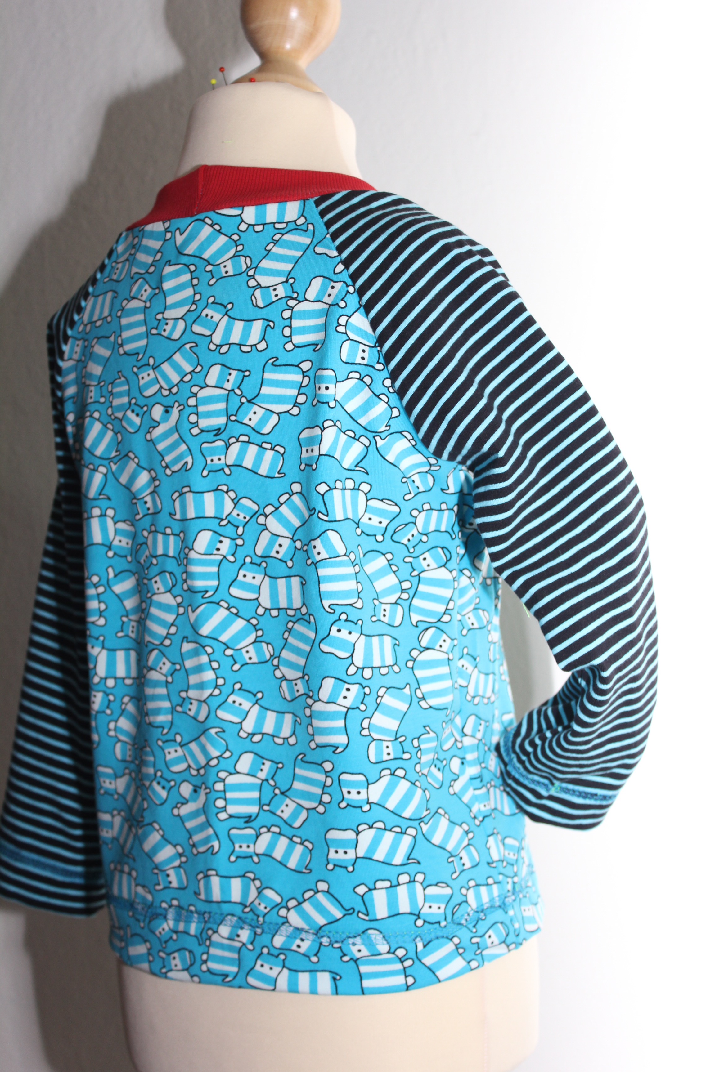 Heute mal wieder ohne viele Worte: es stand ein Kindergeburtstag an und für den kleinen Mann gab es ein blau-schwarz-rotes Raglanshirt nach dem Freebook von Mamahoch2: AutumnRockers. Stoffe waren mal von Michas Stoffecke.
