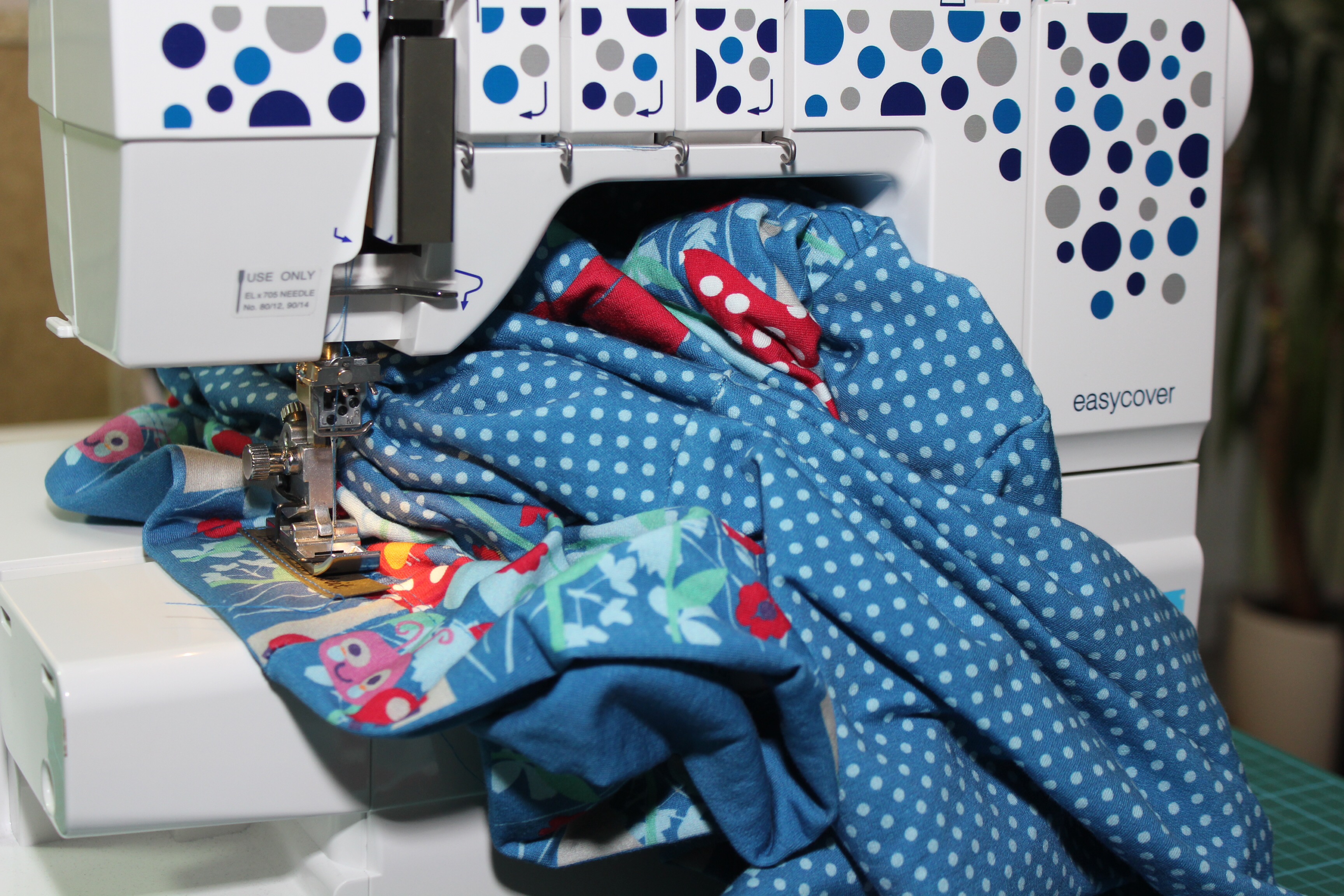 Beim Nähen eines Ladyrockers war ich mal wieder froh über den großen Durchlass der Elna easycover, den da musste diesmal beim Absteppen der Kragennaht der ganze Pulli hindurch. Das war gar kein Problem.