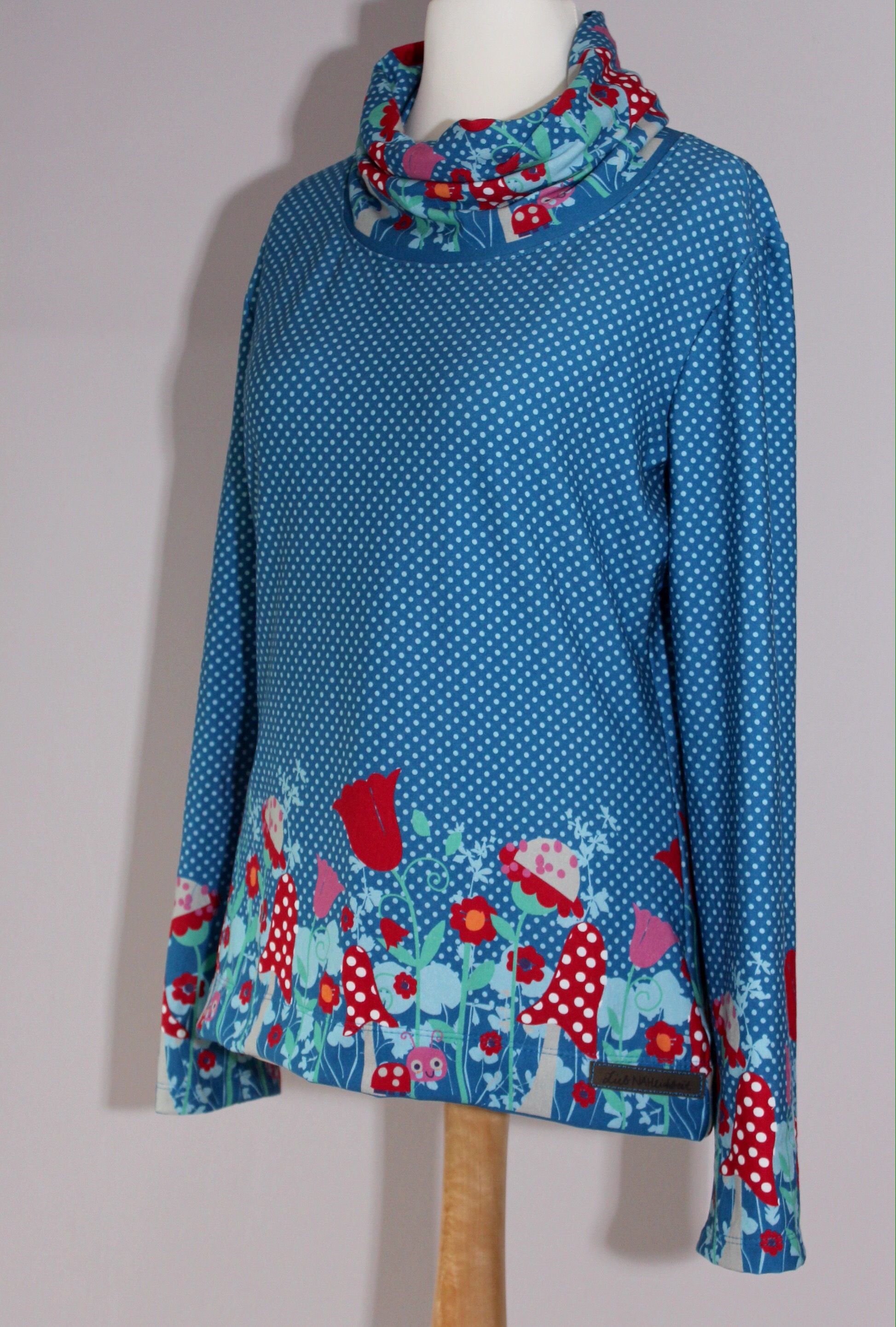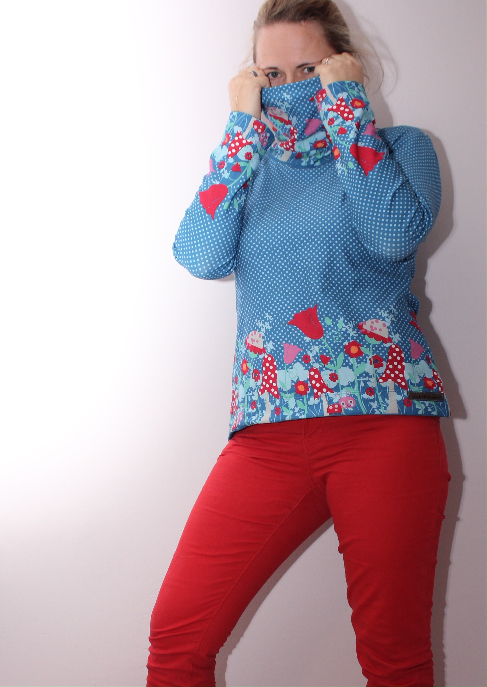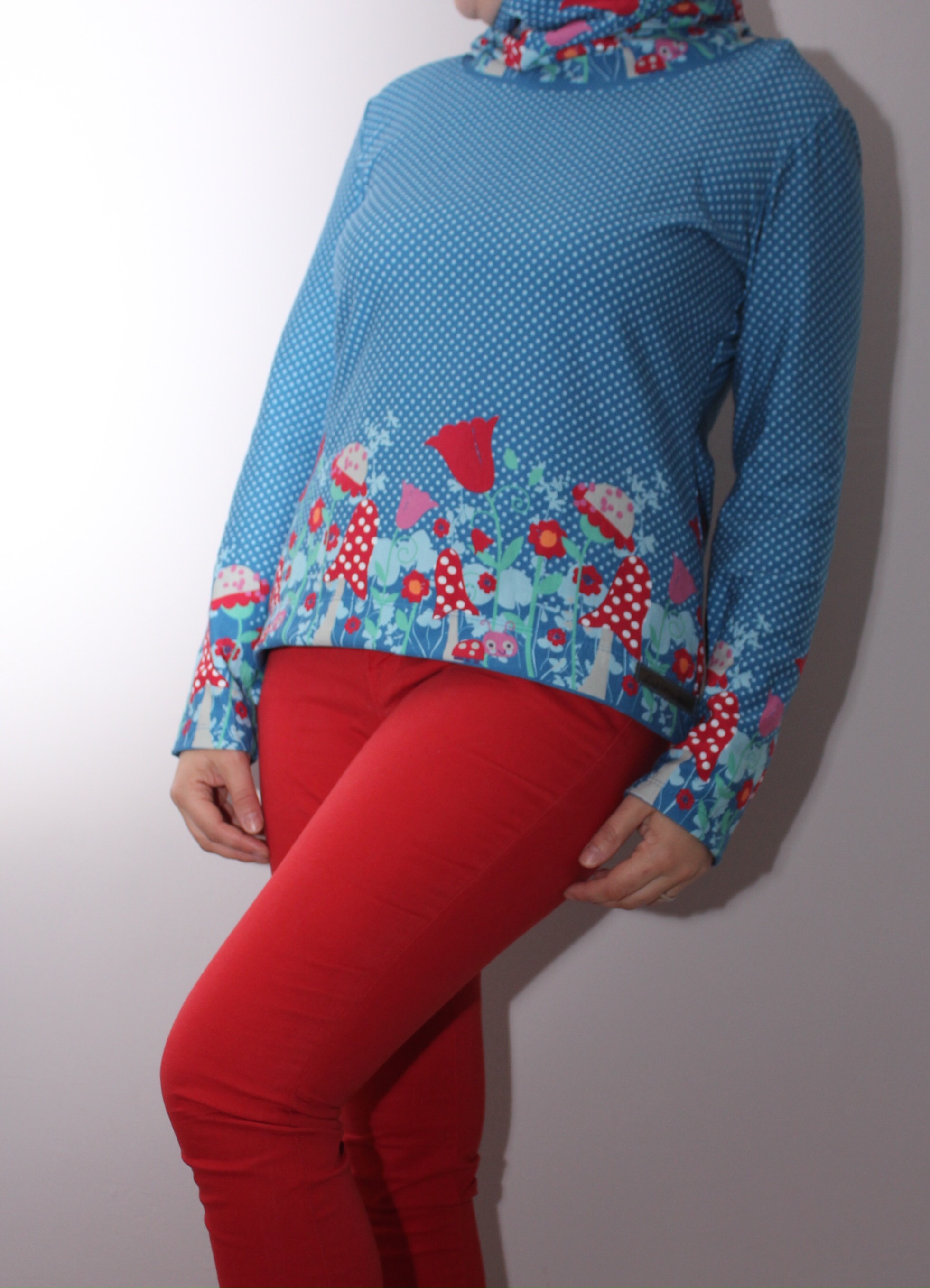 Den Pulli habe ich mit einem großen Kragen aufgepeppt. Dazu habe ich den Auschnitt gemessen und ein Rechteck in dieser Breite (plus Nahtzugabe) in Höhe der Fliegenpilzbordüre im Bruch zugeschnitten. Dann wurde das zum Schlach geschlossen und genau wie sonst das Bündchen einfach mit der Overlock an den Halsauschnitt angenäht. Die etwas ausgestellten Ärmel und der Saum unten wurde umgeschlagen und mit zweifacher Nadel gecovert. Und weil ich so verliebt in meinen neuen Pulli bin, gibts jetzt eine Bilderflut…