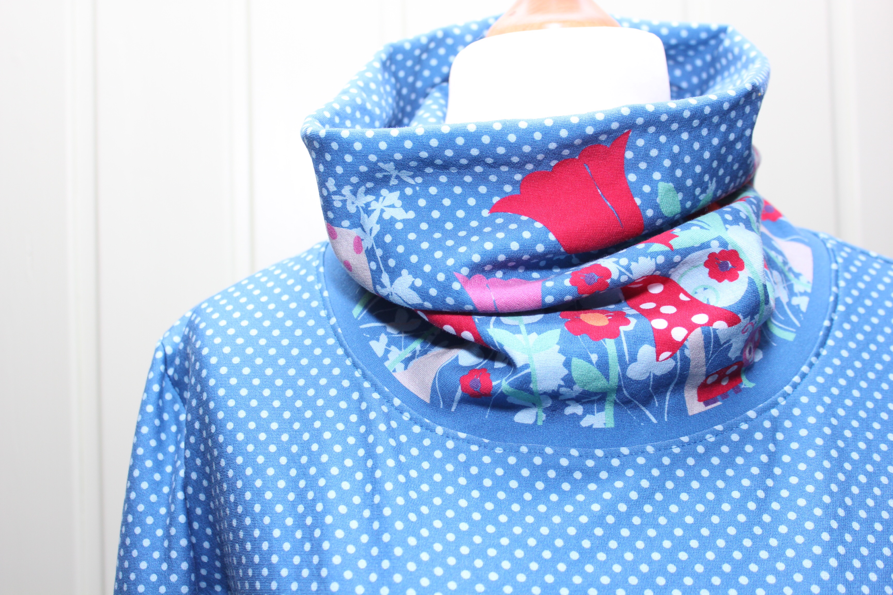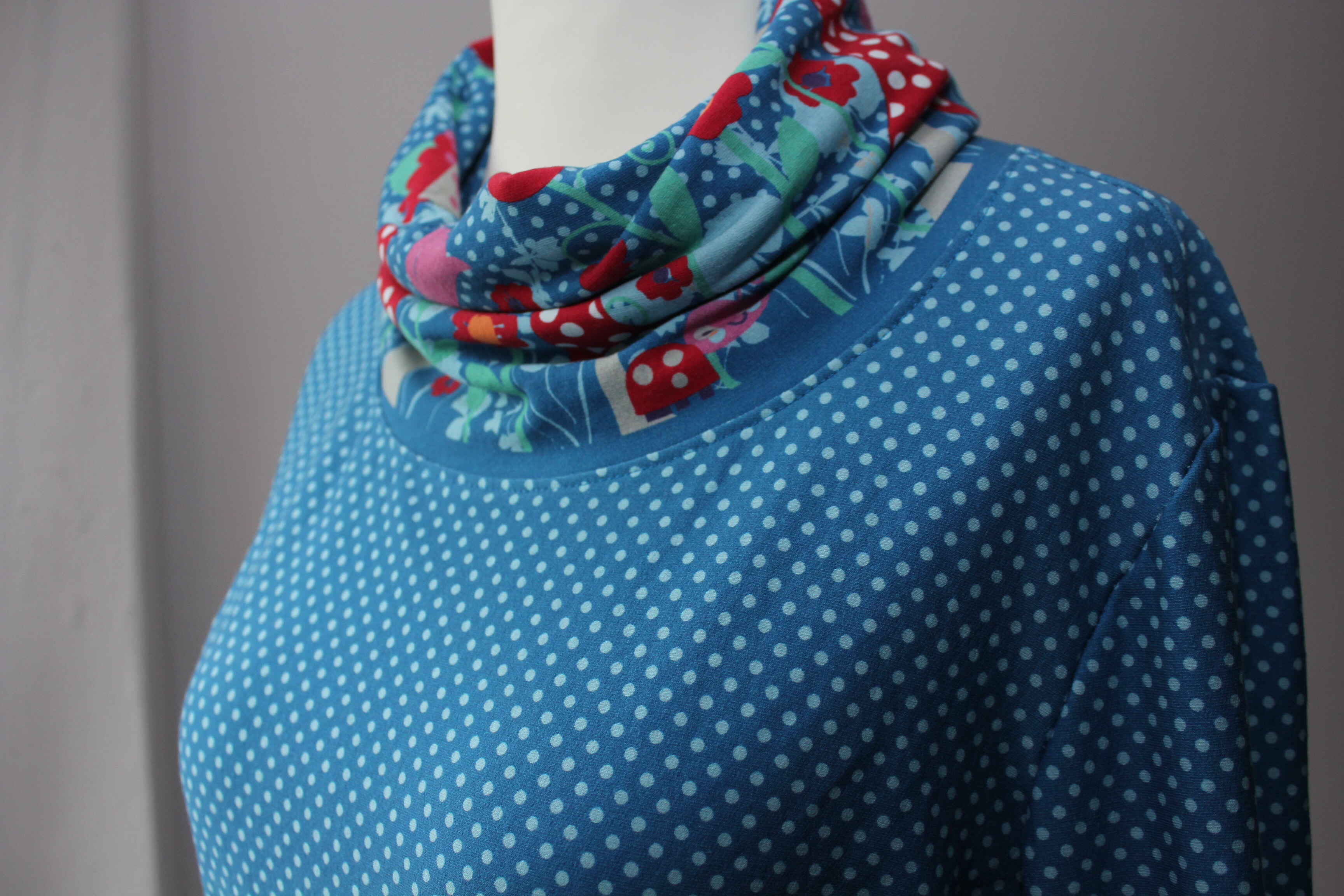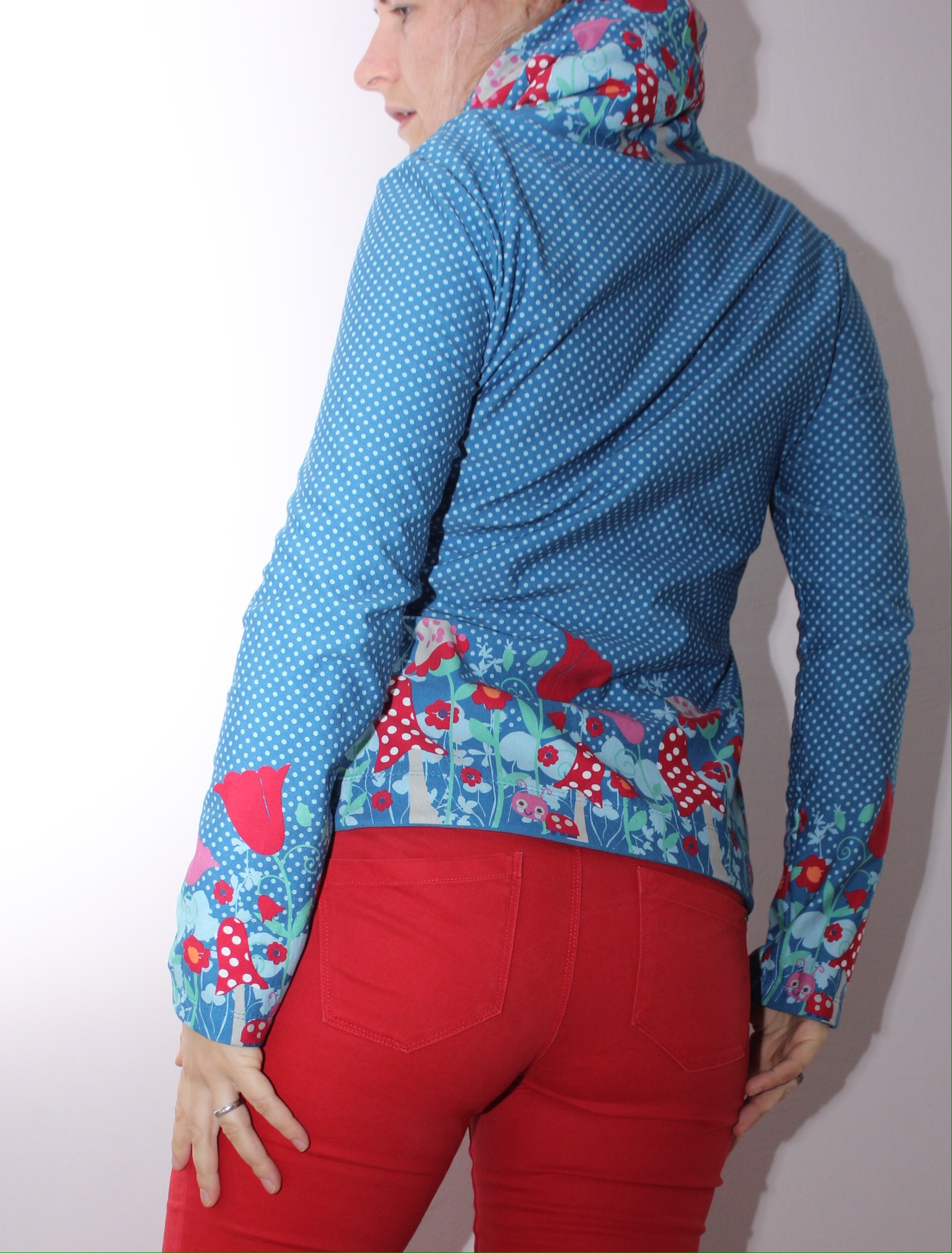 Den Pulli habe ich mit einem großen Kragen aufgepeppt. Dazu habe ich den Auschnitt gemessen und ein Rechteck in dieser Breite (plus Nahtzugabe) in Höhe der Fliegenpilzbordüre im Bruch zugeschnitten. Dann wurde das zum Schlach geschlossen und genau wie sonst das Bündchen einfach mit der Overlock an den Halsauschnitt angenäht. Die etwas ausgestellten Ärmel und der Saum unten wurde umgeschlagen und mit zweifacher Nadel gecovert. Und weil ich so verliebt in meinen neuen Pulli bin, gibts jetzt eine Bilderflut…