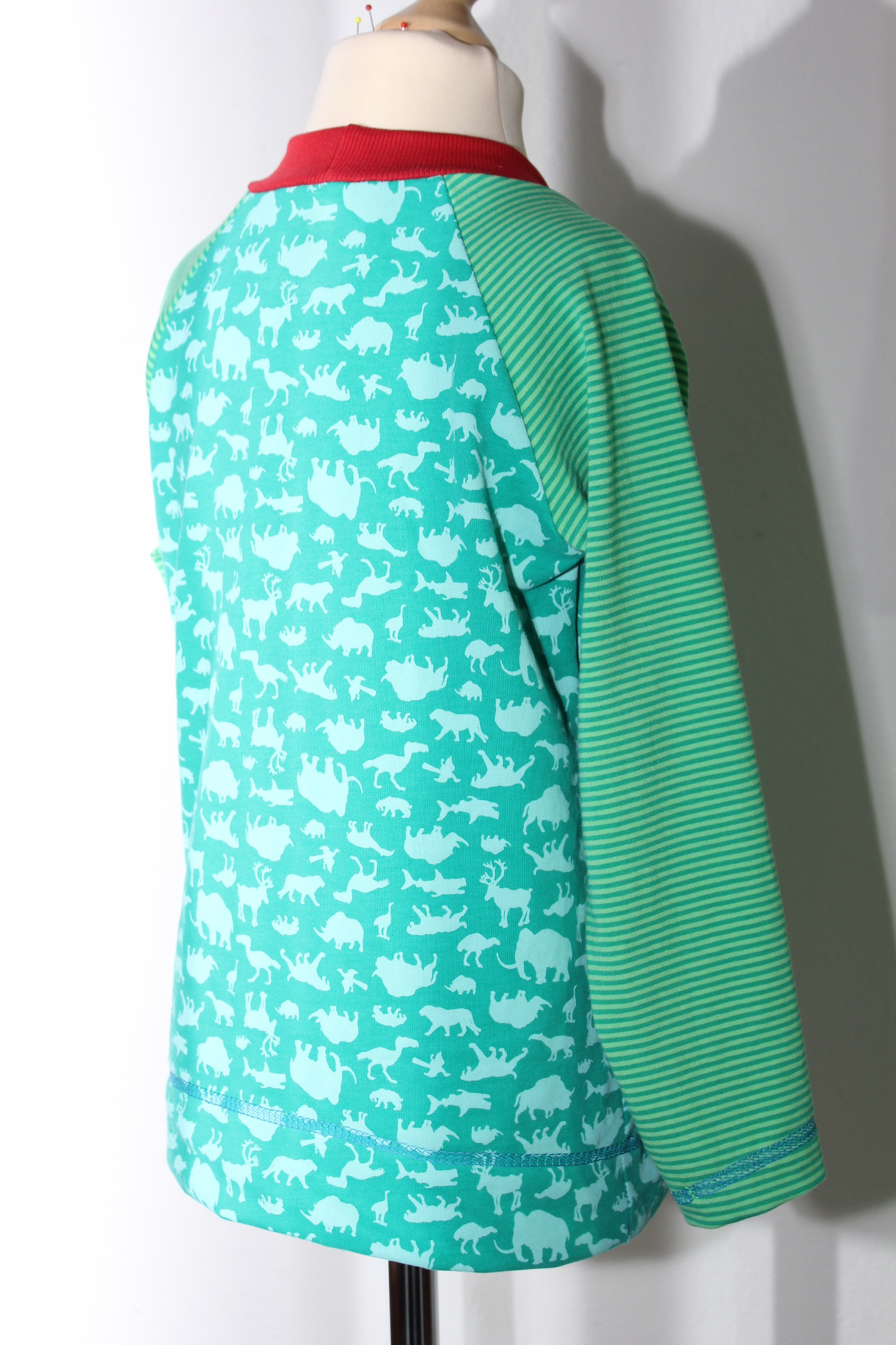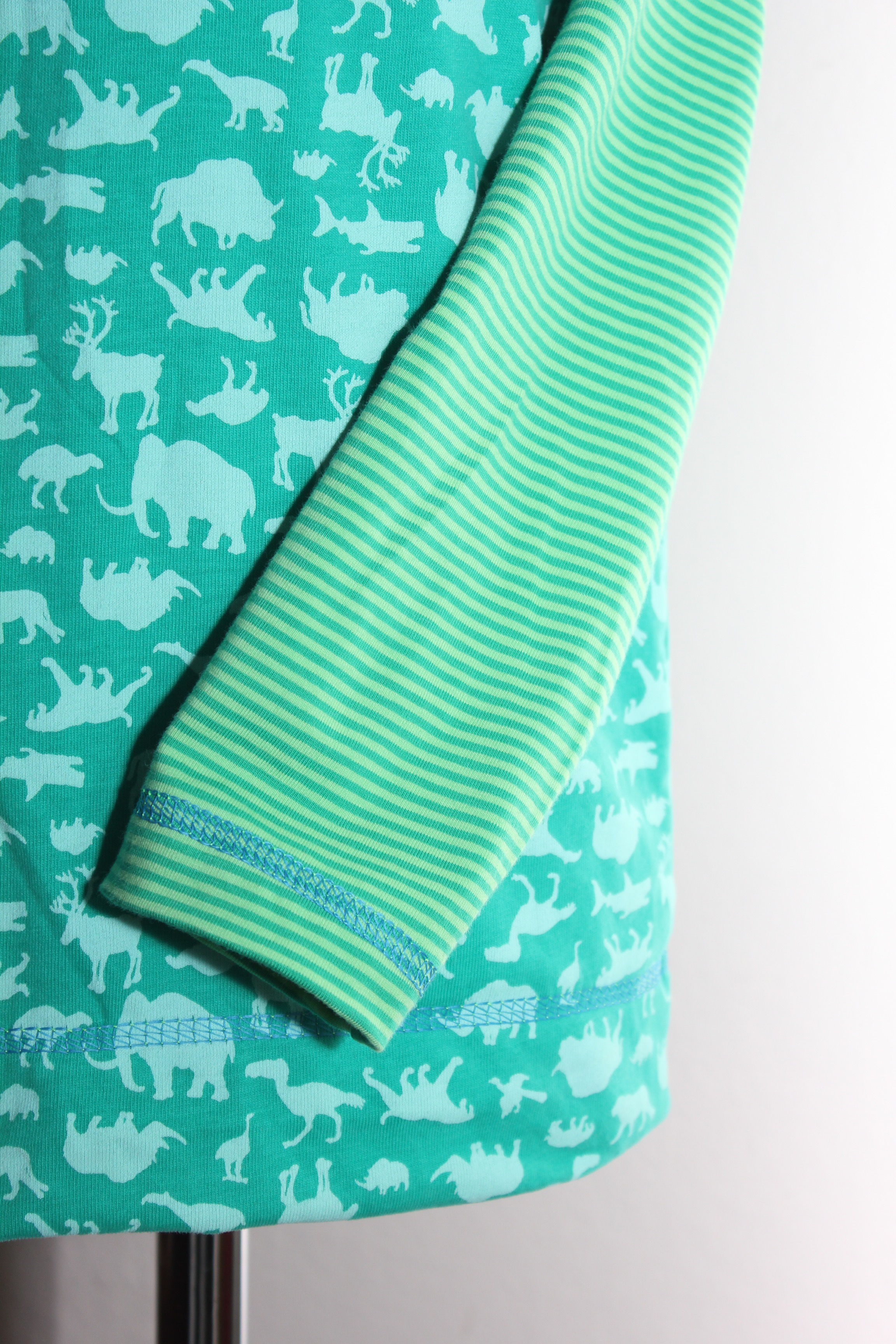 Auch wenn die Grünphase offiziell für beendet erklärt wurde, so findet sich doch im Stofffundus immer noch einiges an grünem Jersey, was vertan werden sollte. Unter anderem der schöne Sanetta-Urzeittier-Interlock. Selten habe ich so einen weichen und festen Jersey in der Hand gehabt, der so tolle Qualität hat. Daraus enstanden ist in Kombination mit grünem Ringel-Jersey vom holländischen Stoffmarkt ein Jonte-Shirt.