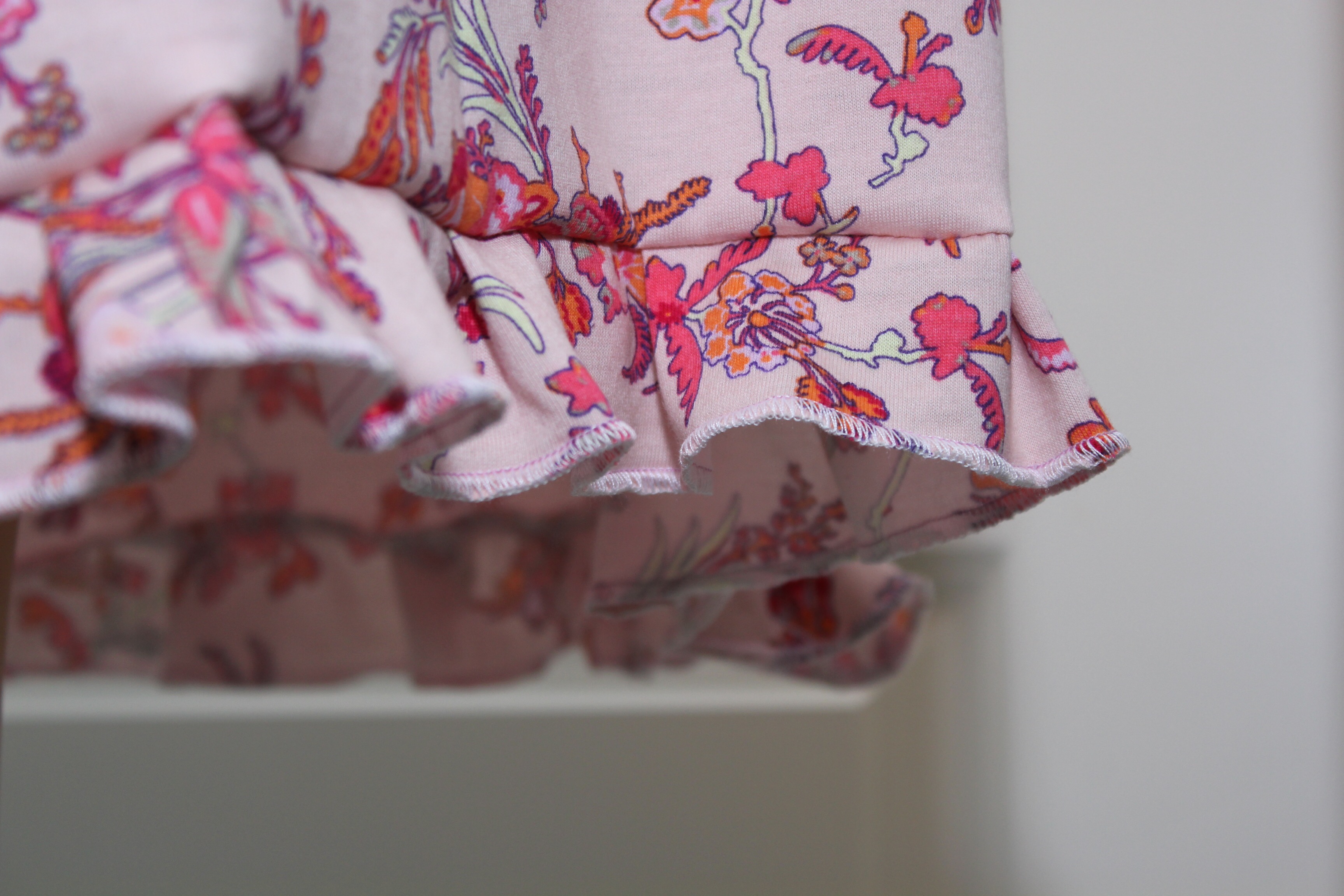 Rollsäume sehen etwas verspielt aus und passen besonders gut zu sommerlichen Rock-, Ärmel- oder Shirt-Säumen. Wenn man sie nach dem Nähen etwas zieht, wellt sich der Stoff leicht. Bei einem Rollsaum wird der Jersey einfach umkettelt, d.h. es bildet sich keine doppelte (schwere) Stofflage und wirkt dadurch besonders luftig.