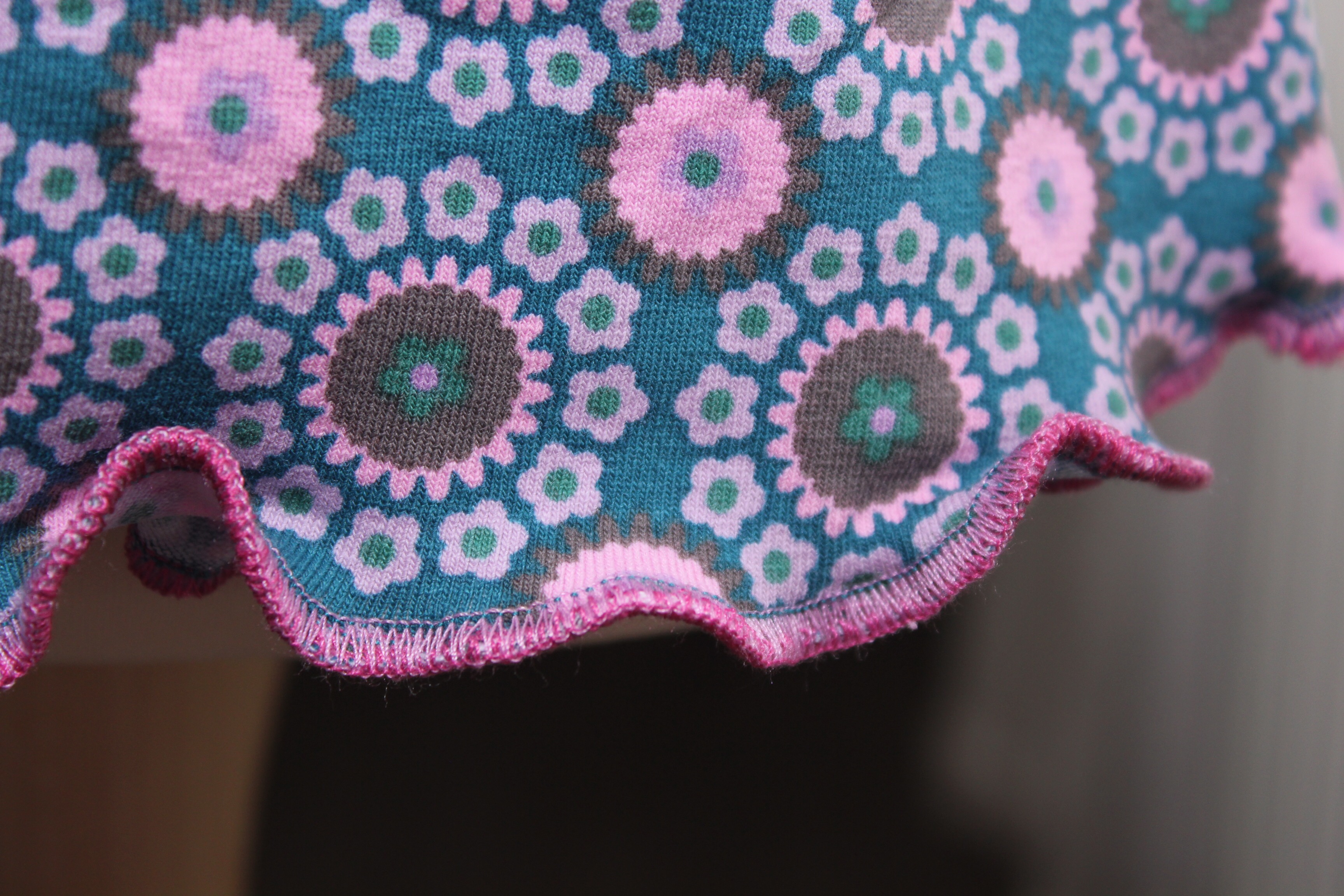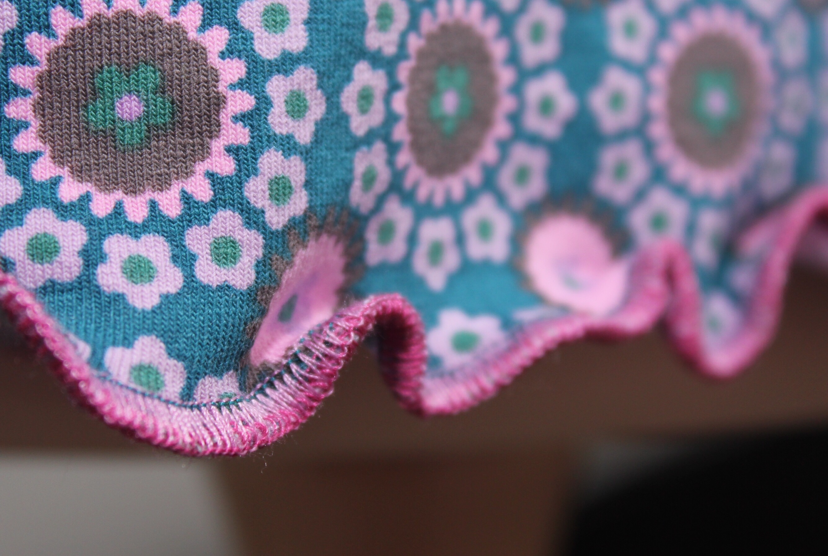 Ihr habt kein passendes Garn für einen Rollsaum, bzw. nicht mindestens drei gleiche Konen? Macht nichts! Experimentiert ein wenig mit ähnlichen oder auch gegensätzlichen Farben herum: hier habe ich zum Beispiel rosa und pink in den Greifern und Petrol in der Nadel gehabt. Weil mir der Stich noch nicht dicht genug war, habe ich den Rollsaum auch nochmal von links genäht. Ergibt ein schönes Farbspiel: