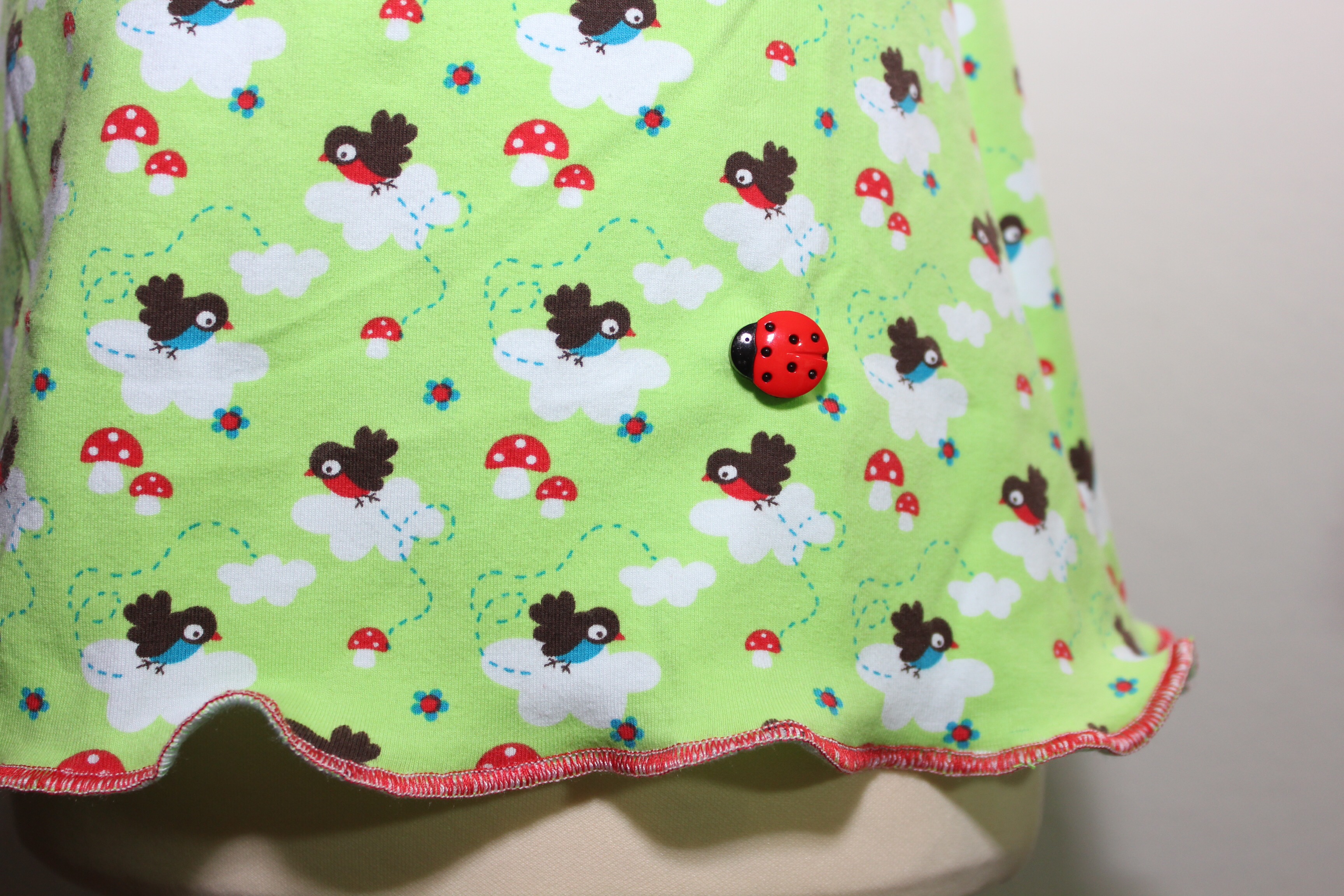 Auf dem Bildchen seht ihr übrigens mal den Unterschied: links wurde von links genäht (also schöne Stoffseite beim Nähen nicht sichtbar) und rechts von rechts (also Stoffmuster sichtbar beim Nähen), beides mit einer relativ groißen Stichlänge. Welche Variante gefällt euch besser? Ich finde die linke Variante schöner, sieht mehr nach „Muschelsaum“ aus.