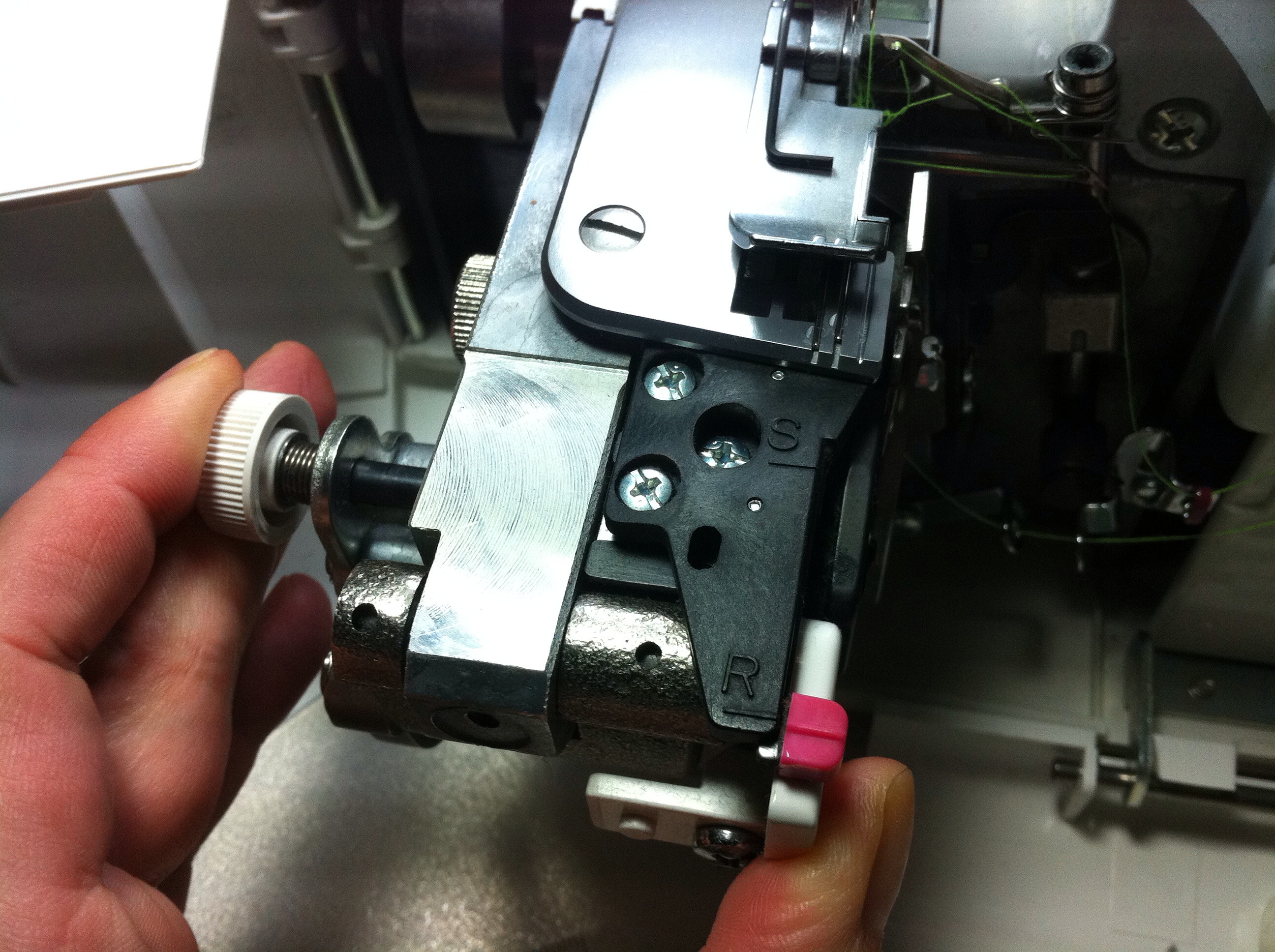 Dann muss der Abkettelfinger eingestellt werden: von der Standard-Position S in die Rollsaumposition R. Das geht wie folgt: zunächst werden Frontklappe und Seitenklappe geöffnet, dann das das Obermesser nach unten weggedreht,
