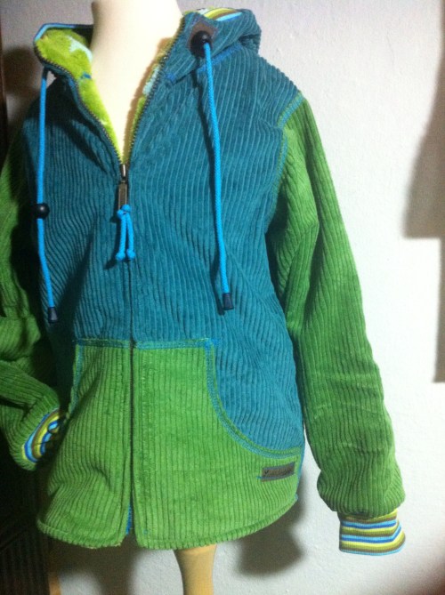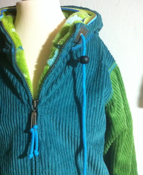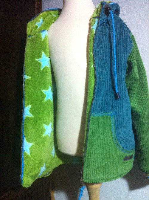 Verwendet habe ich außen Breitcord in Moosgrün und Petrol und innen einen grünblauen Sterne-Wellness-Fleece. Gefüttert habe ich das ganze mit einer Klimamembran, die Wind und Wetter besser abhält.