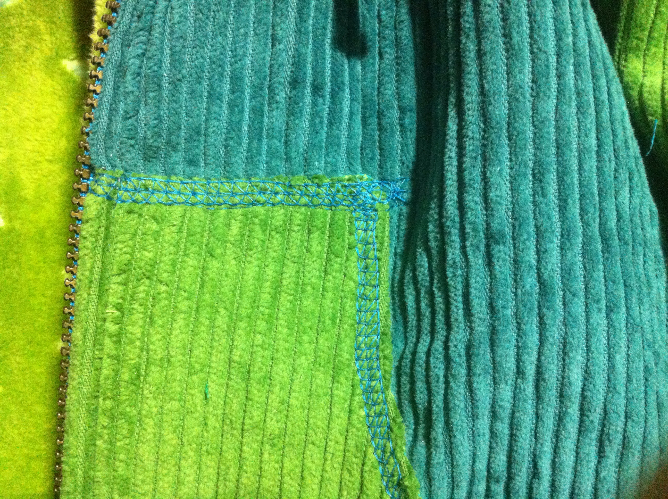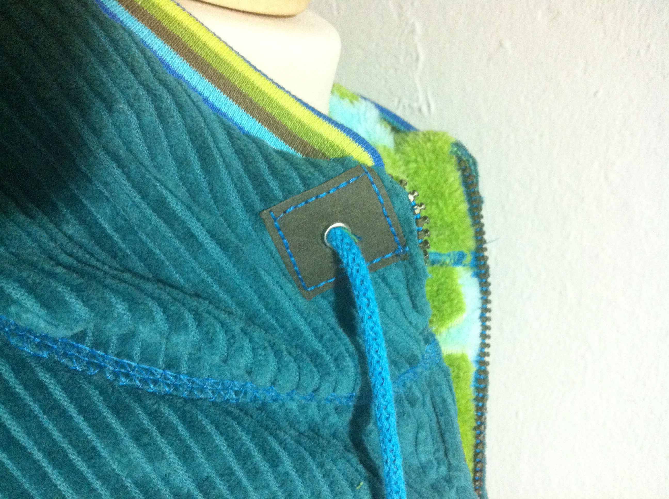 Verwendet habe ich außen Breitcord in Moosgrün und Petrol und innen einen grünblauen Sterne-Wellness-Fleece. Gefüttert habe ich das ganze mit einer Klimamembran, die Wind und Wetter besser abhält.
