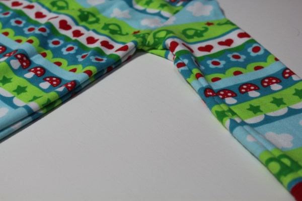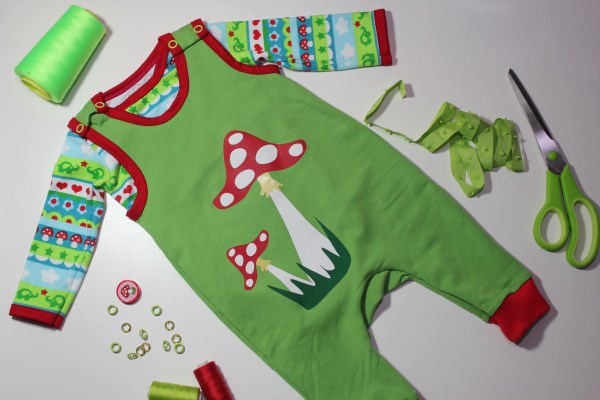 Body alleine ist natürlich etwas nackig an den Beinen. Deswegen gibt es noch eine Strampelhose von Klimperklein, genäht aus dünnem Sweat eingefasst mit Jersey und mit einer Fliegenpilz-Applikation von Frl. Zwergenschön aufgepeppt.