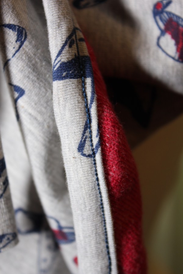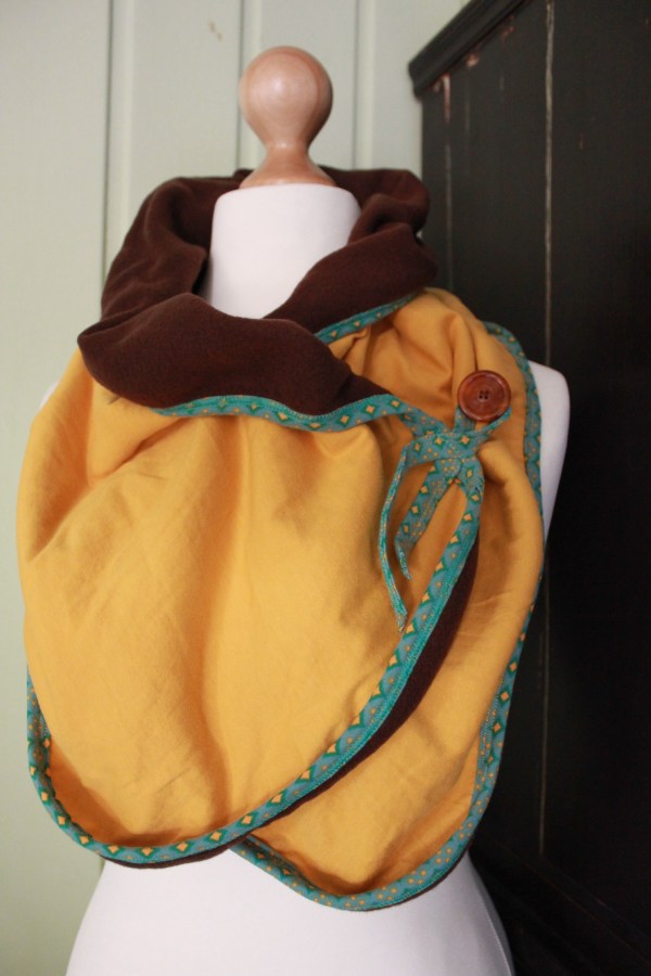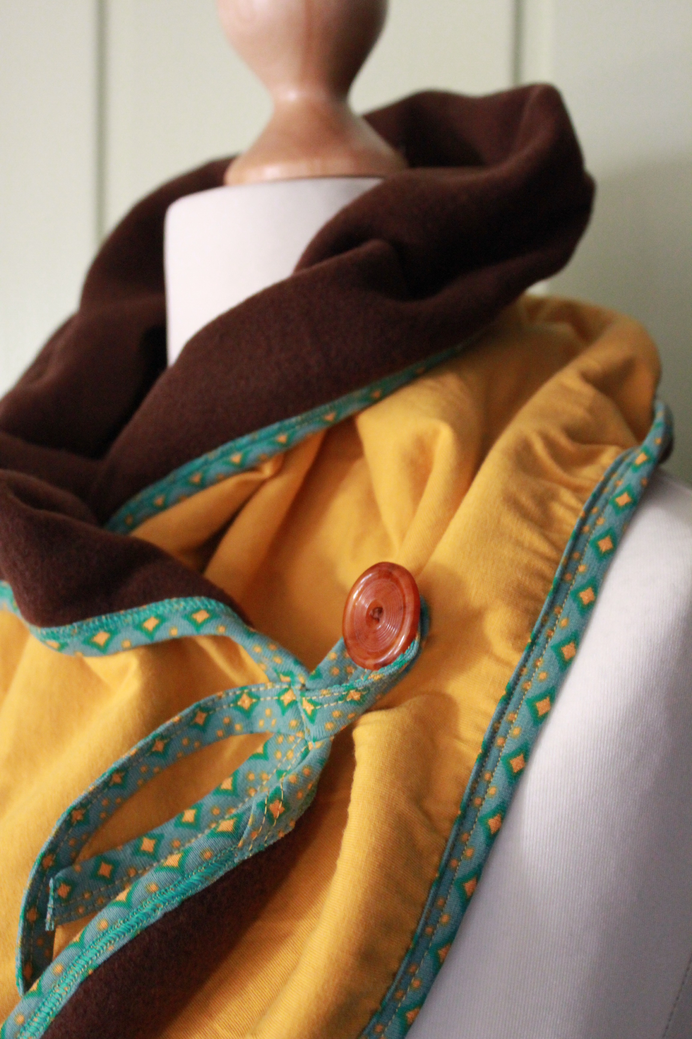 „Erdtöne“ wurden von der Wichtelpartnerin aus unsrer Mami-Gruppe gewünscht. Senfgelben Sanetta-Jersey kombiniert mit einem braunen Baumwollfleece (Michas Stoffecke) habe ich mit einem mintgrünbuntem Jersey mit dem Bandeinfasser an der Cover eingefasst. Das ging ruckizucki und sieht nicht nur gut aus, sondern behält auch noch schön die Form. Ich hoffe, ihr gefällts.