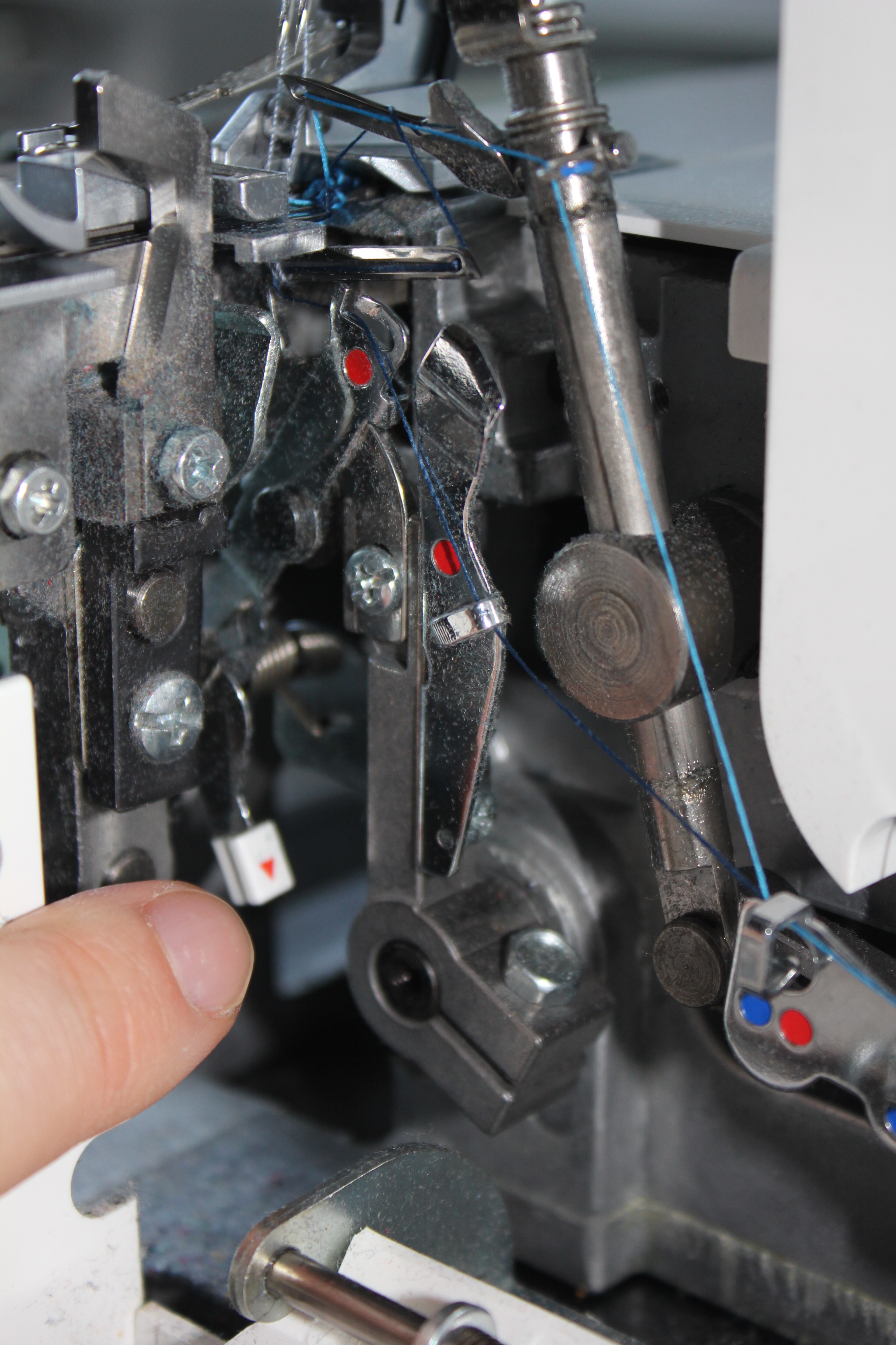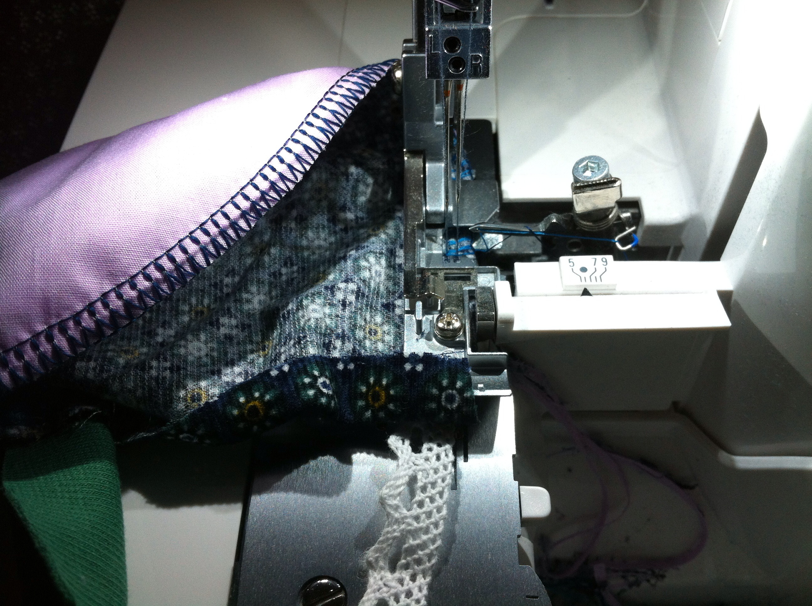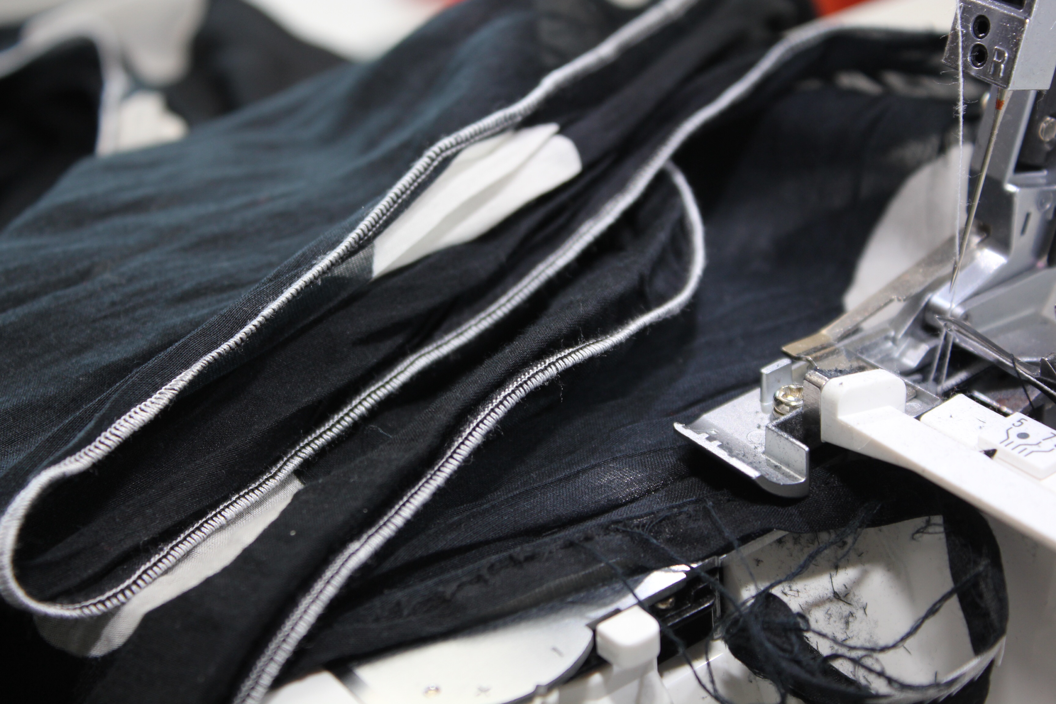 Nun gings Einfädeln. Die Maschine kommt vorgefädelt an, damit man beim ersten Mal anknoten kann. Die ersten Näh-Versuche misslangen, weil sich irgendwas verheddert hatte. Also habe ich alles rausgezogen und neu eingefädelt. Ja, es ist eine Overlock und nein, das macht keinen Spaß. Aber ich muss wirklich sagen: während man bei der W6 sich die Finger brechen musste um den rechten Greifer einzufädeln, gibts bei der Bernina L460 einen kleinen Hebel, die sogenante Untergreifer-Einfädelhilfe, den man nach vorn klappen kann, um leichter an die vorletze Öse zu gelangen.