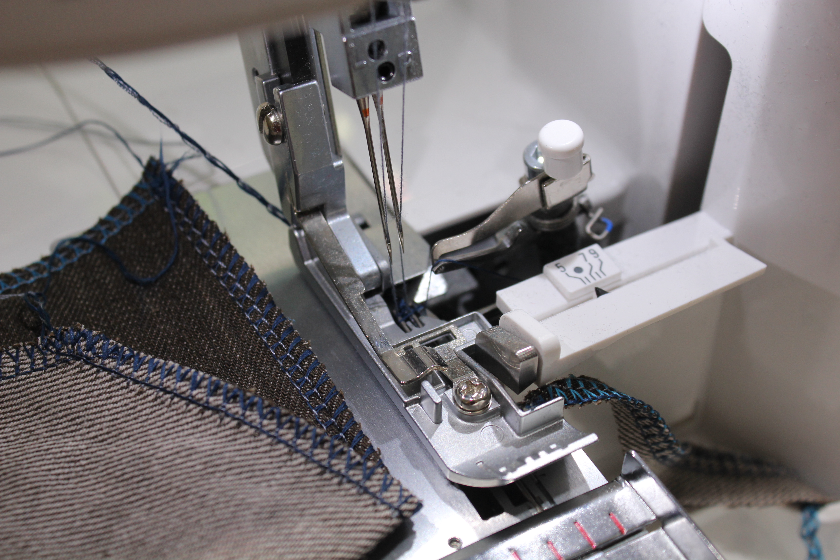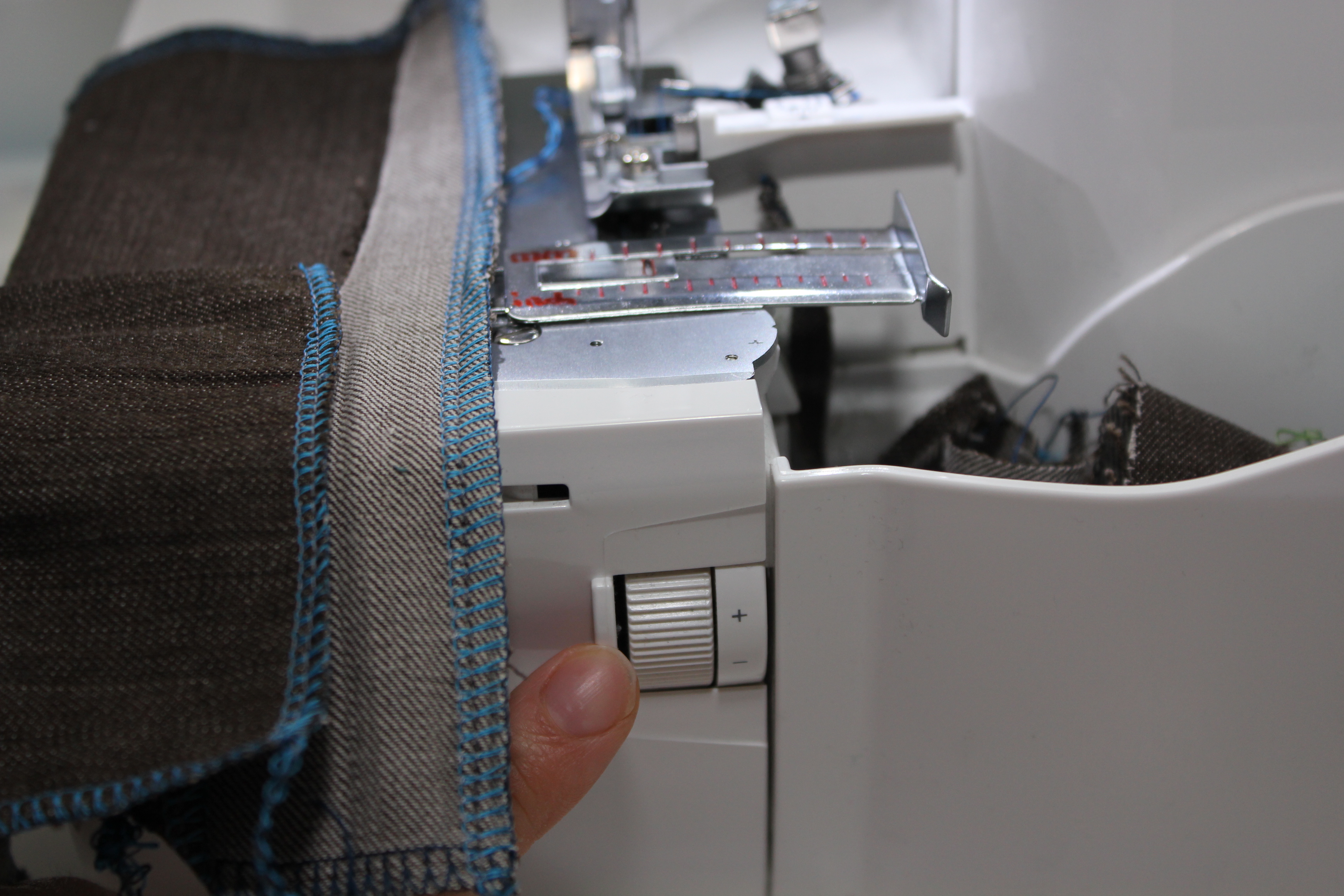 An der Frontseite befindet sich ein Drehrad, mit dem man das Messer und damit die Schnittbreite zwischen 3 und 9 mm während des Nähens verändern kann. Empfohlen wird eine Breite von 6mm (siehe kleines schwarzes Dreieck). Die Stichlänge kann zwischen zwischen 0,8 und 4 mm variiert werden.